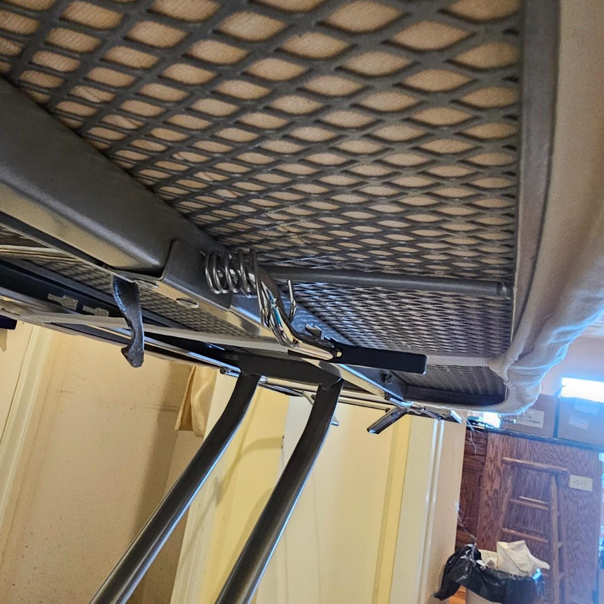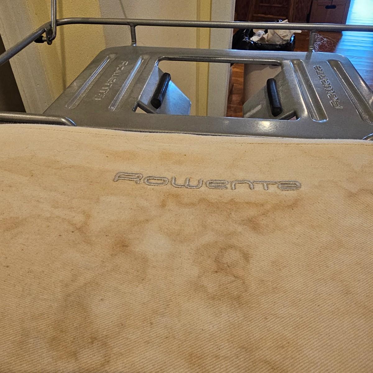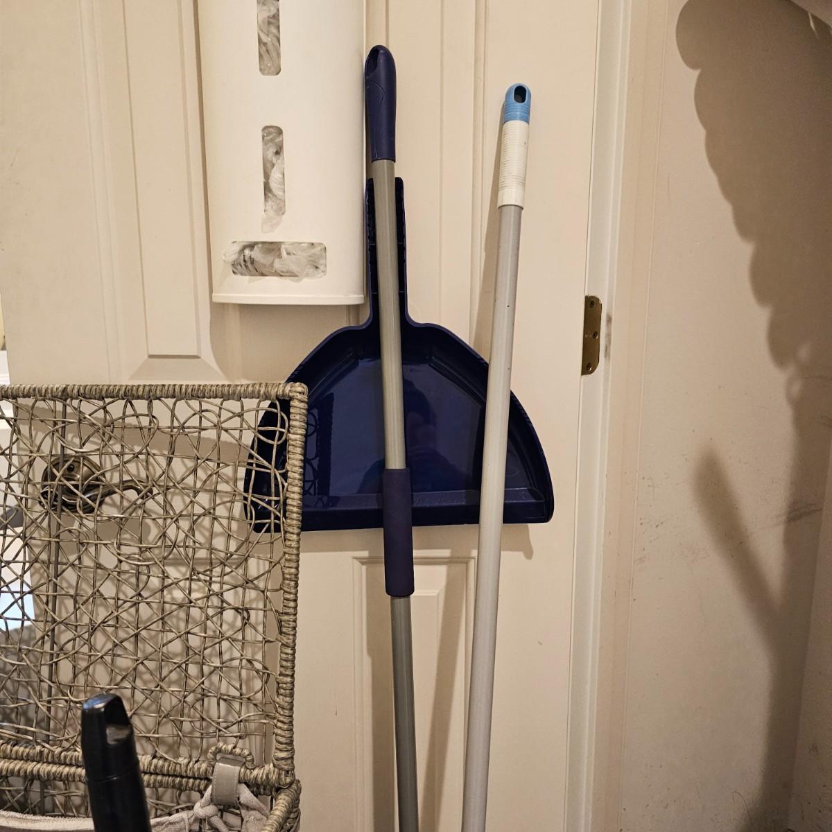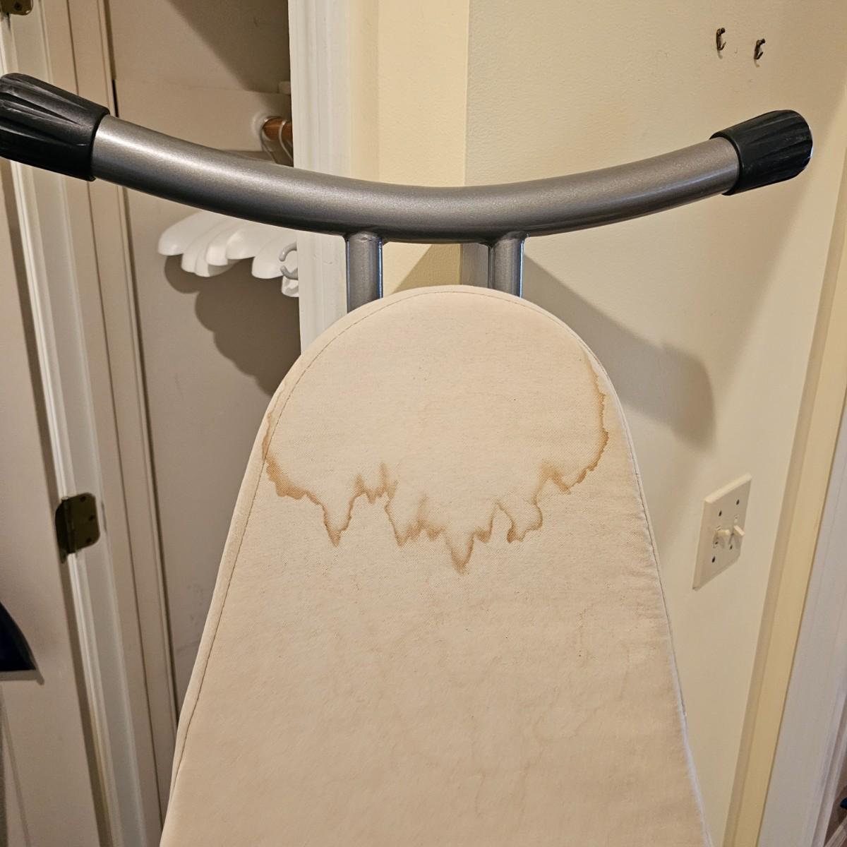 Cleaners, brooms, laundry hamper, ironing board, more. Bottles of shower clean spray, Lysol, Swiffer dusters, broom/dustpan combo. Laundry hamper is 20" x 15" x 27"H, has flip lid. Rowenta ironing board is 19" x 65" x up to 38"H. Cover spotted. Includes assorted hangers and two plastic step stools. See photos for details. Local pickup only.