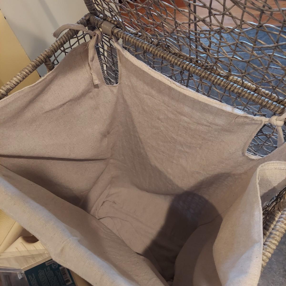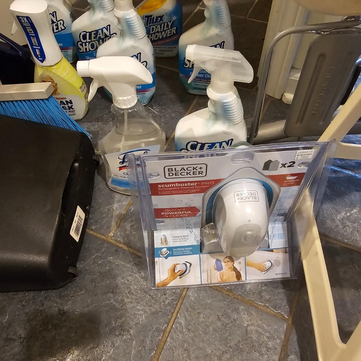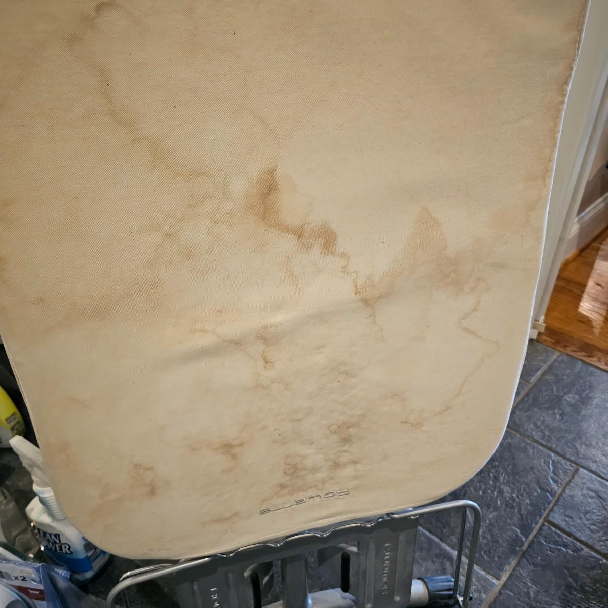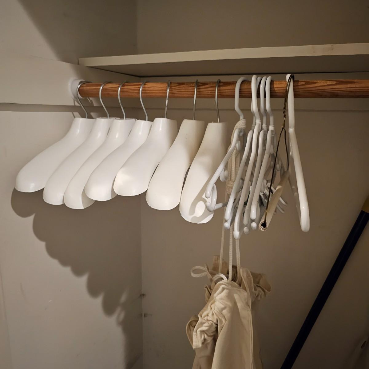 Cleaners, brooms, laundry hamper, ironing board, more. Bottles of shower clean spray, Lysol, Swiffer dusters, broom/dustpan combo. Laundry hamper is 20" x 15" x 27"H, has flip lid. Rowenta ironing board is 19" x 65" x up to 38"H. Cover spotted. Includes assorted hangers and two plastic step stools. See photos for details. Local pickup only.