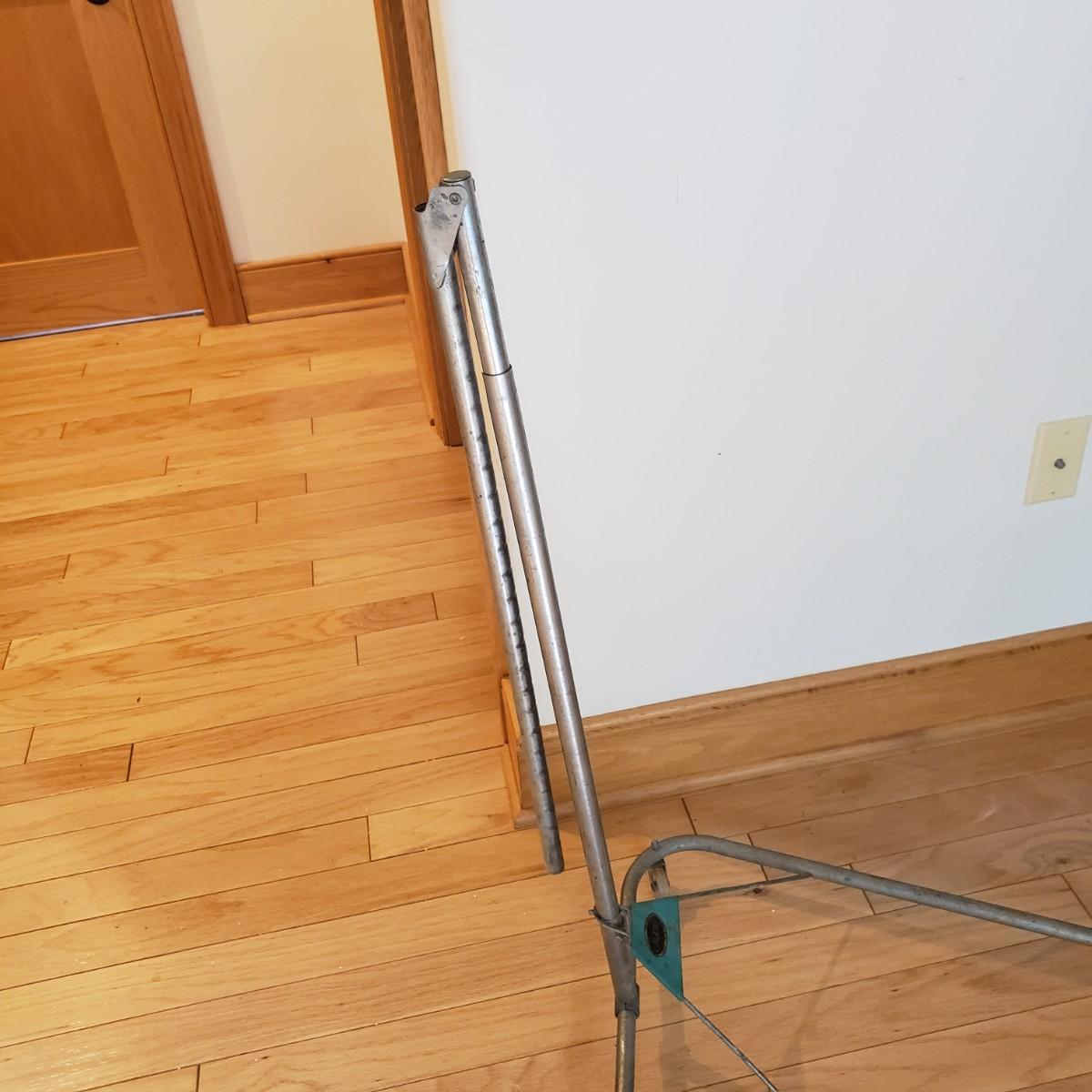 This laundry essentials lot contains a metal, folding drying rack measuring 30" x 19" x 36"H, a vintage Cal-Dak folding drying rack on wheels, mesh laundry zipper bags, two irons, see pictures and a Seymour ironing board with a Sunbeam iron mat on it. The plastic white mesh sweater drier measures 28" x 28" x 6"H.