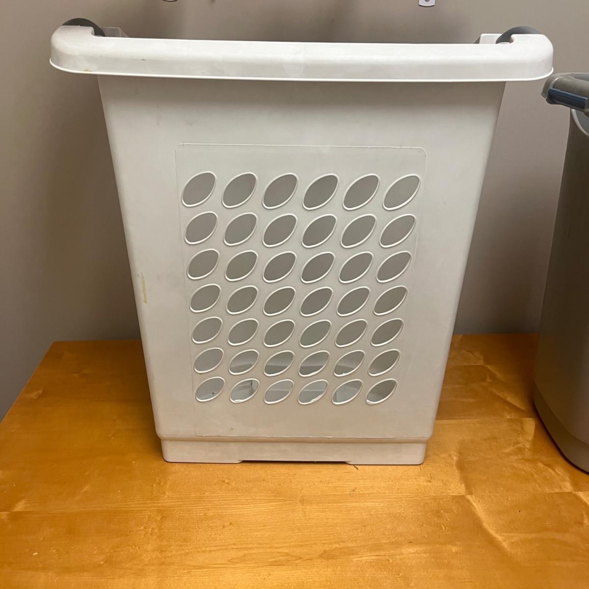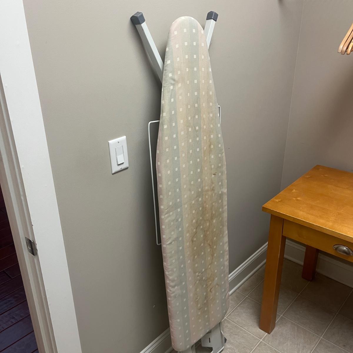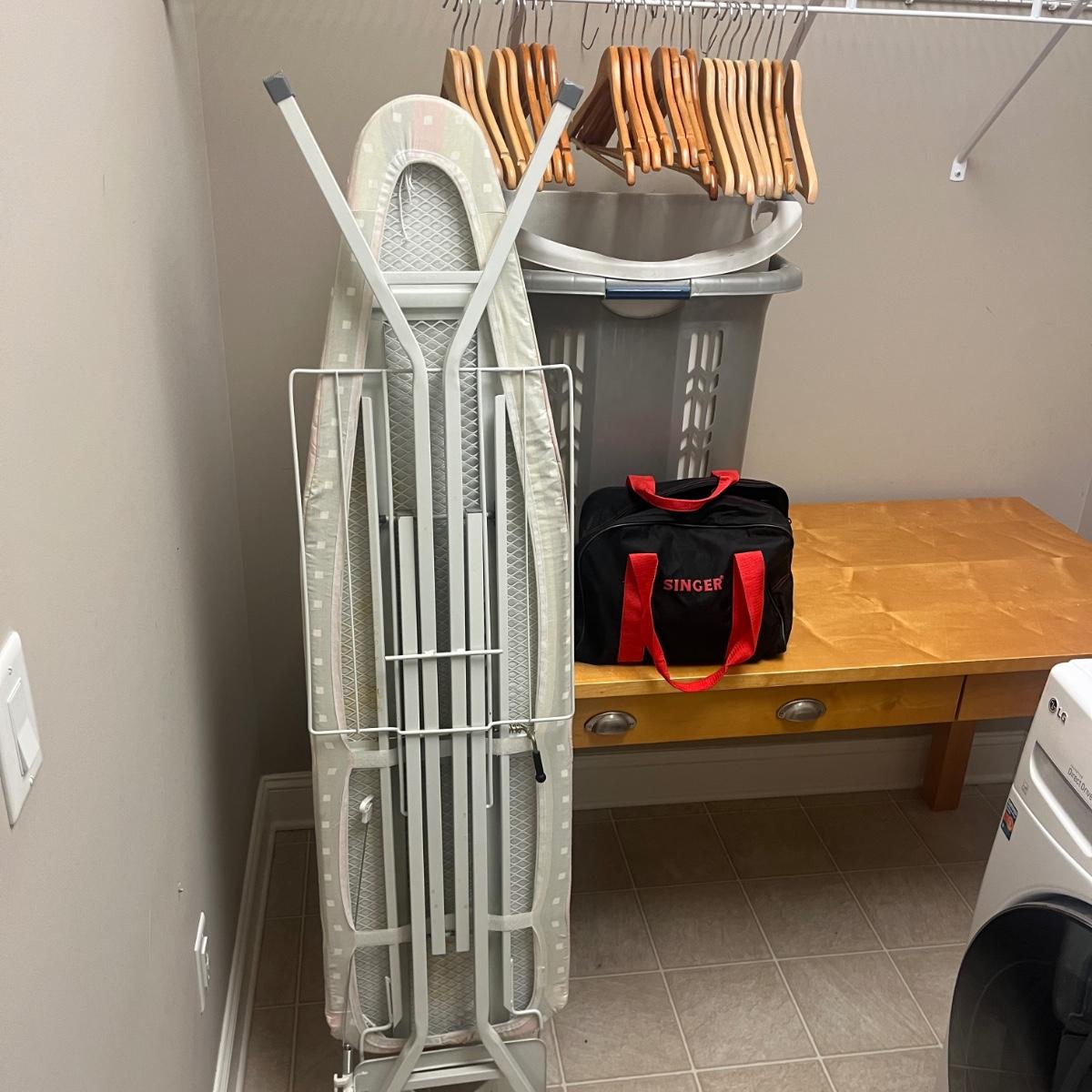 Lot includes a metal ironing board, over 20 wooden hangers, Singer steamer and two laundry baskets. Largest basket measures 21” x 14” x 24”H and has one crack, see pictures. Desk not included but is available in auction. Steamer powered on when plugged in.