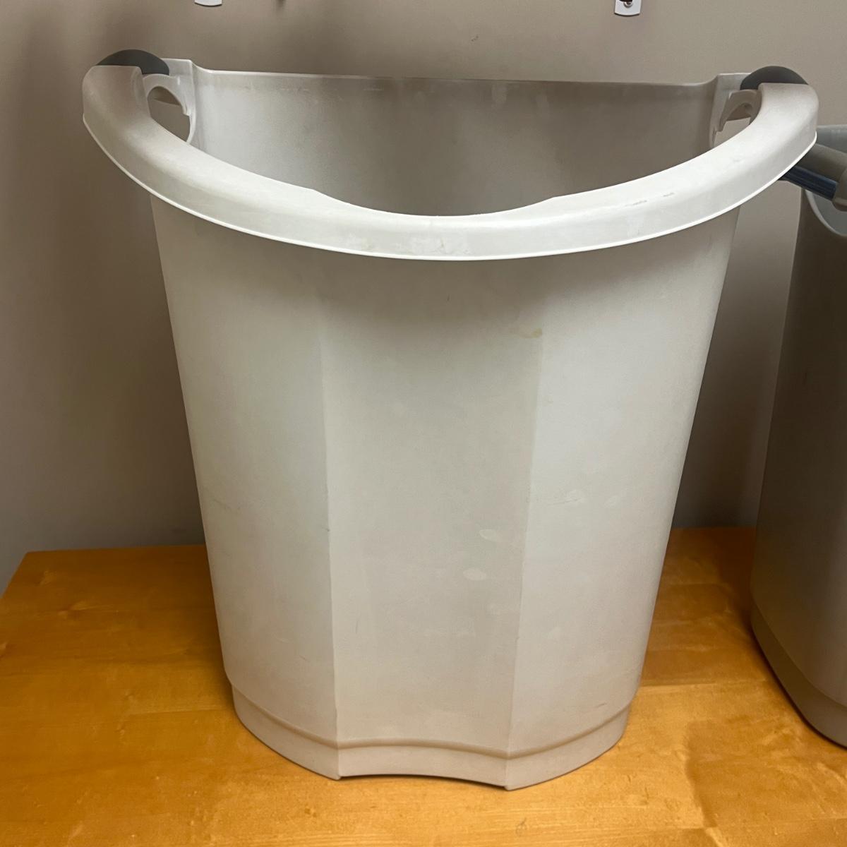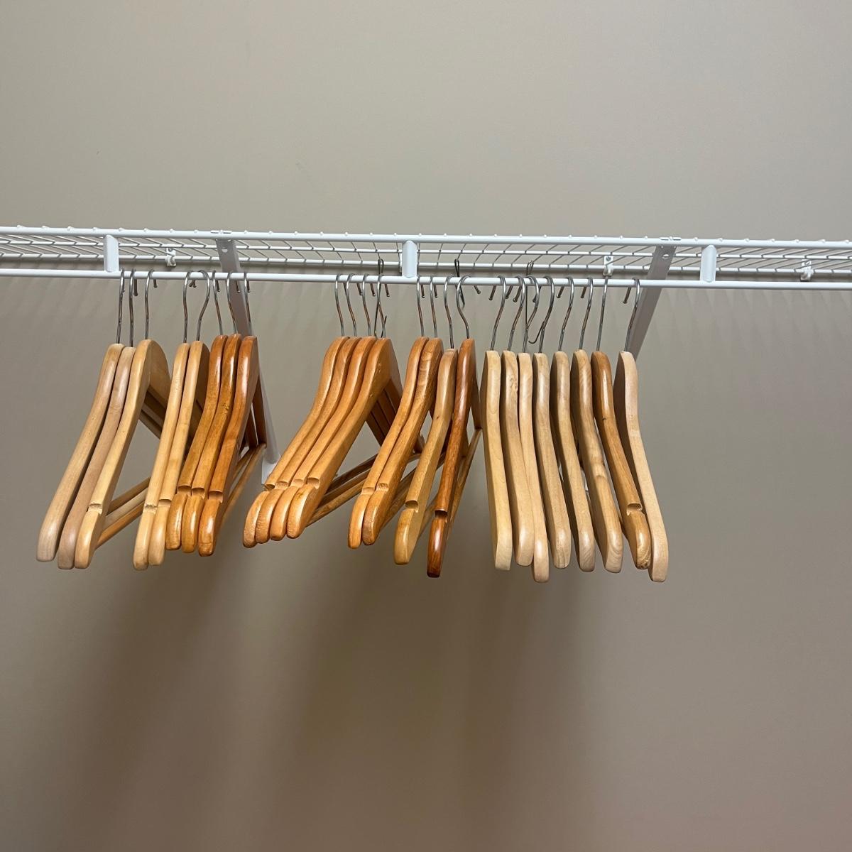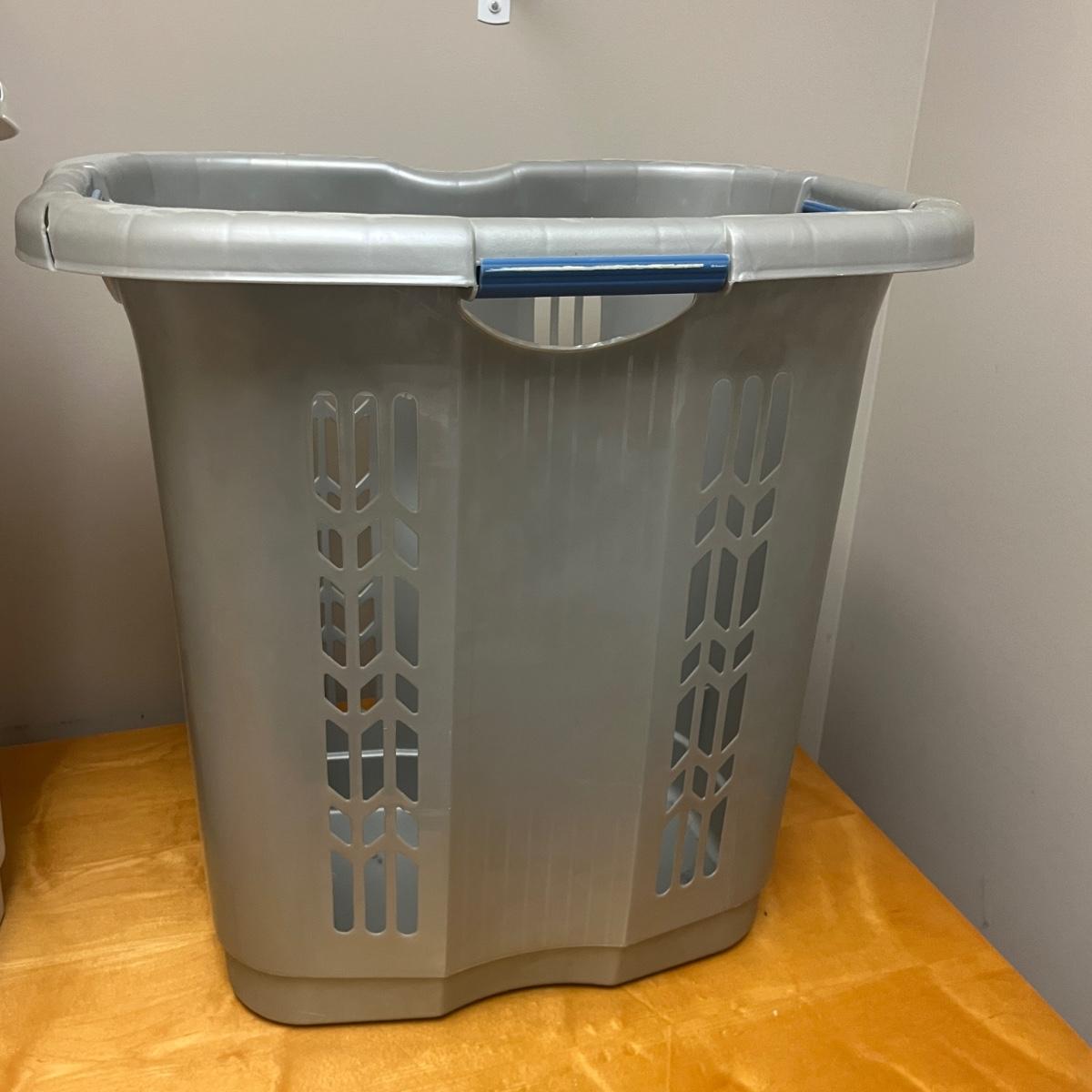 Lot includes a metal ironing board, over 20 wooden hangers, Singer steamer and two laundry baskets. Largest basket measures 21” x 14” x 24”H and has one crack, see pictures. Desk not included but is available in auction. Steamer powered on when plugged in.
