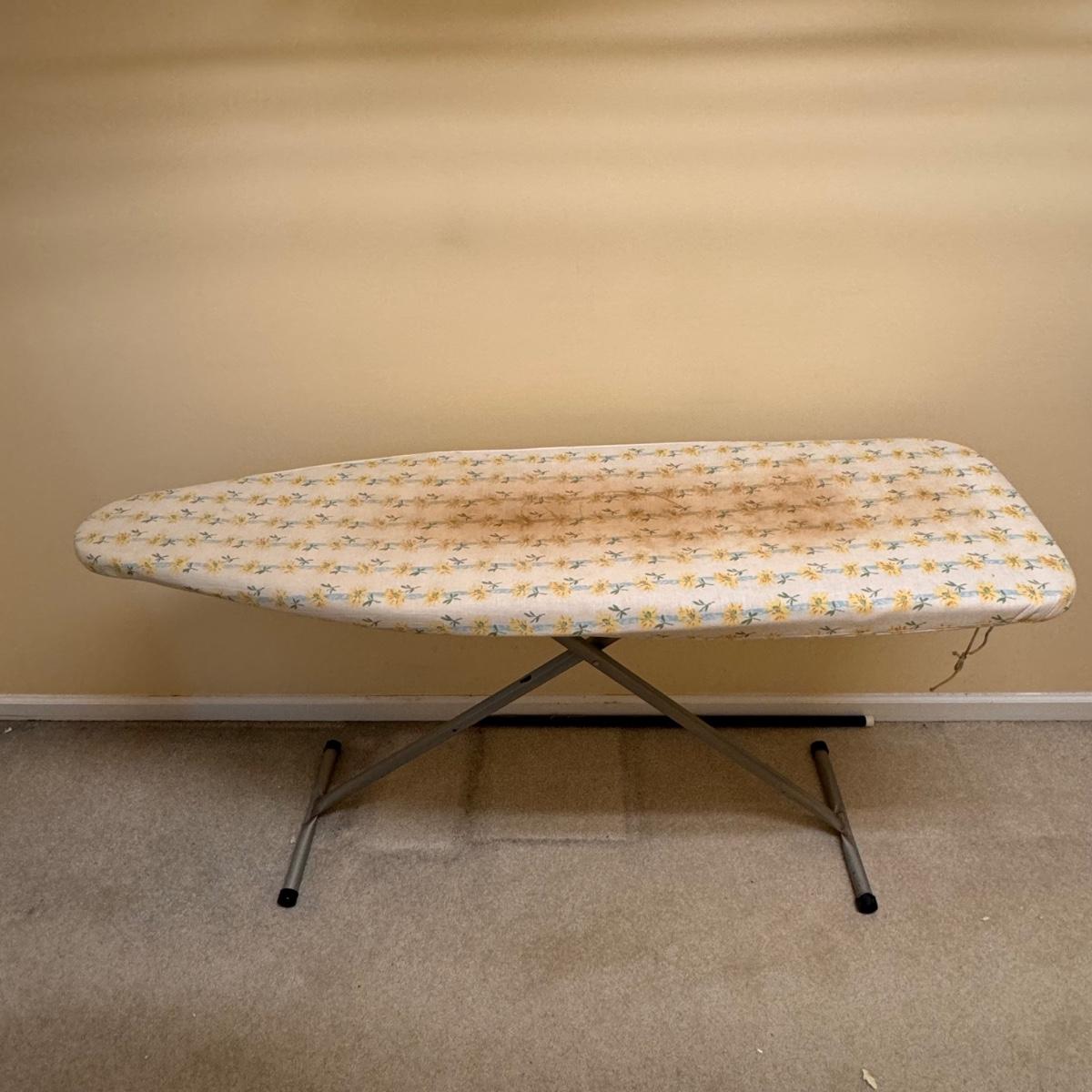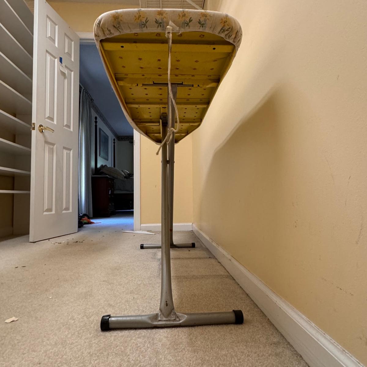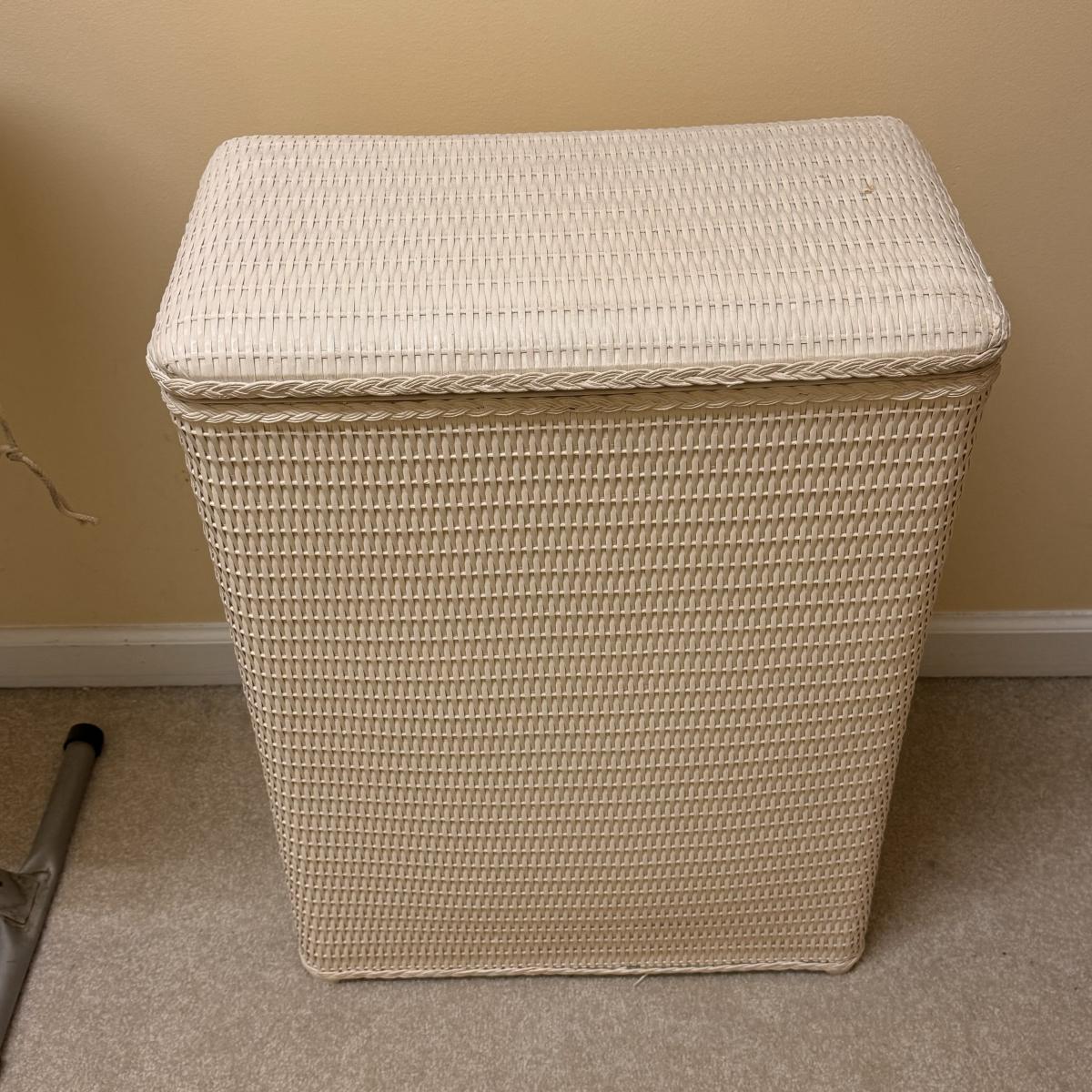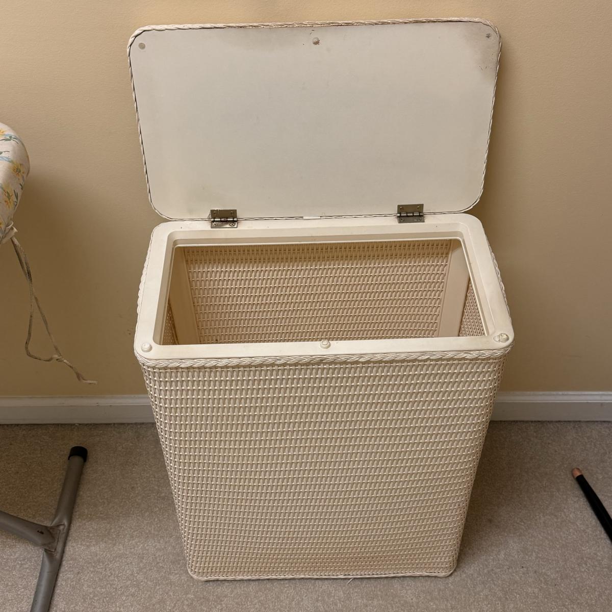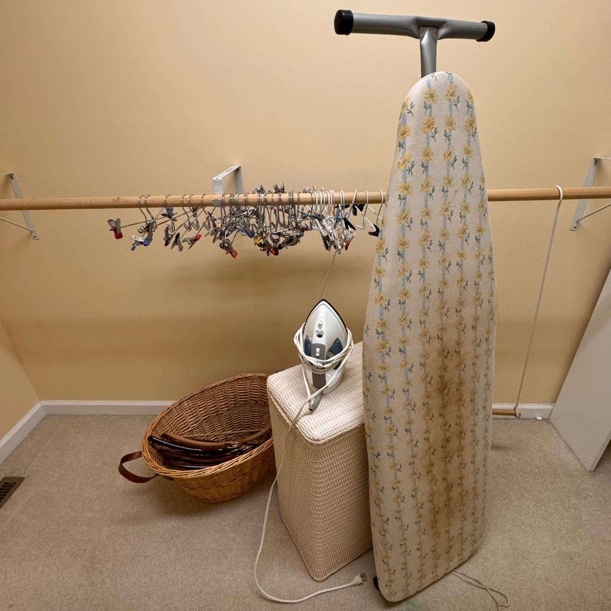 This lot includes seven wooden hangers, one woven basket with leather handles, one white woven basket with attached lid, over twenty metal hangers, one handheld iron that plugs in, and one ironing board with a removable cloth cover. The larger woven hamper measures 19” x 11” x 26”H. The handheld iron powered on when plugged in. Local pickup only.