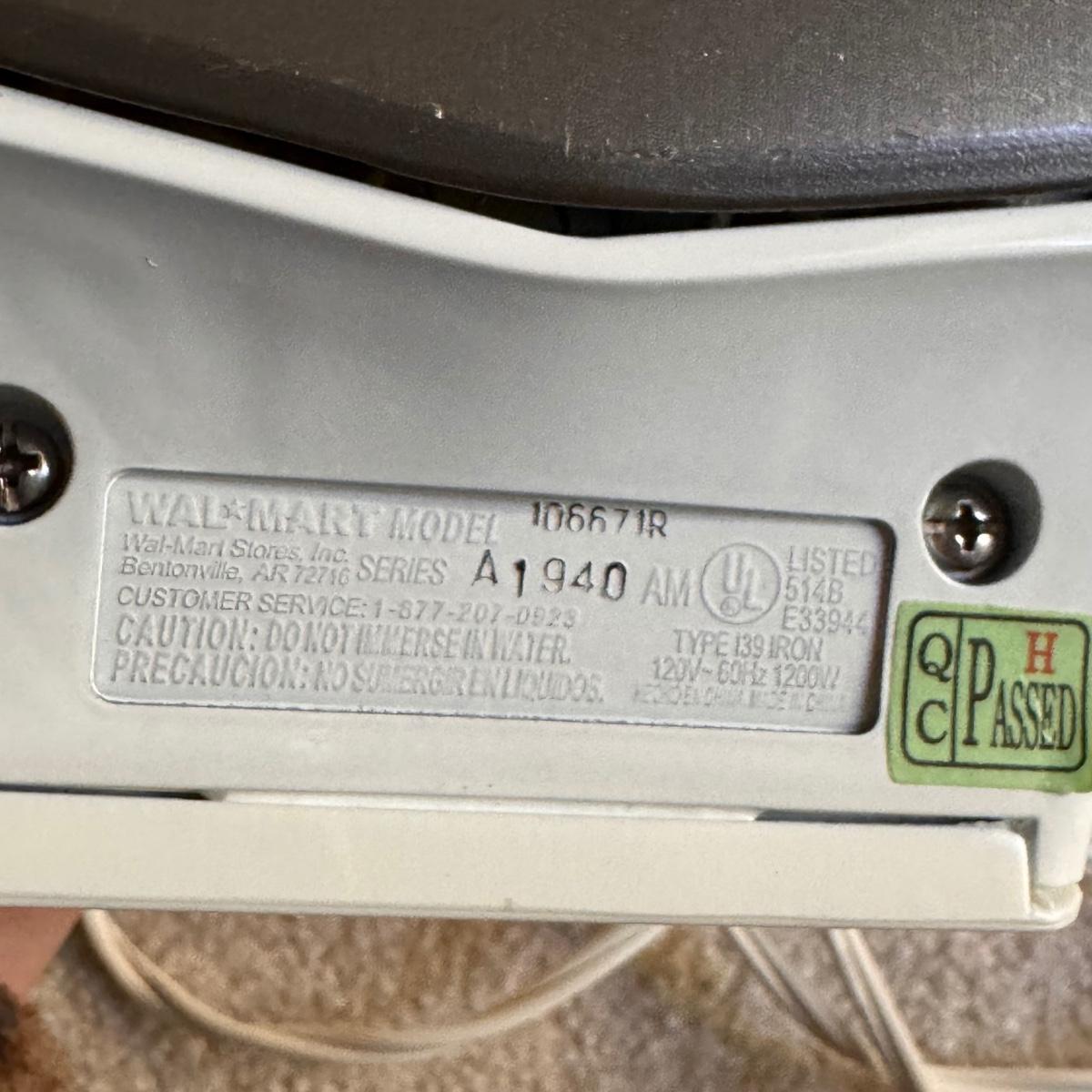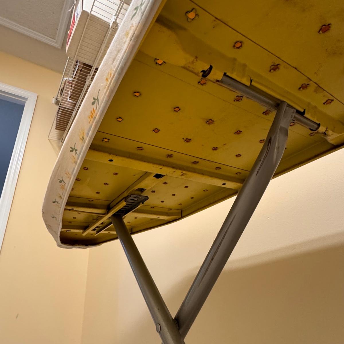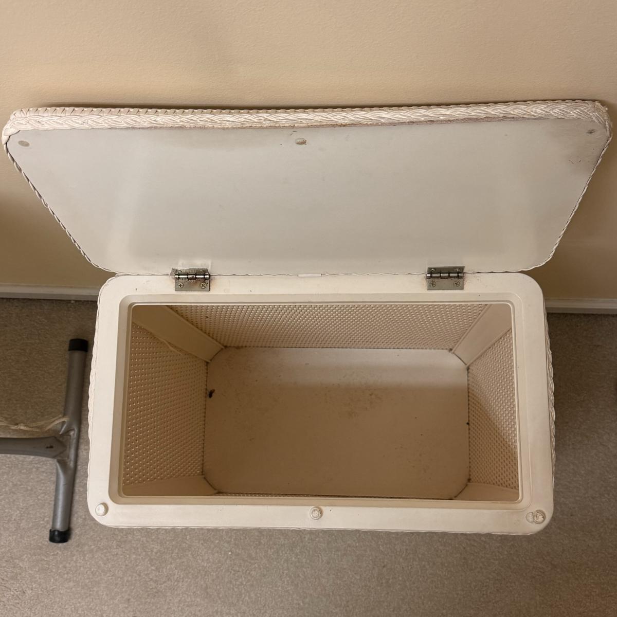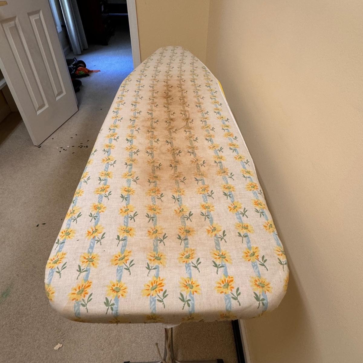 This lot includes seven wooden hangers, one woven basket with leather handles, one white woven basket with attached lid, over twenty metal hangers, one handheld iron that plugs in, and one ironing board with a removable cloth cover. The larger woven hamper measures 19” x 11” x 26”H. The handheld iron powered on when plugged in. Local pickup only.