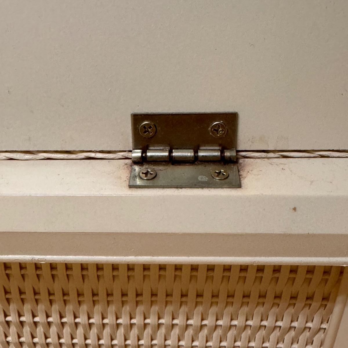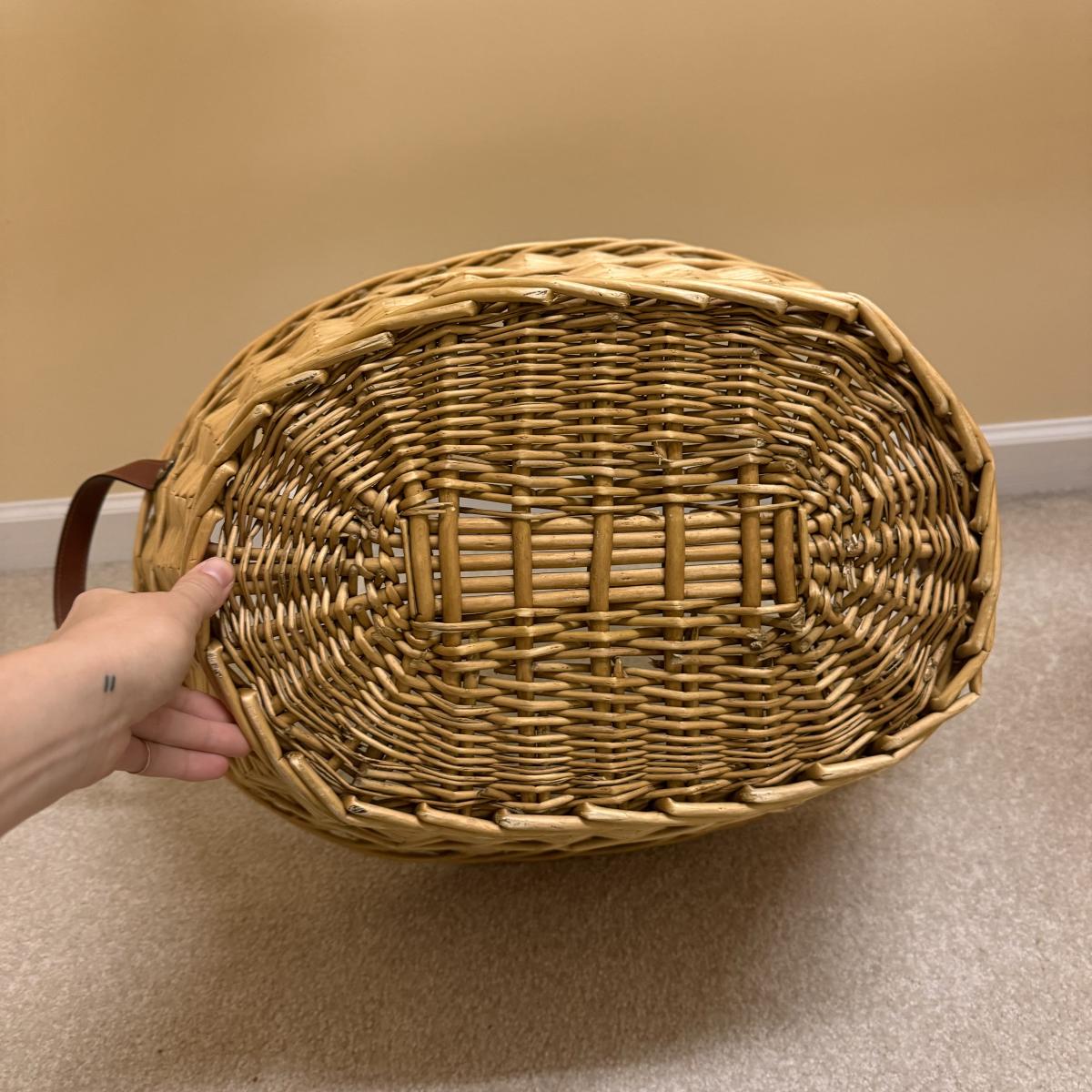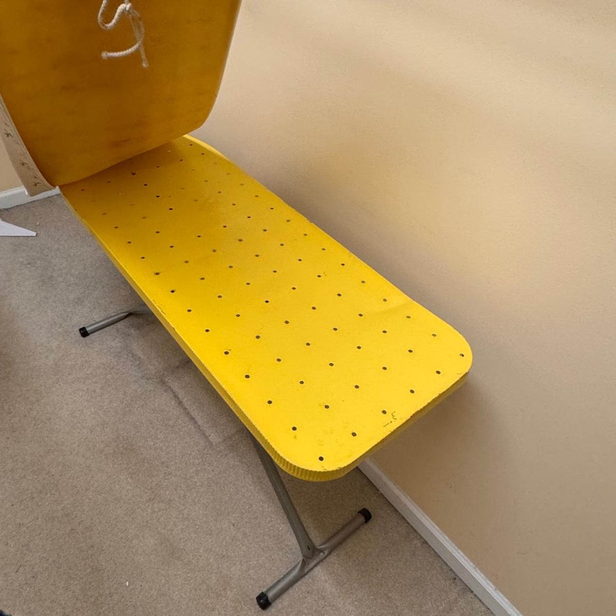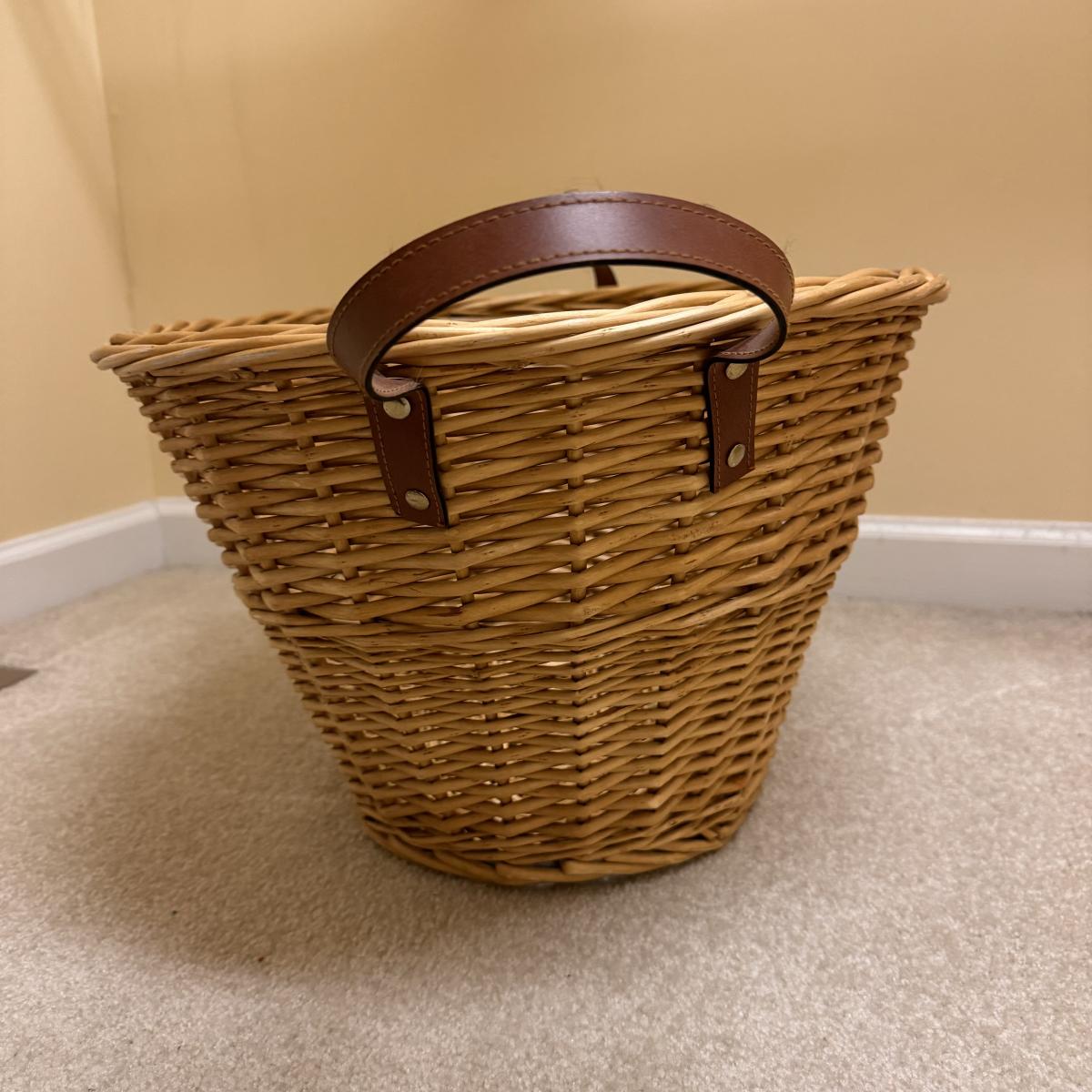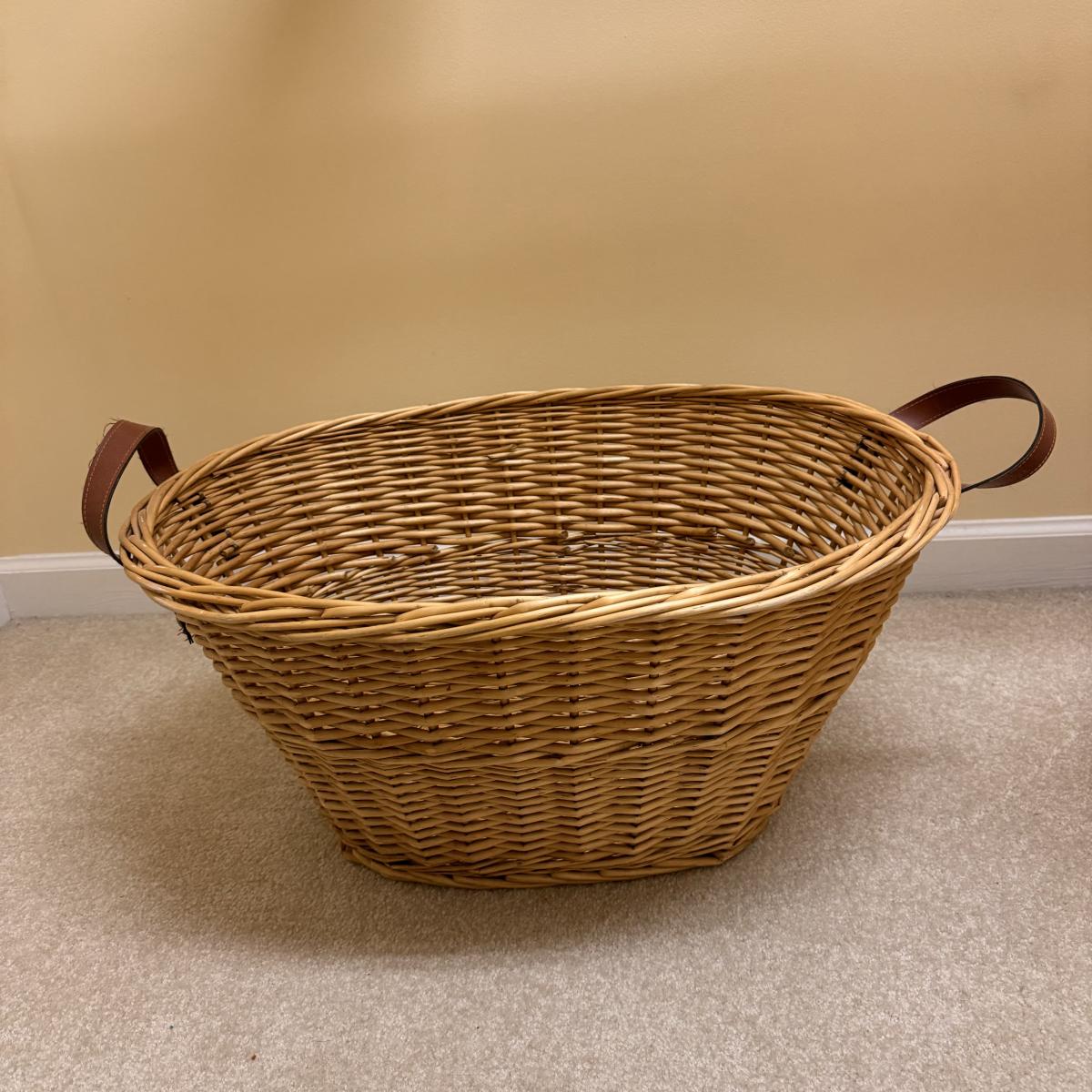 This lot includes seven wooden hangers, one woven basket with leather handles, one white woven basket with attached lid, over twenty metal hangers, one handheld iron that plugs in, and one ironing board with a removable cloth cover. The larger woven hamper measures 19” x 11” x 26”H. The handheld iron powered on when plugged in. Local pickup only.