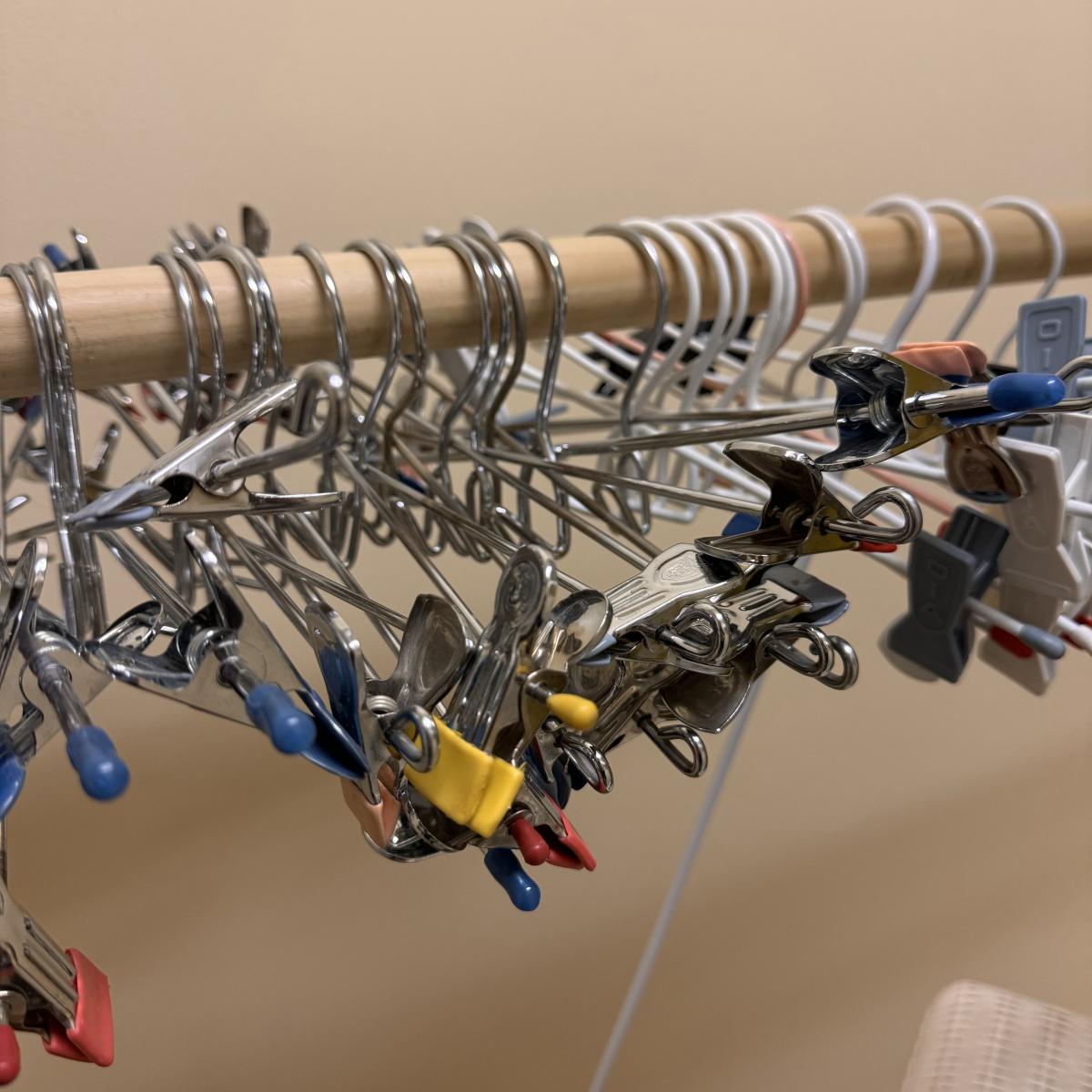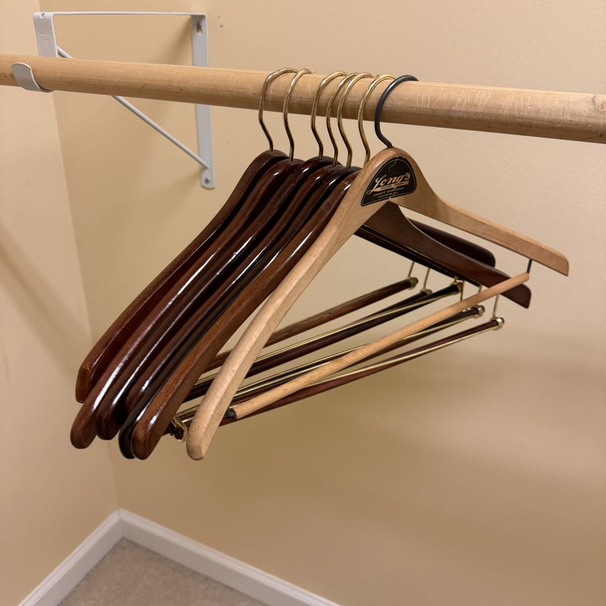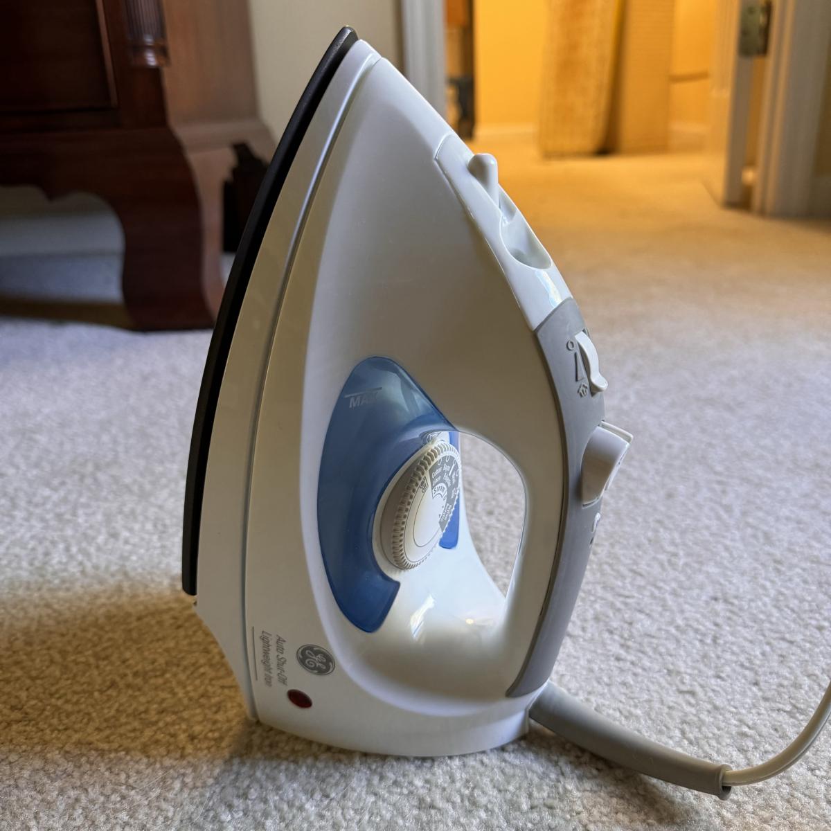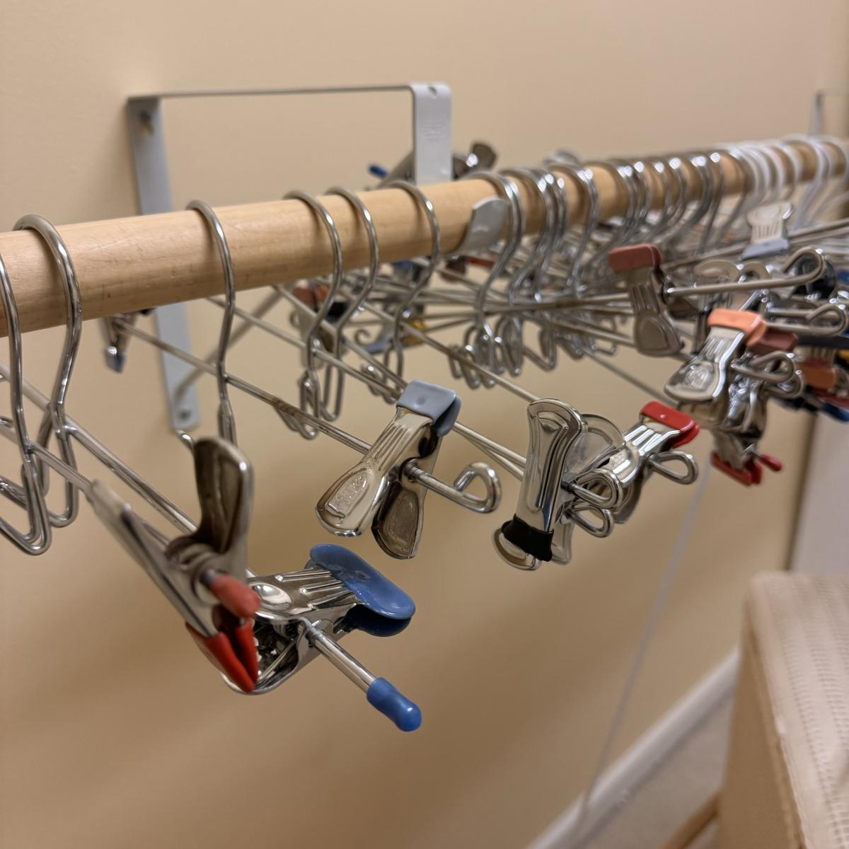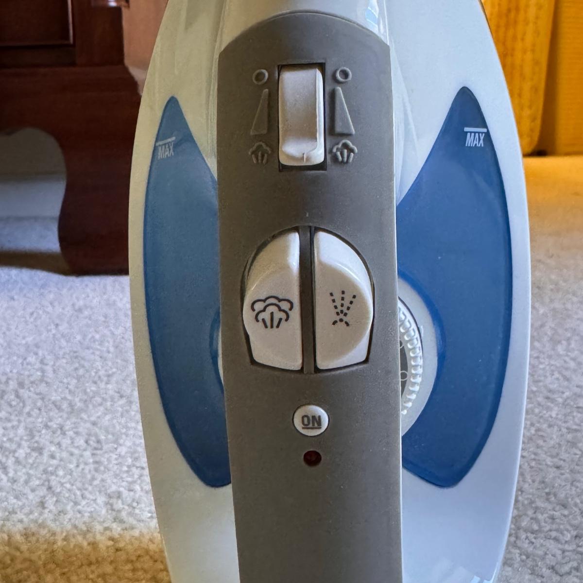 This lot includes seven wooden hangers, one woven basket with leather handles, one white woven basket with attached lid, over twenty metal hangers, one handheld iron that plugs in, and one ironing board with a removable cloth cover. The larger woven hamper measures 19” x 11” x 26”H. The handheld iron powered on when plugged in. Local pickup only.