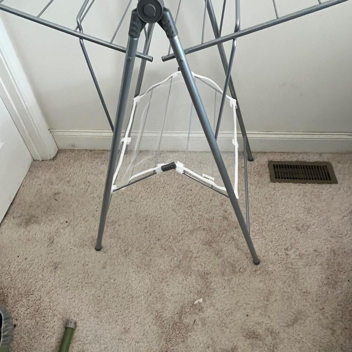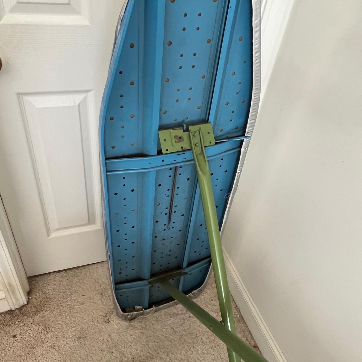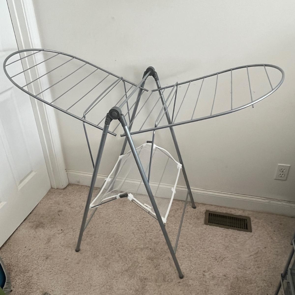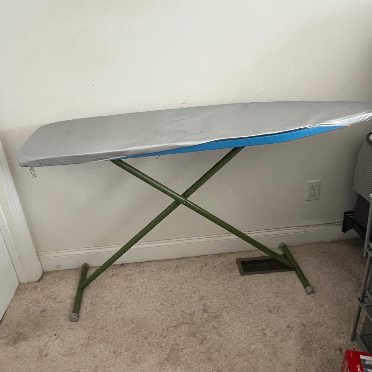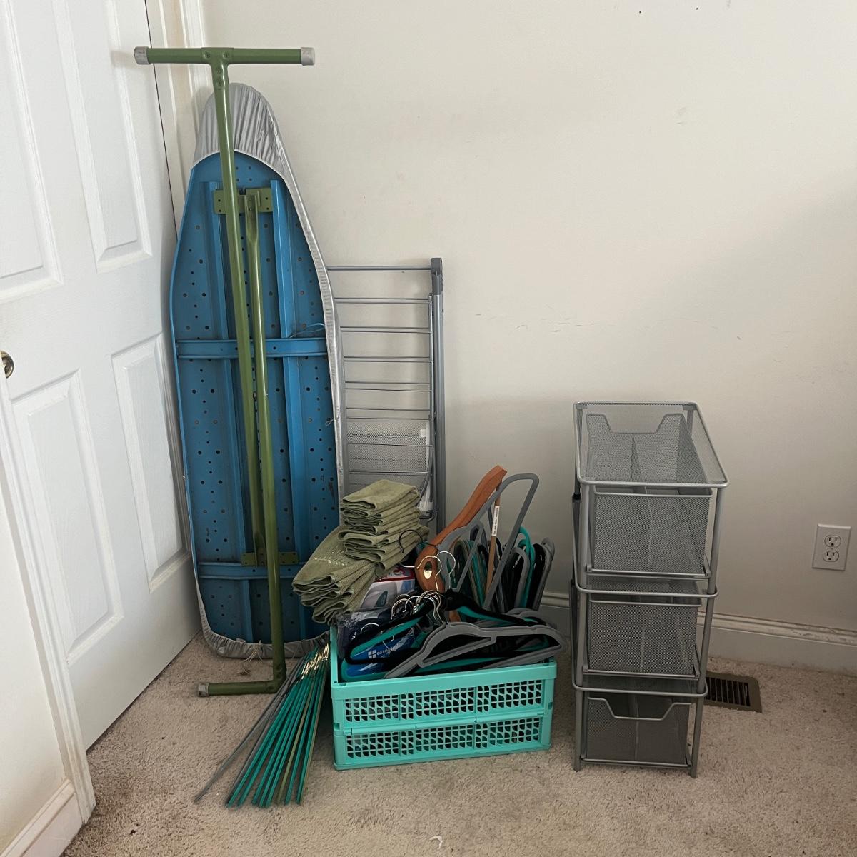 Lot includes metal ironing board with new cover, folding metal clothing air-dryer, a box of hangers, Sunbeam Iron, three hand towels with five matching washcloths and three stackable metal storage drawers with each one measuring 10.5” x 16” x 9.5”H.