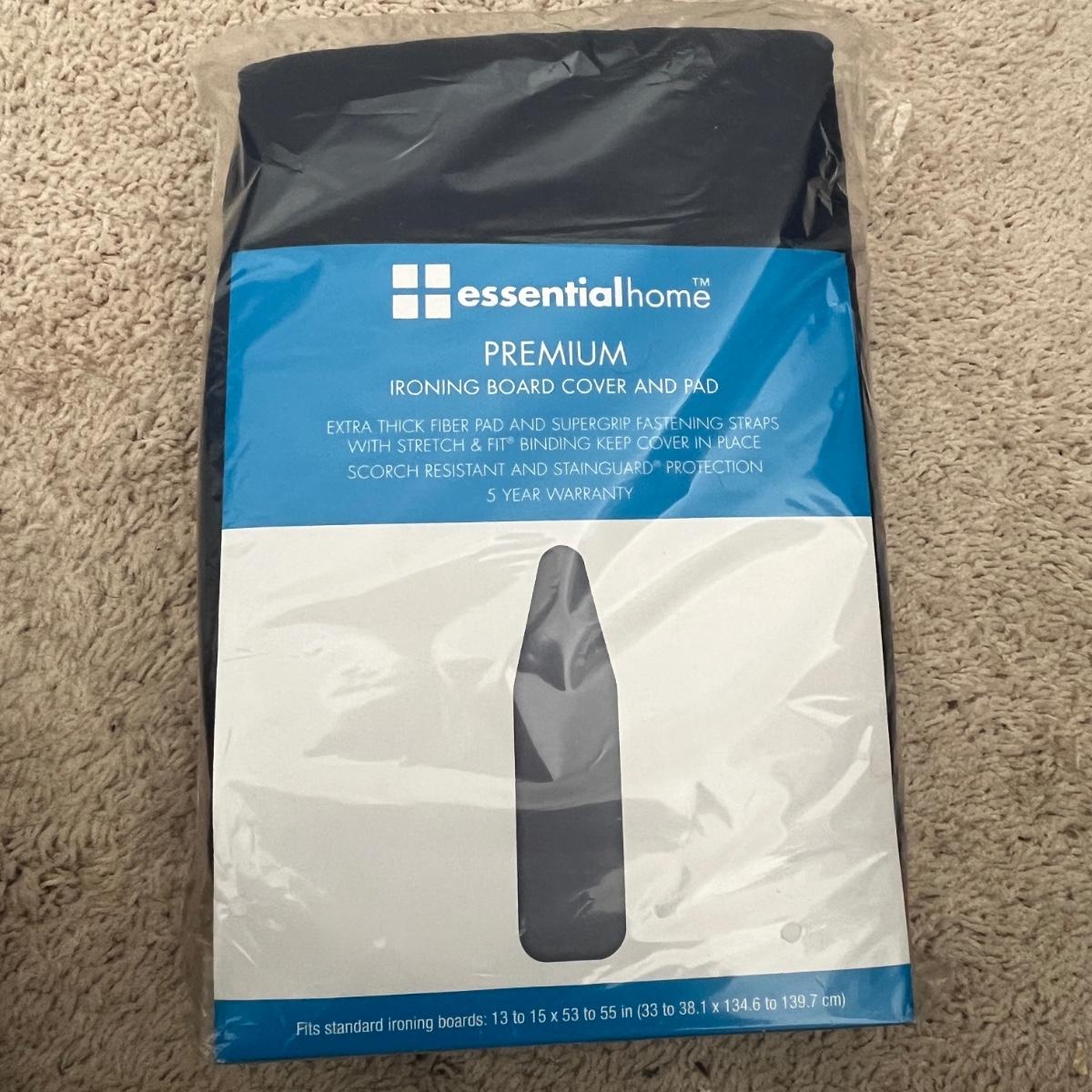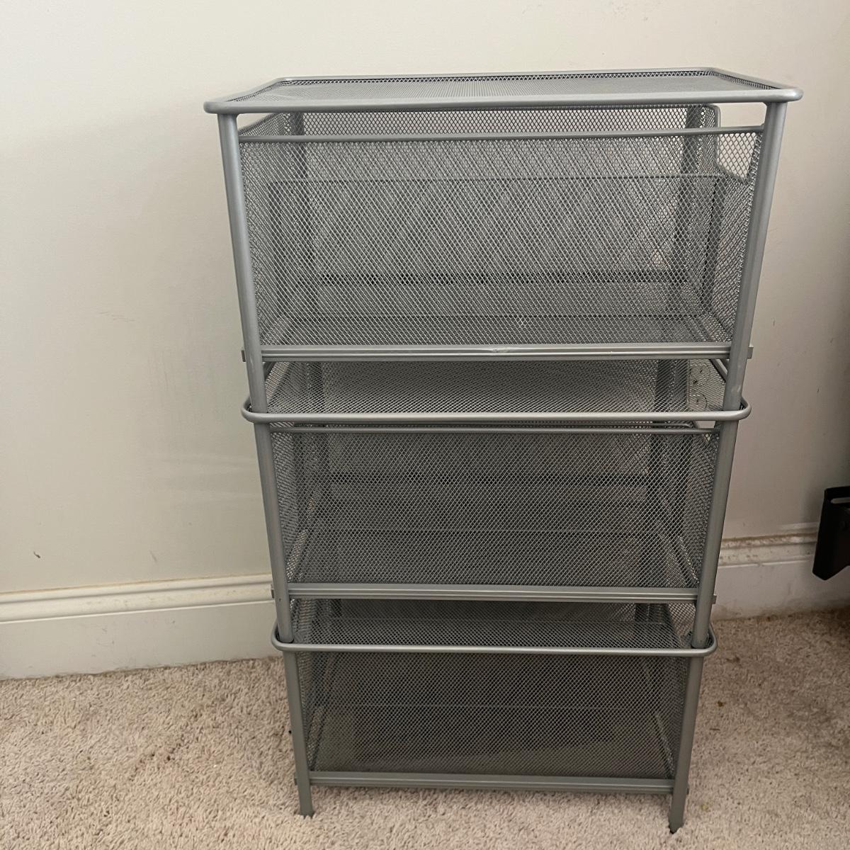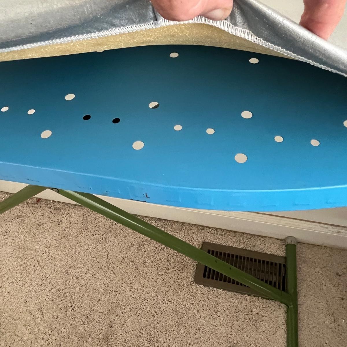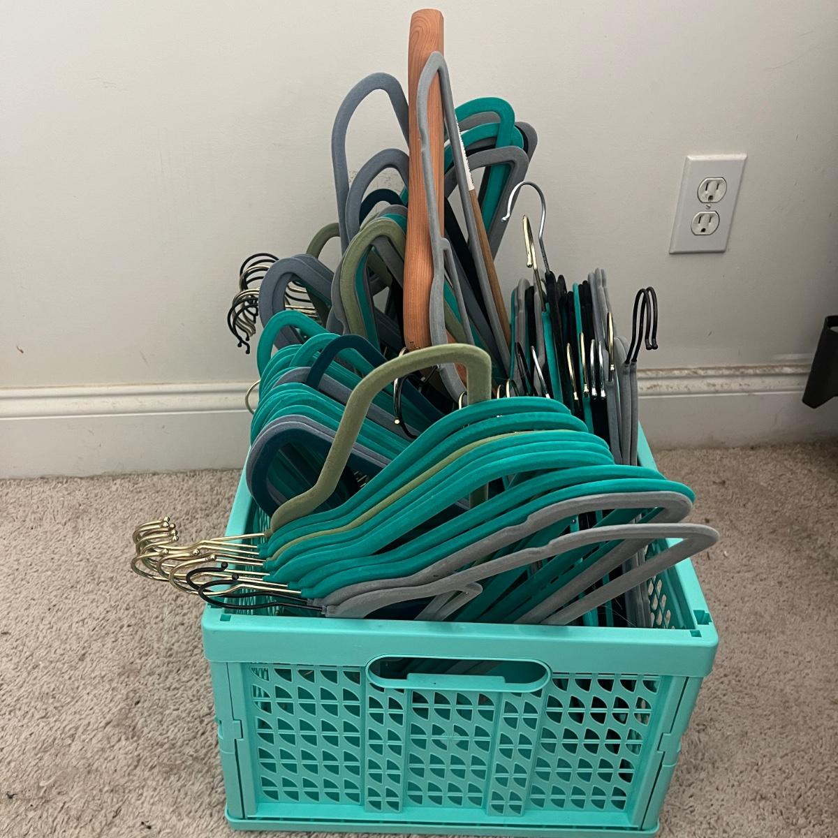 Lot includes metal ironing board with new cover, folding metal clothing air-dryer, a box of hangers, Sunbeam Iron, three hand towels with five matching washcloths and three stackable metal storage drawers with each one measuring 10.5” x 16” x 9.5”H.