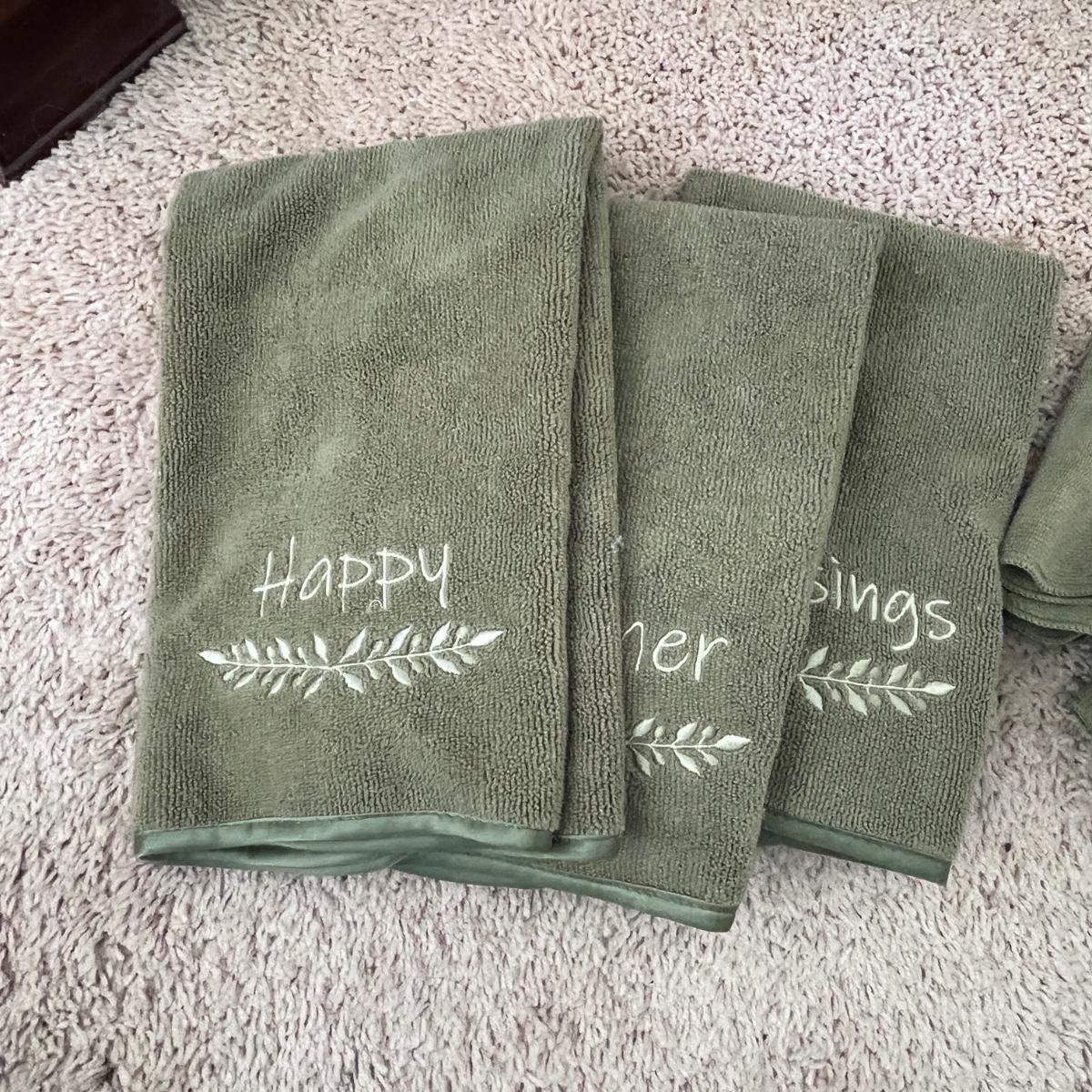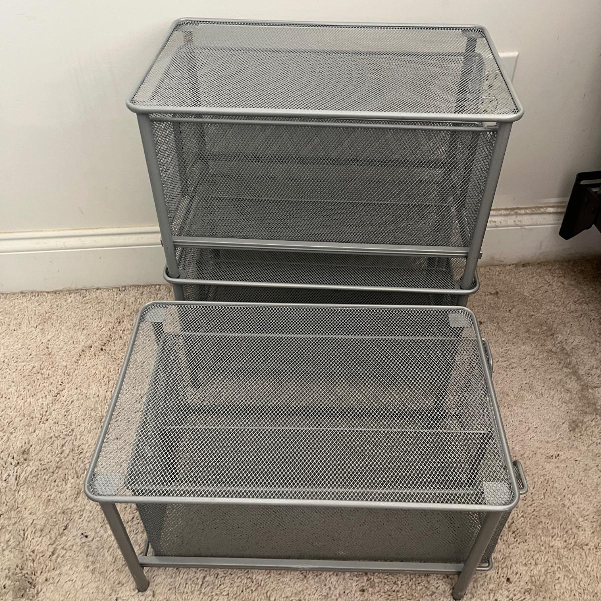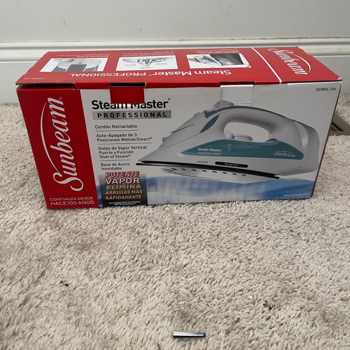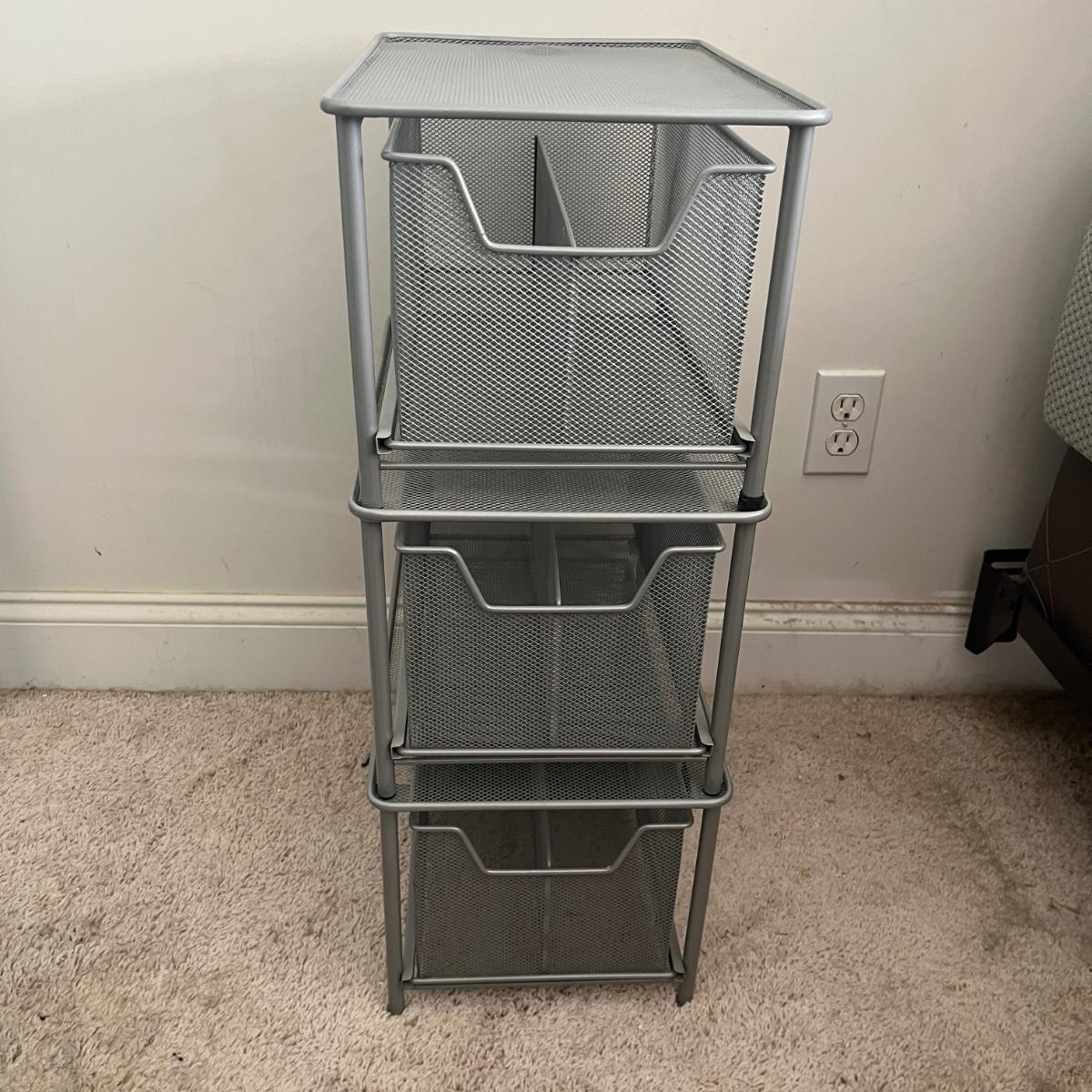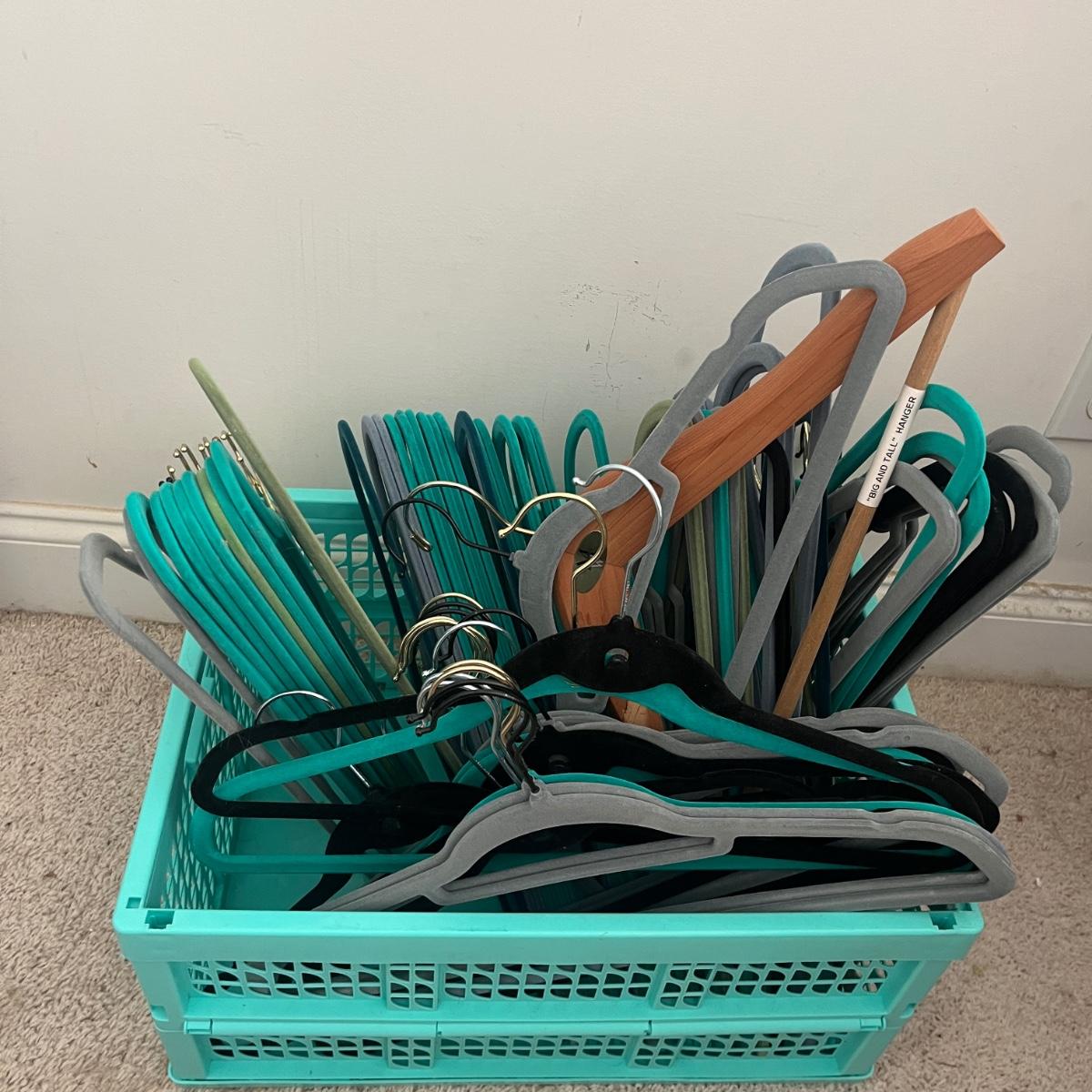 Lot includes metal ironing board with new cover, folding metal clothing air-dryer, a box of hangers, Sunbeam Iron, three hand towels with five matching washcloths and three stackable metal storage drawers with each one measuring 10.5” x 16” x 9.5”H.