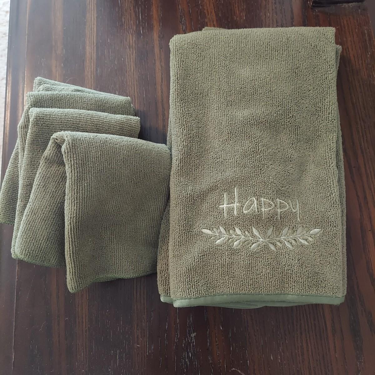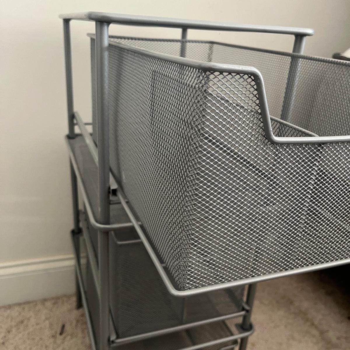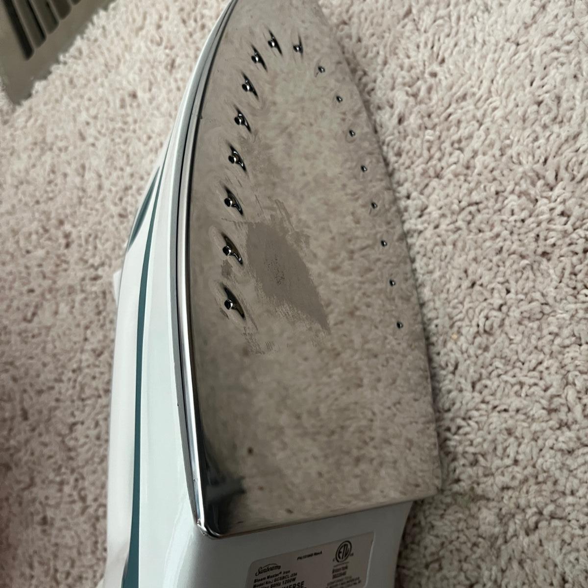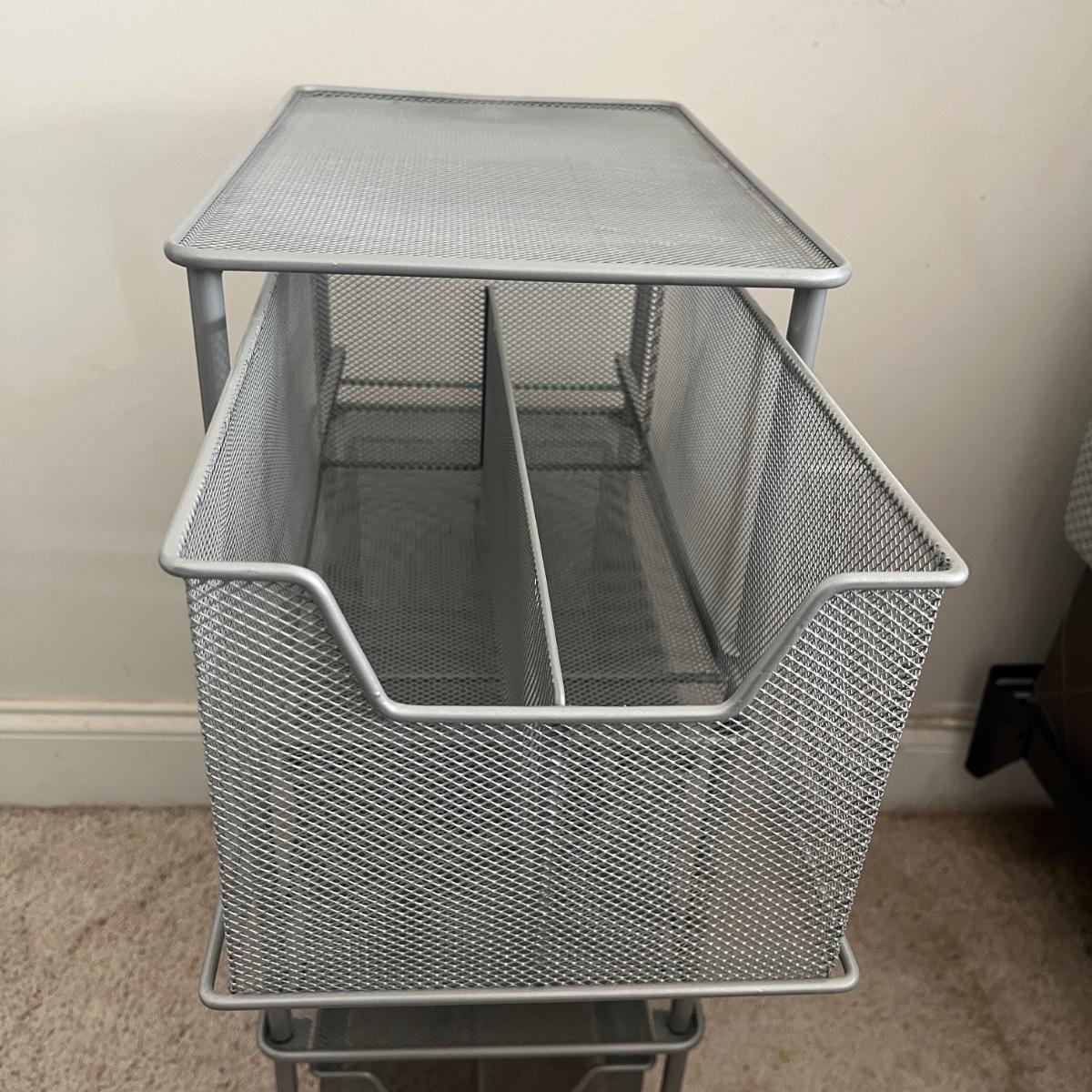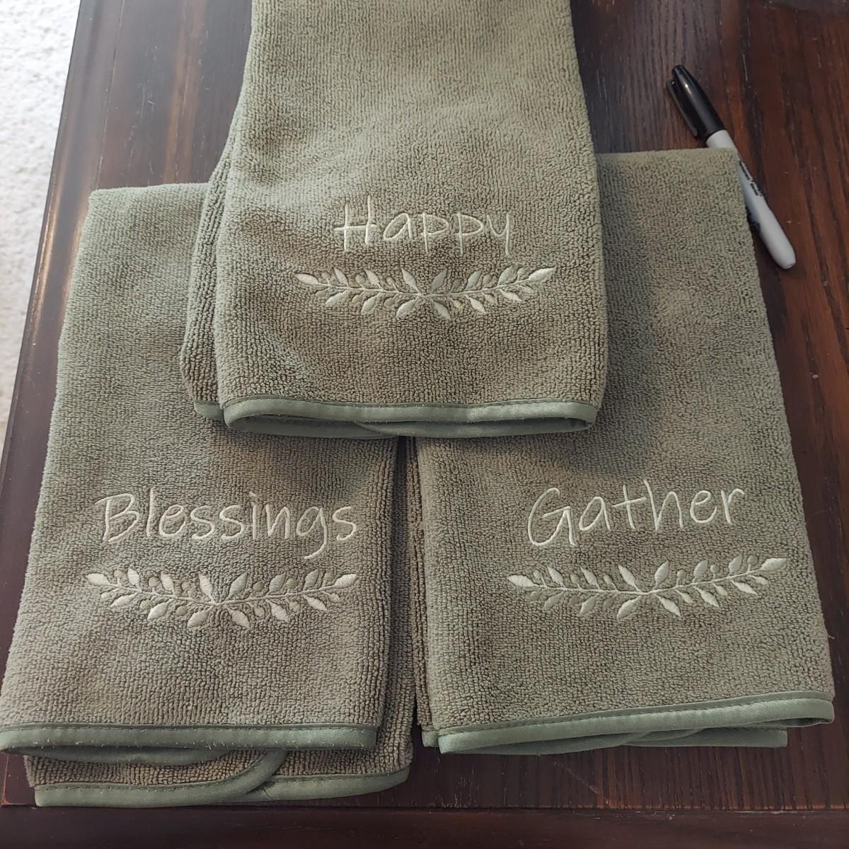 Lot includes metal ironing board with new cover, folding metal clothing air-dryer, a box of hangers, Sunbeam Iron, three hand towels with five matching washcloths and three stackable metal storage drawers with each one measuring 10.5” x 16” x 9.5”H.