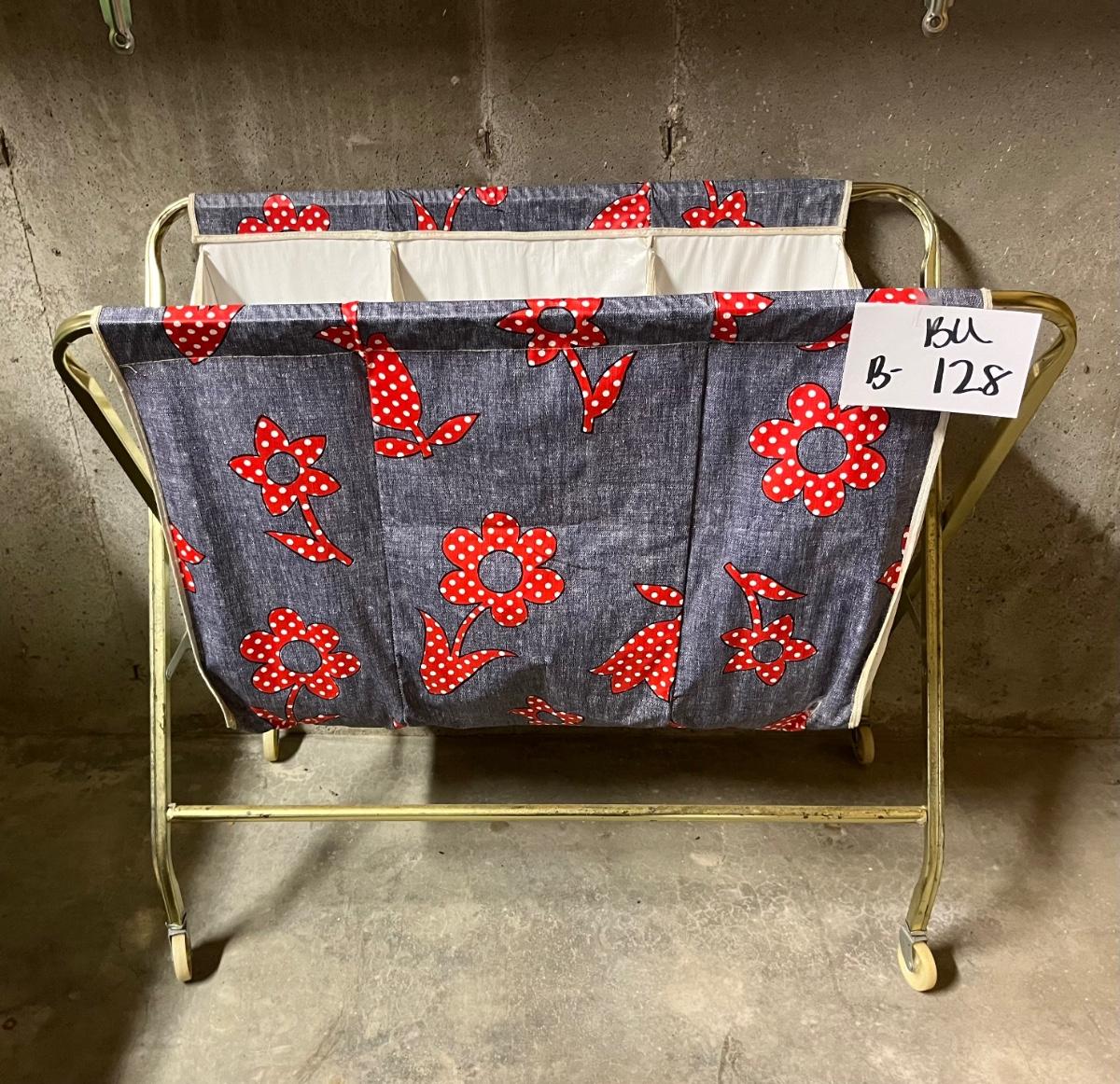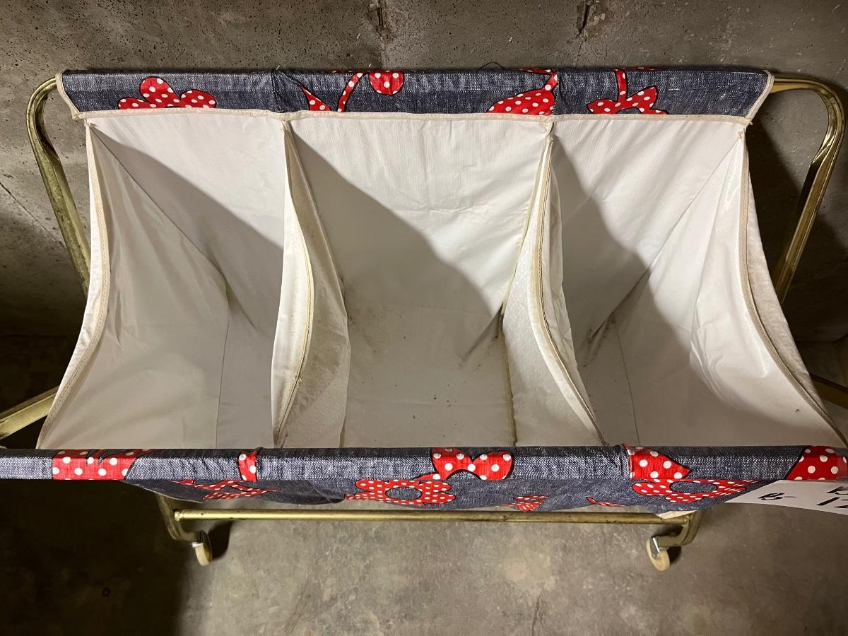 Awesome laundry hamper on wheels with plastic divided into 3 compartments.