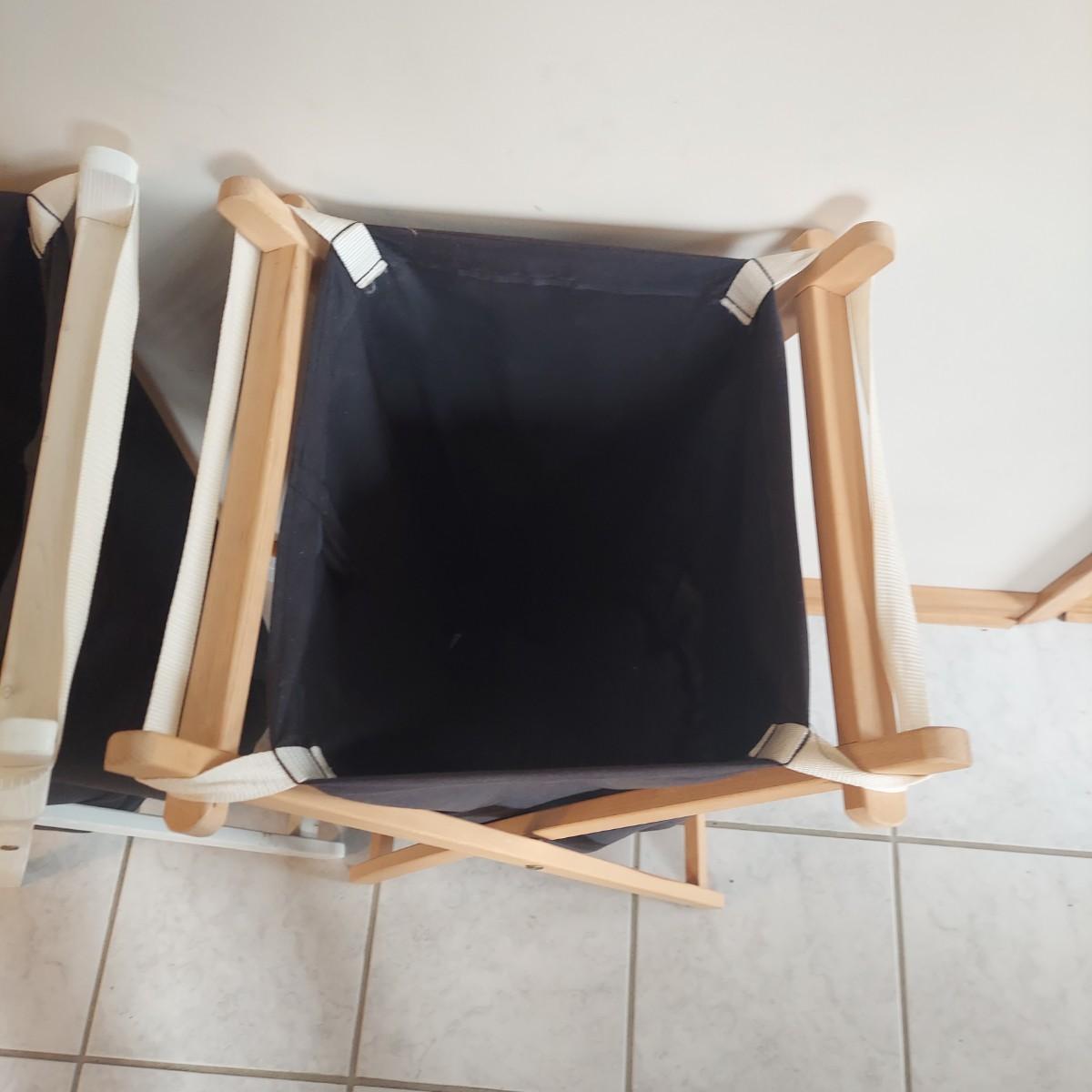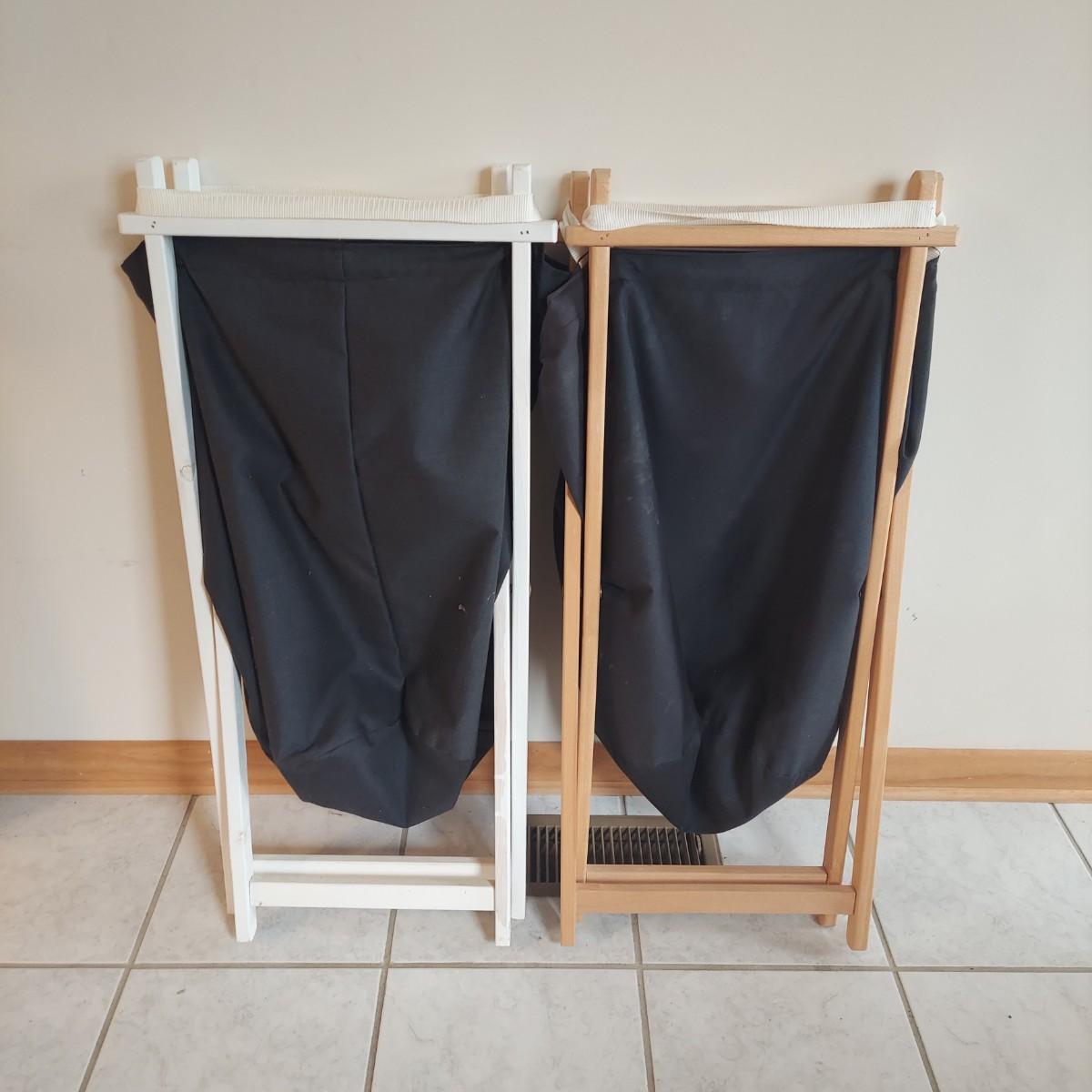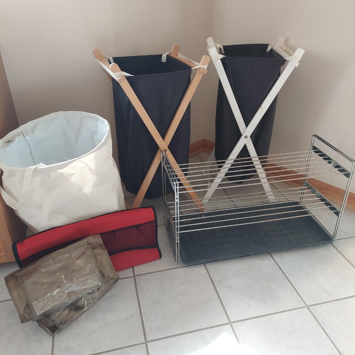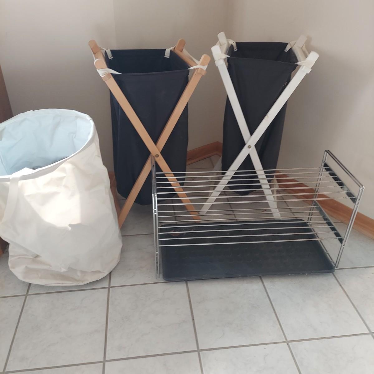 This lot includes multiple hampers and closet organizing pieces. There are two wood frame folding hampers with removable cloth bag. They measure 17 x 17 x 32"H. The off white soft sided canvas hamper with handles measures 24"H with a 17" diameter. There is a metal shoe rack has two shelves and measures 30 x 12 x 17"H. There is a plastic mud room shoe tray that fits under the shoes rack. It measures 28 x 14 x 1"H. Also includes is a double sided hanging closet organizer and a red hanging organizer with mesh pockets. Local Pickup Only.