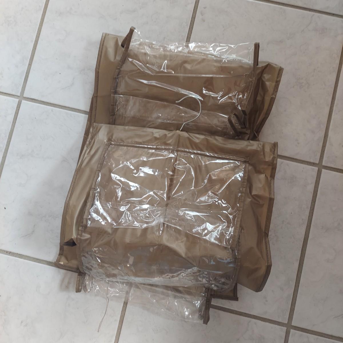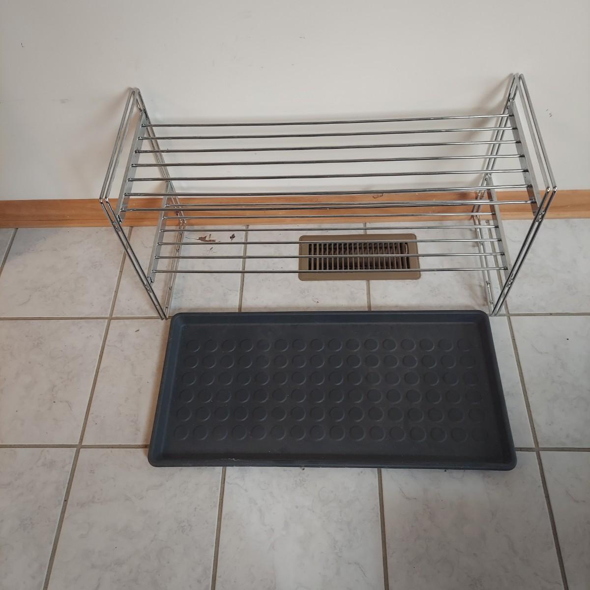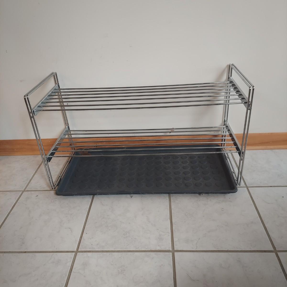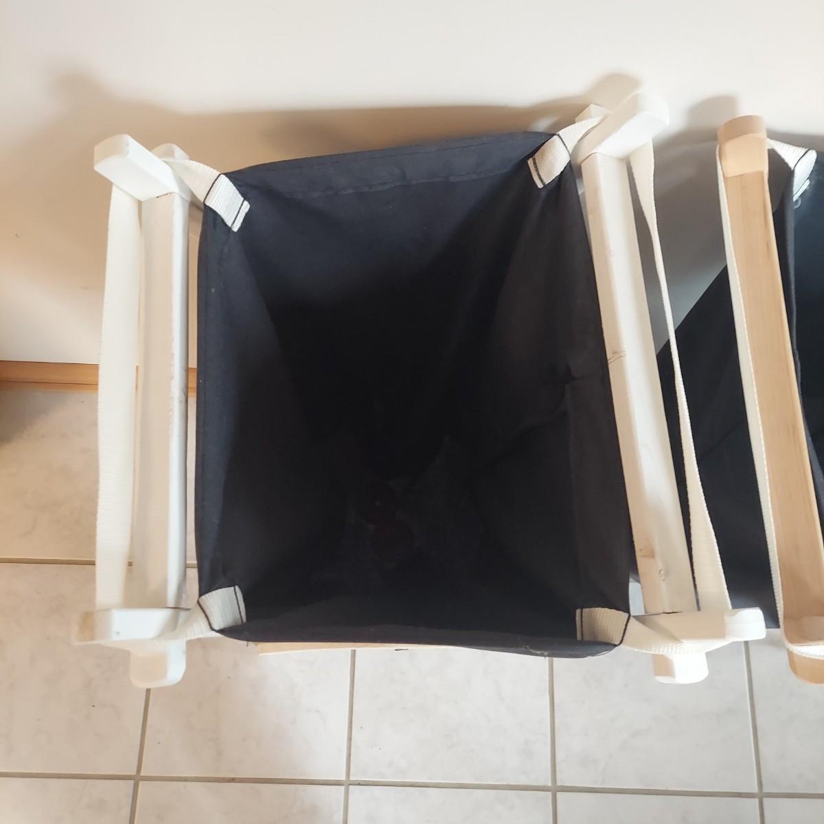 This lot includes multiple hampers and closet organizing pieces. There are two wood frame folding hampers with removable cloth bag. They measure 17 x 17 x 32"H. The off white soft sided canvas hamper with handles measures 24"H with a 17" diameter. There is a metal shoe rack has two shelves and measures 30 x 12 x 17"H. There is a plastic mud room shoe tray that fits under the shoes rack. It measures 28 x 14 x 1"H. Also includes is a double sided hanging closet organizer and a red hanging organizer with mesh pockets. Local Pickup Only.