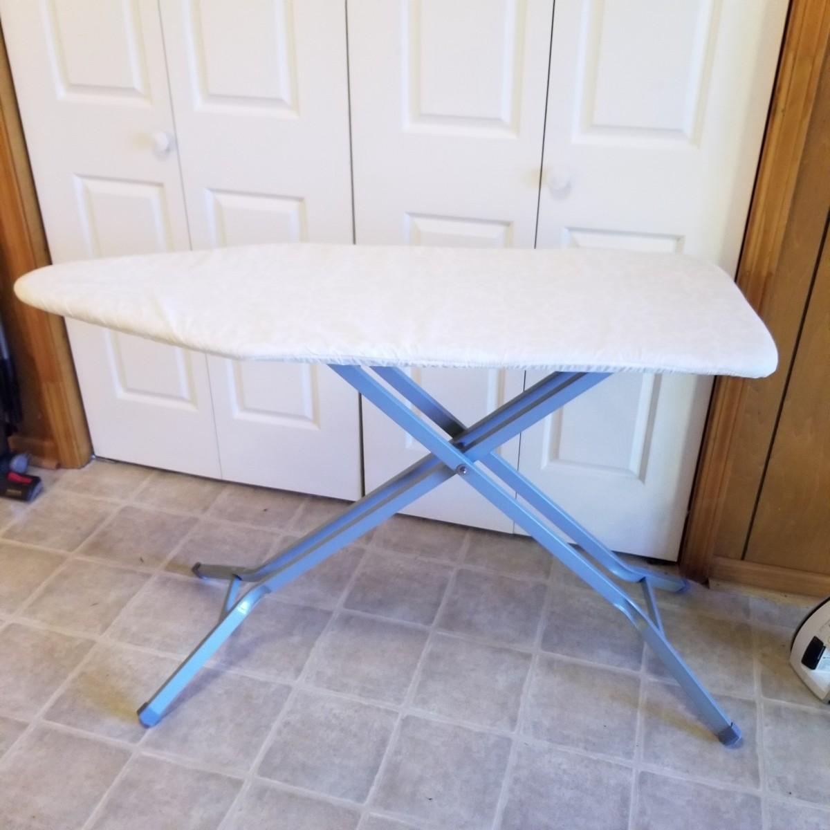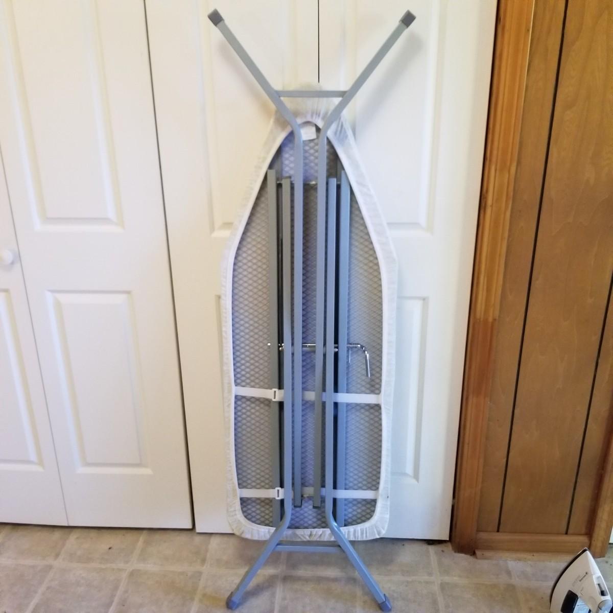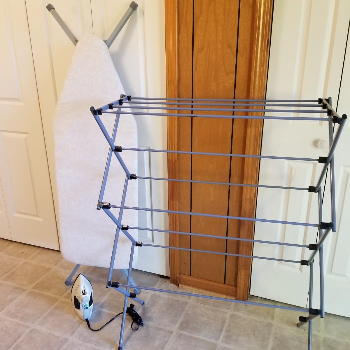 One ironing board, iron, and drying rack. Black & Decker 640S steam iron, worked when tested. One adjustable metal drying rack 35" x 15" x 45". Drying rack folds up for easy storage. And one ironing board with cover, 48" x 28". See photos for details. Local pickup only.