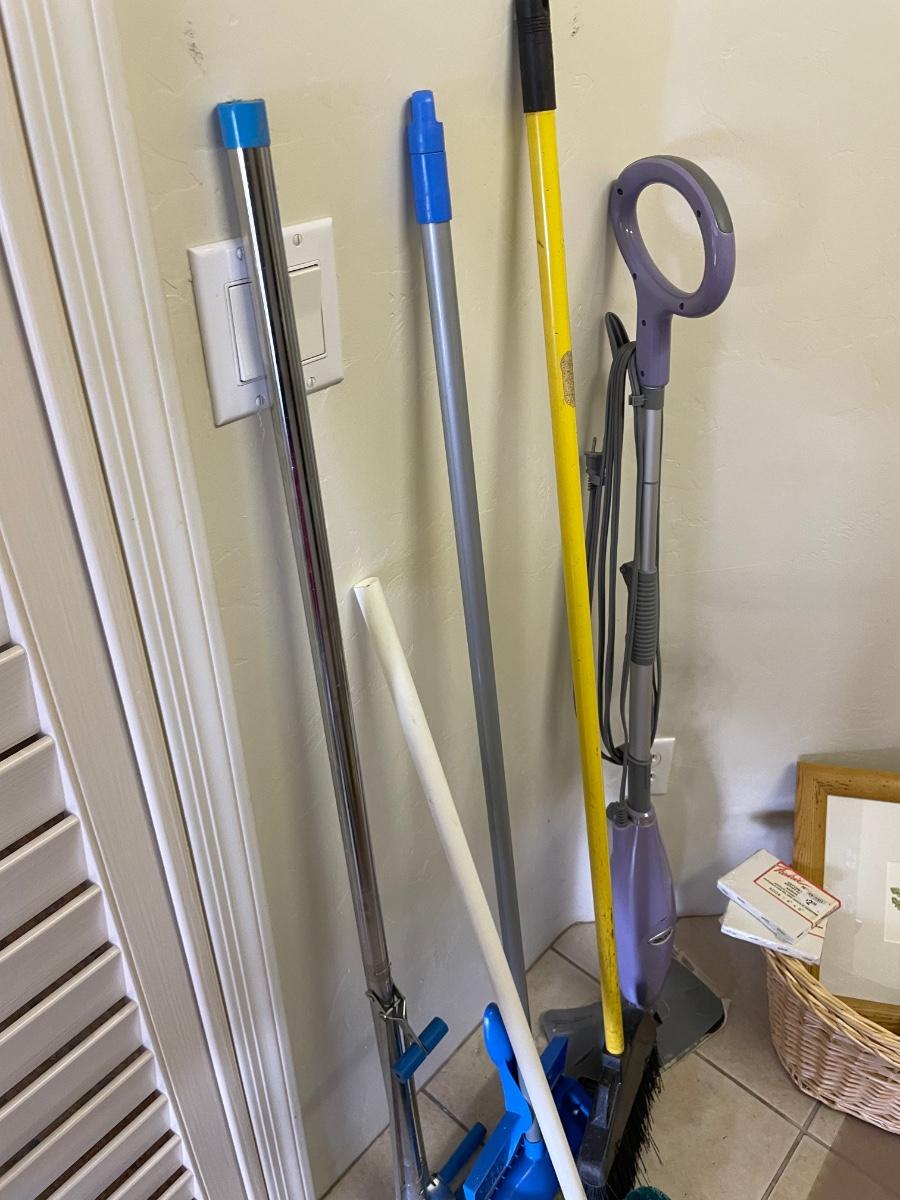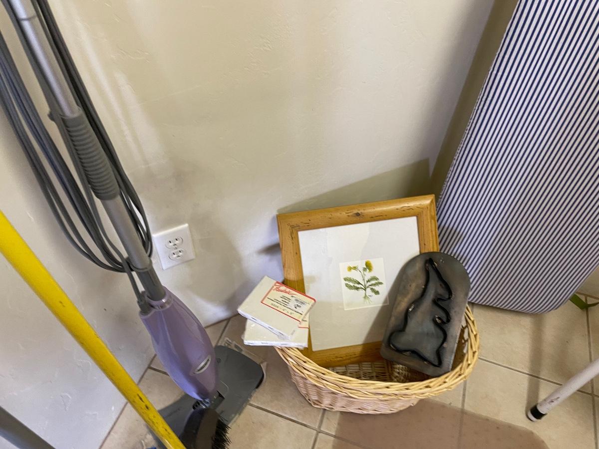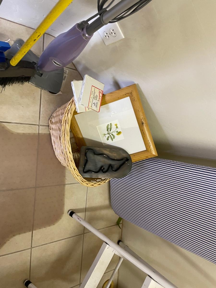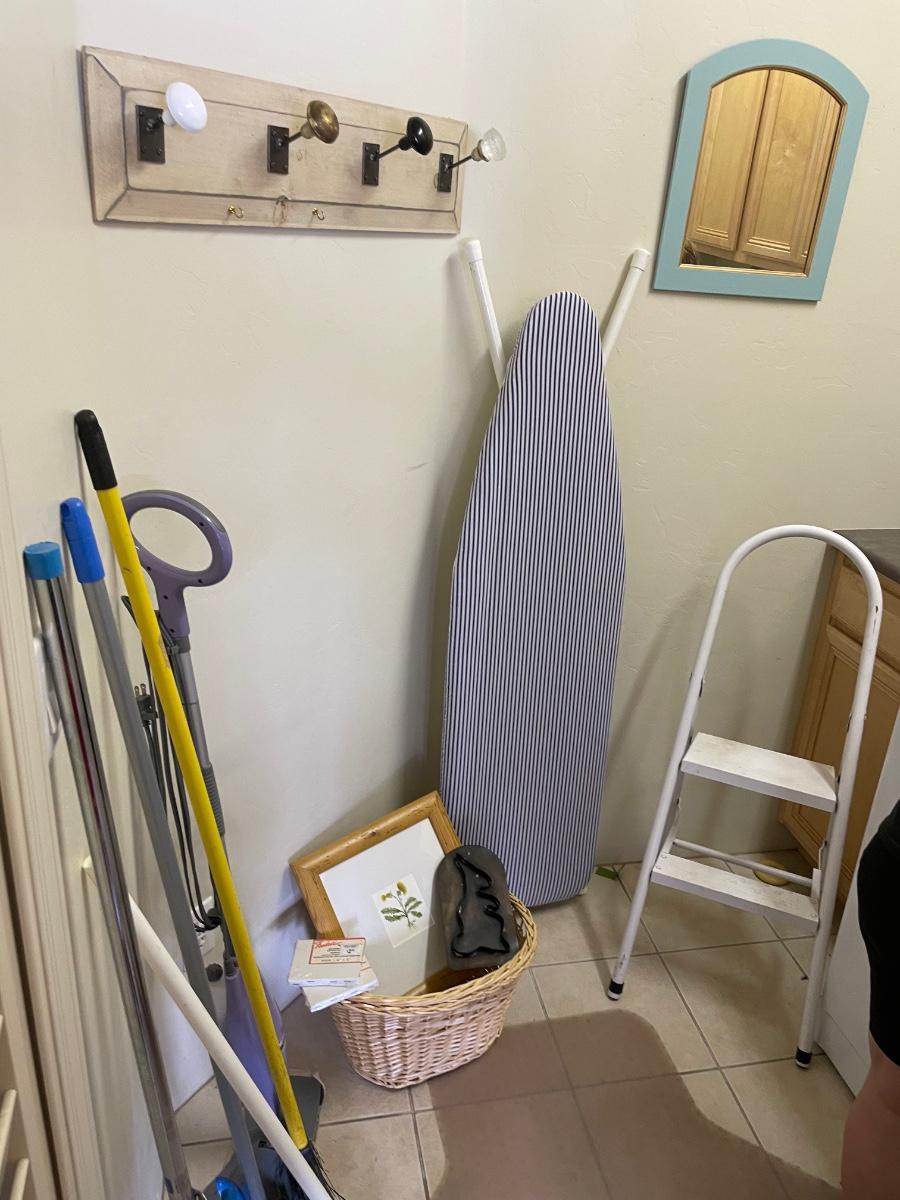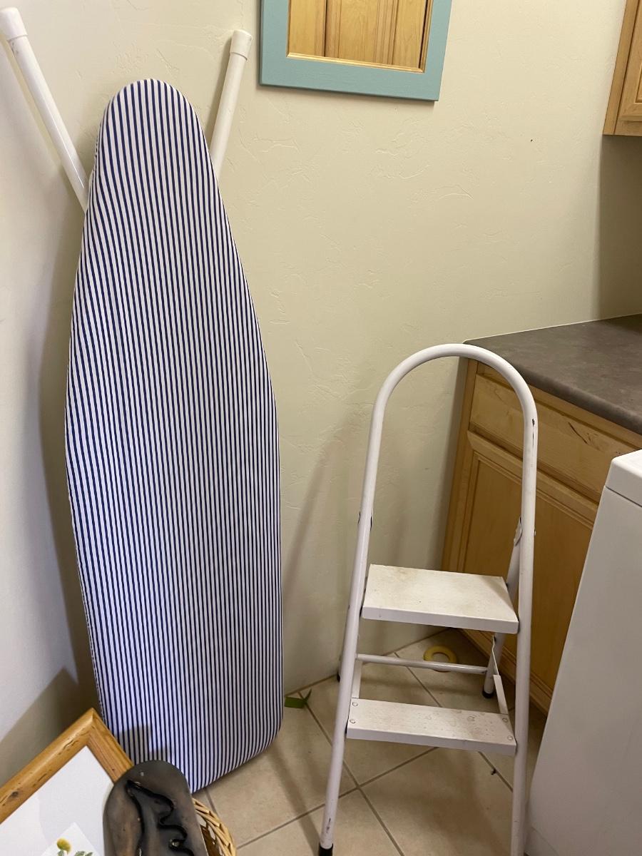 wall mirror, wall hooks, ironing board, step stool, shark and more