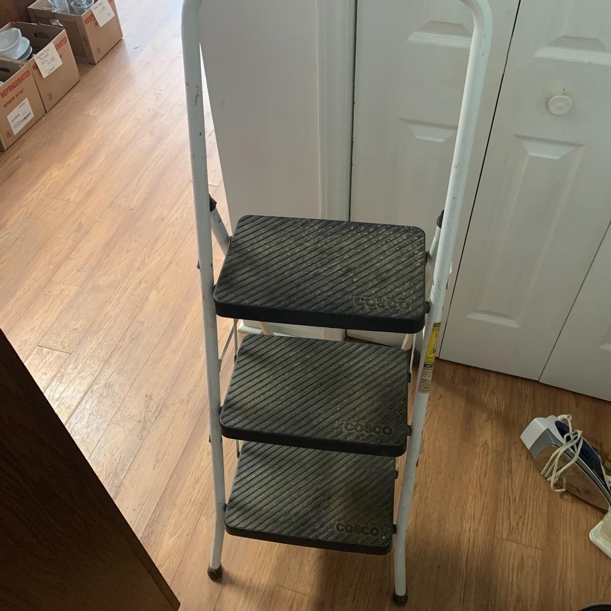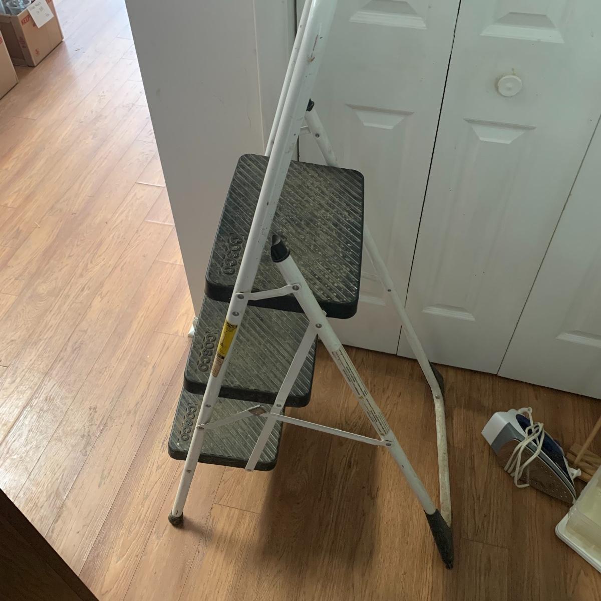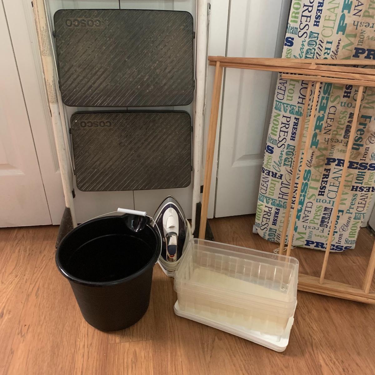 Lot includes a COSCO three step step ladder, a folding clothes drying rack, an ironing board and Black & Decker iron along with three shoe box size plastic storage bins and new plastic bucket. Iron powered on when tested. Local pick up only.