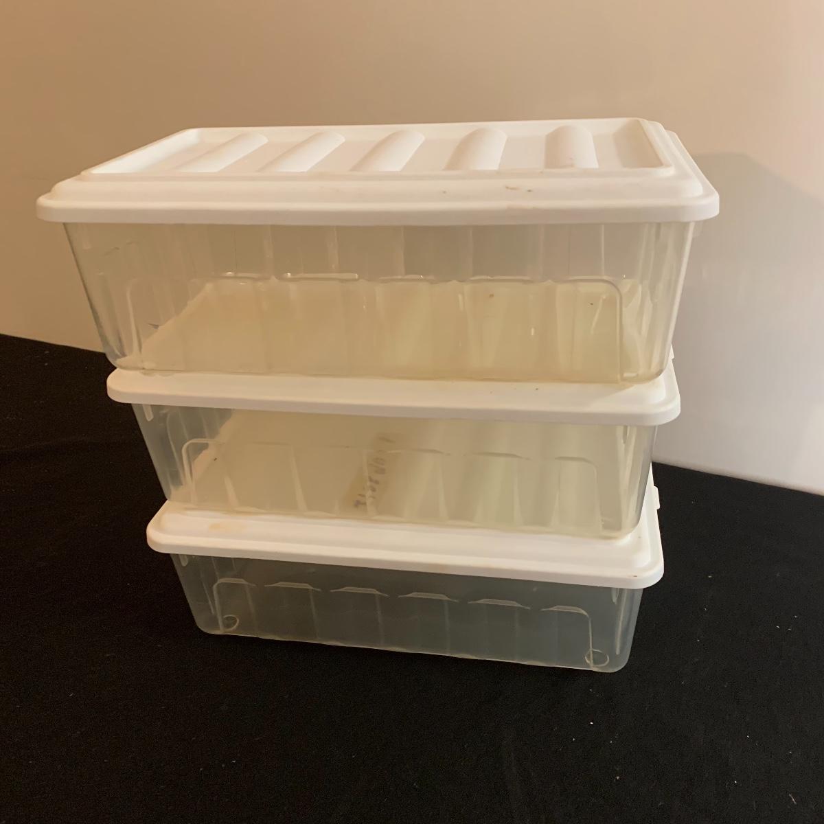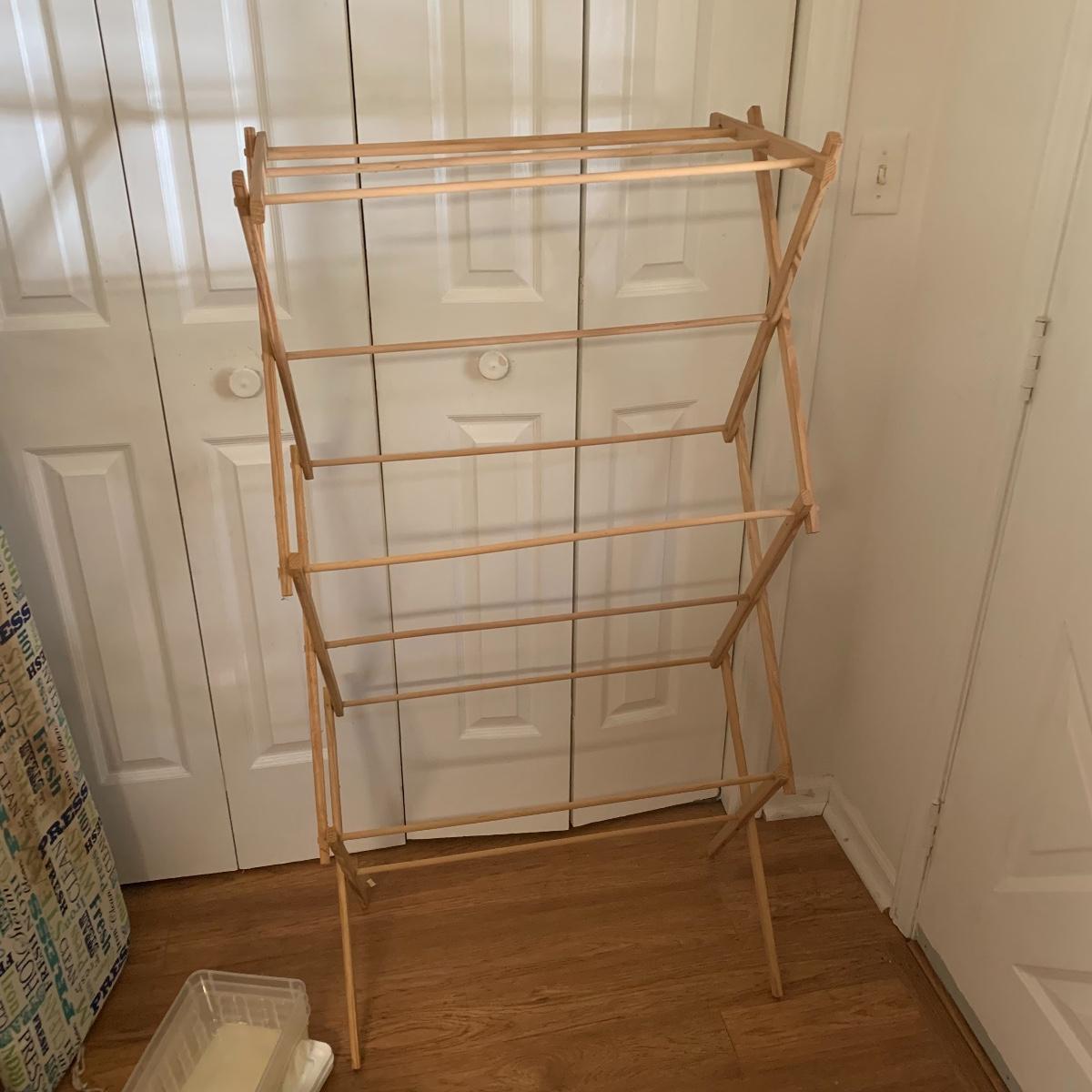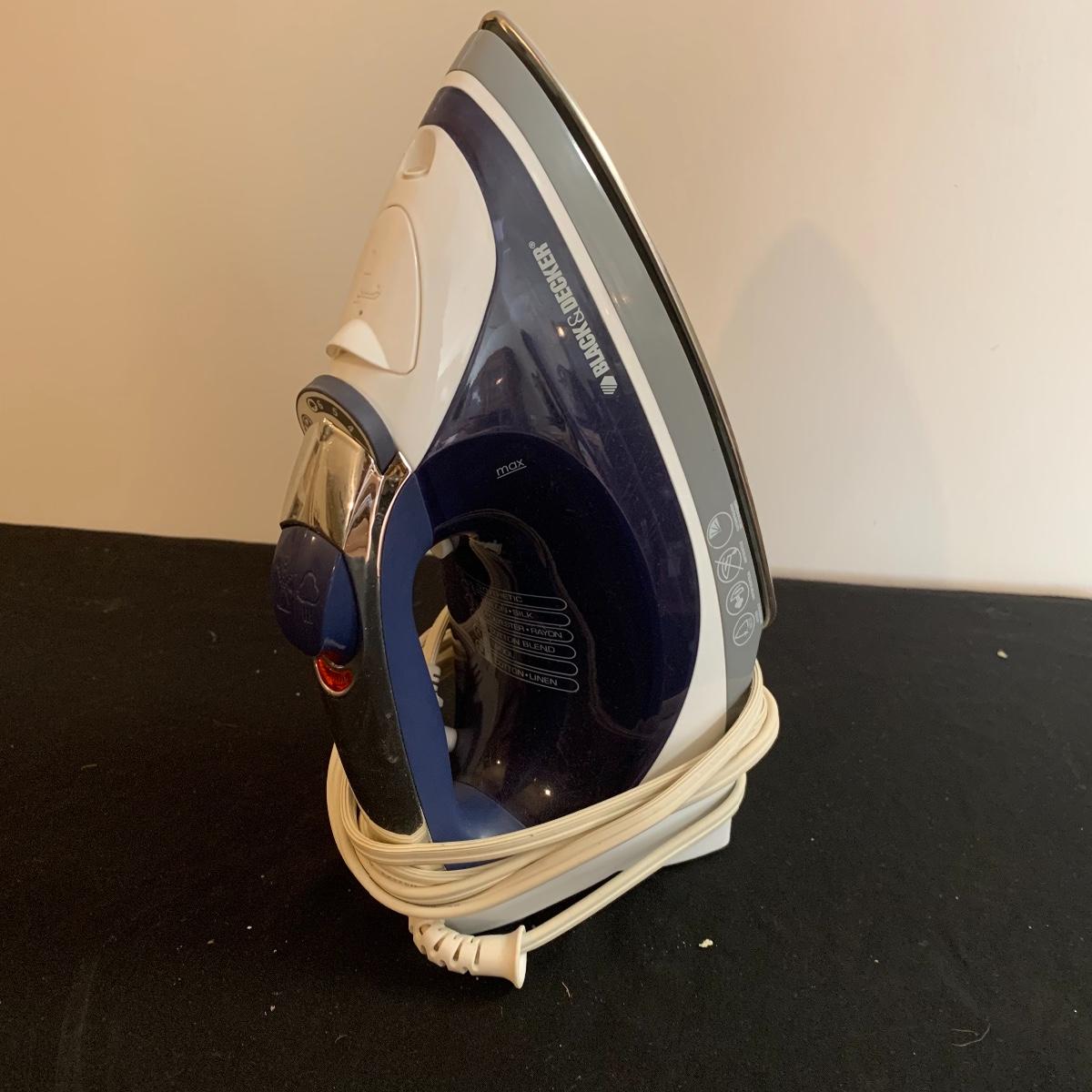Lot includes a COSCO three step step ladder, a folding clothes drying rack, an ironing board and Black & Decker iron along with three shoe box size plastic storage bins and new plastic bucket. Iron powered on when tested. Local pick up only.