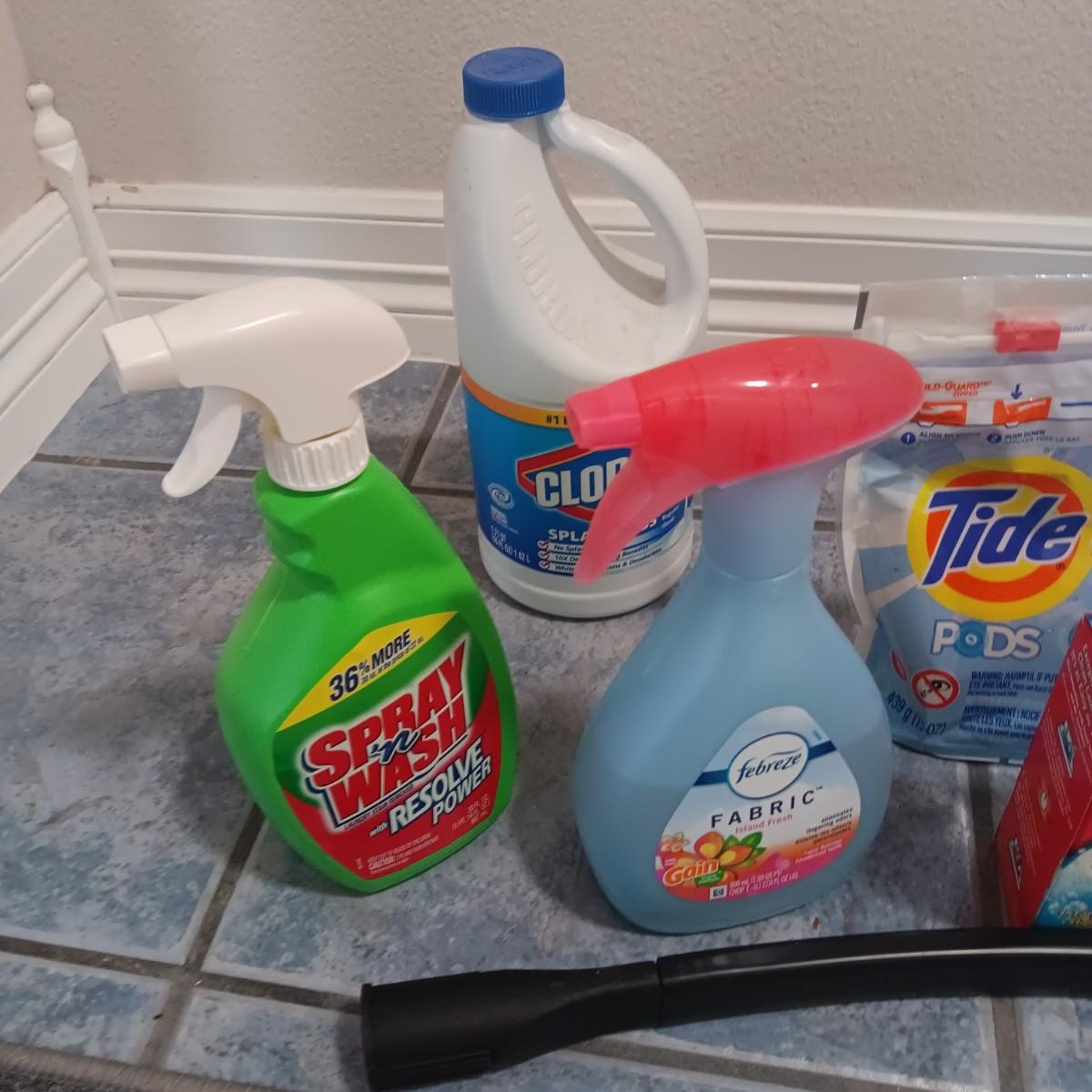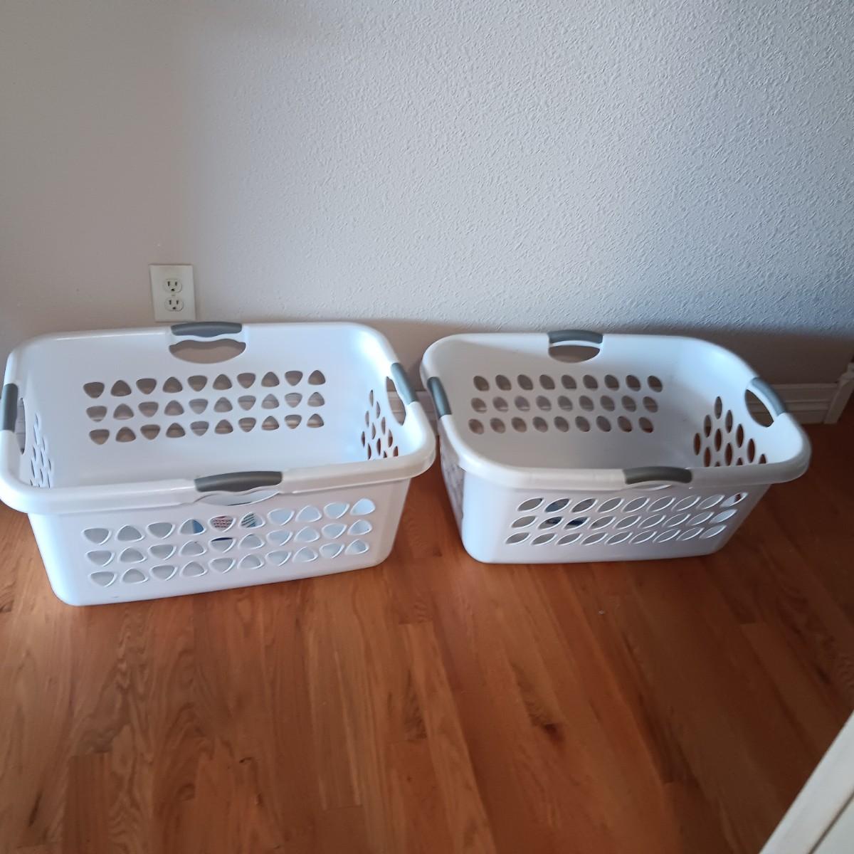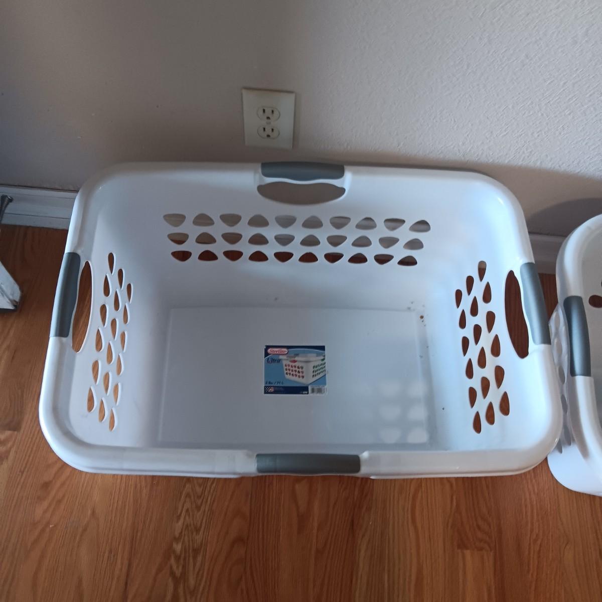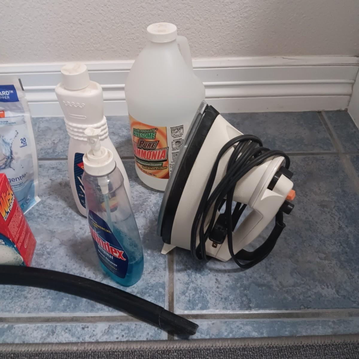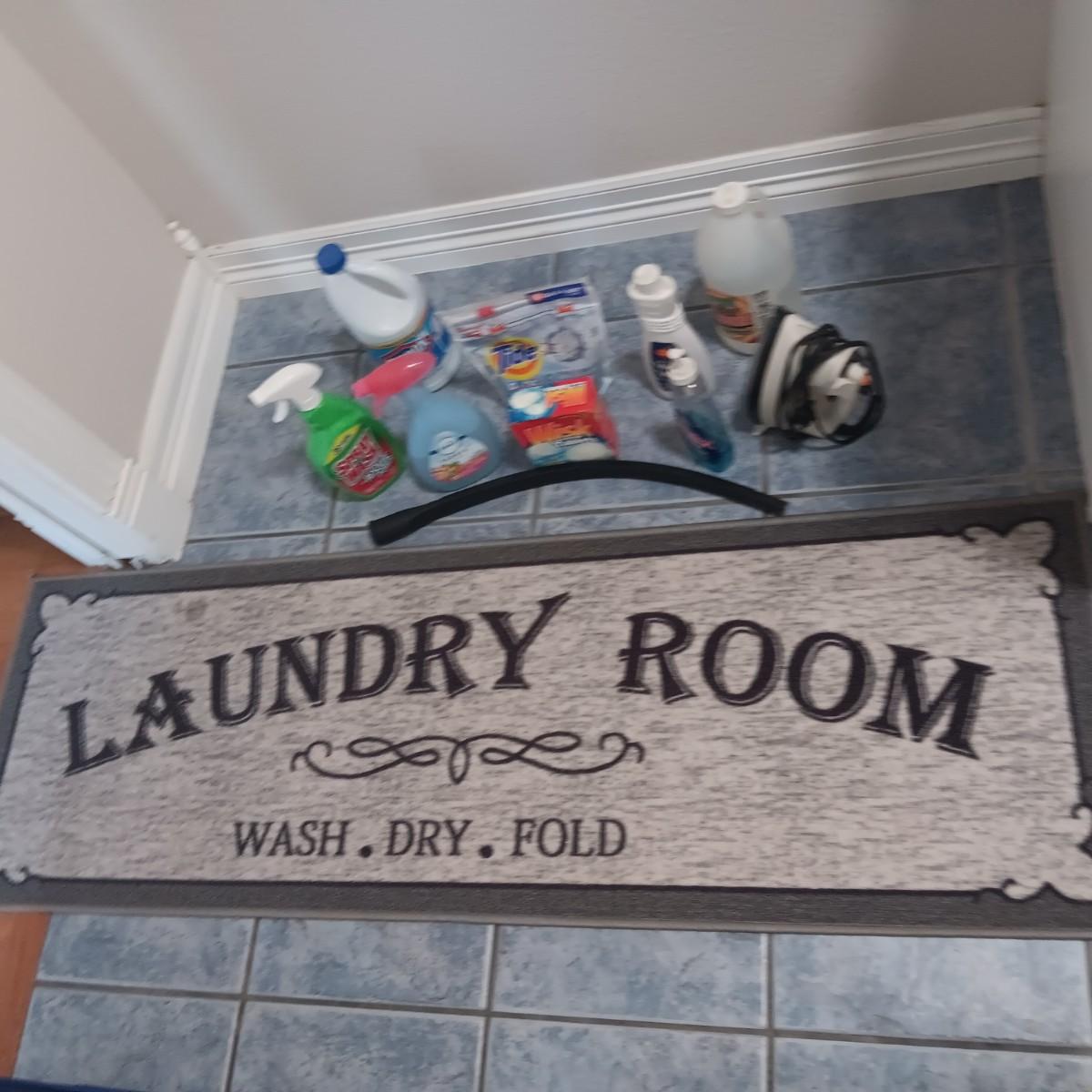 "LAUNDRY ROOM" RUG, CLOTHES IRON, 2 LAUNDRY BASKETS AND CLEANERS