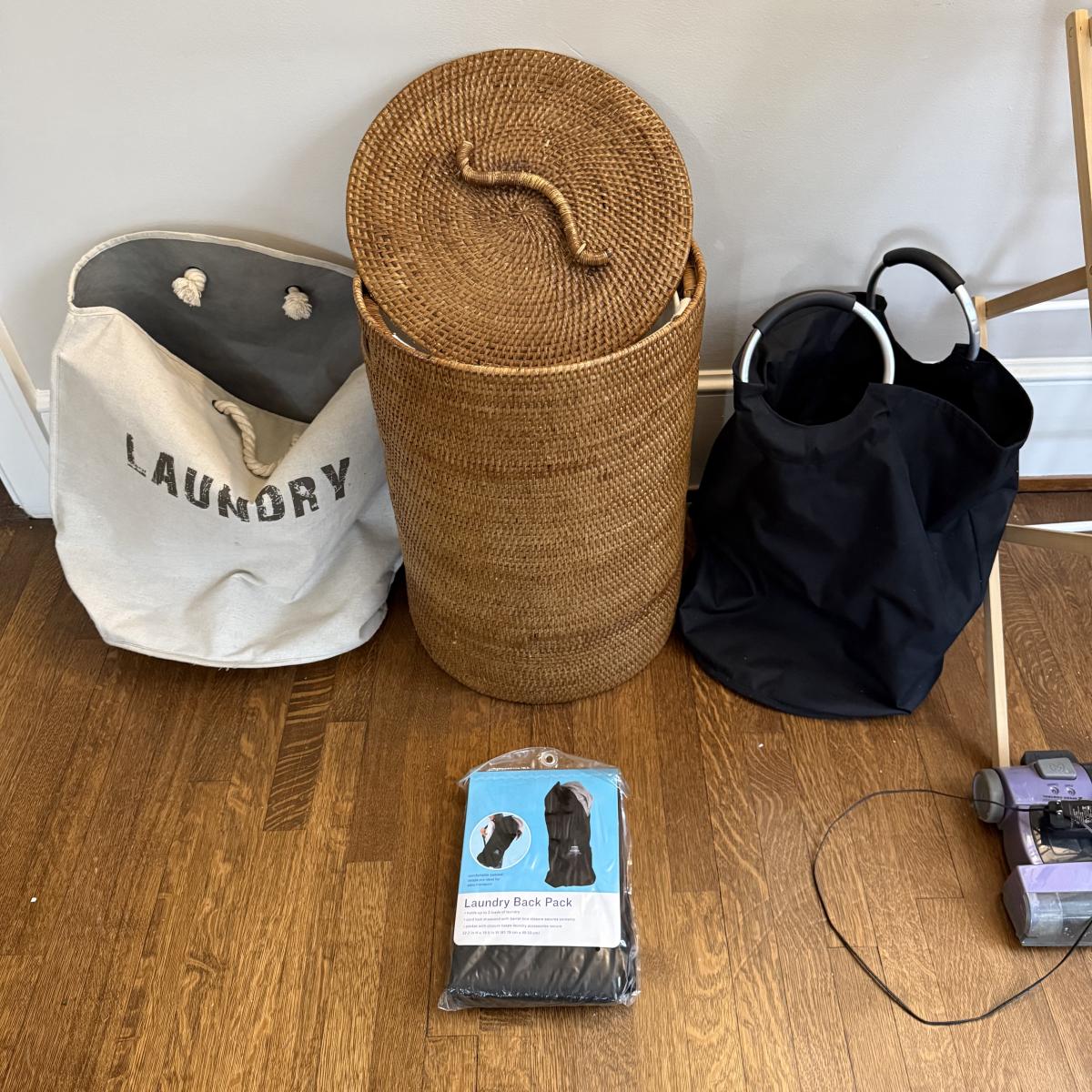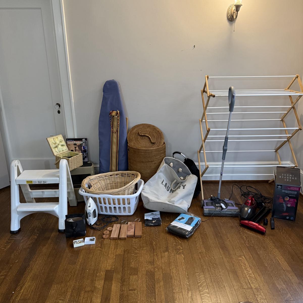 This lot contains a variety of must haves for all your laundry, sewing, and tidying needs!! Starting from left to right of what’s pictured, we have two step stools, both plastic one that folds. A floral sewing kit as well as an abundance of buttons, an iron, ironing board, measuring stick with pocket, two baskets, one woven hamper with a lid and three traveling or soft hampers. The floral sewing kit measures 9” x 8” x 5.5”H and the woven hamper with a lid measures 16.25”D x 23”H. Also included are some cedar planks and disks, hanger clips and clothes drying rack, a Shark electric broom and a Sharper Image hand and stick vacuum. See pictures for details. Local pick up only.