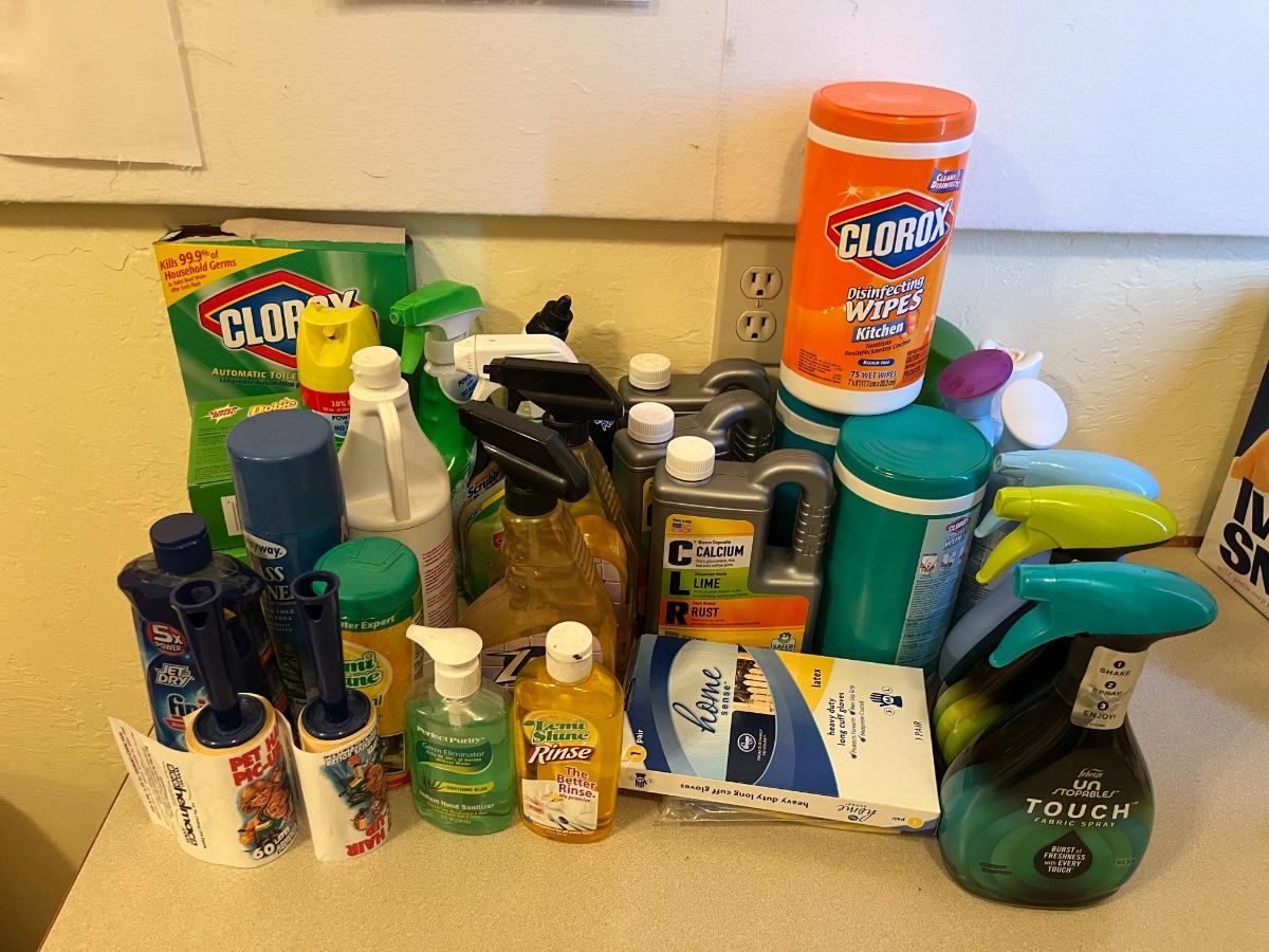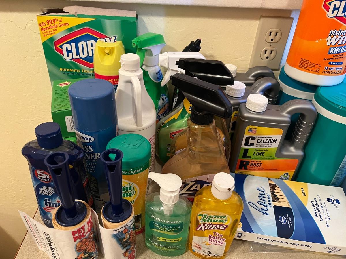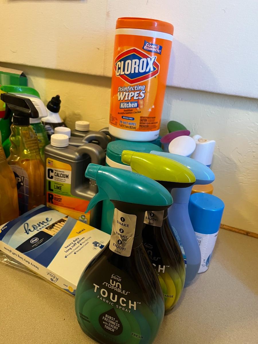 Bathroom supplies, window cleaner, febreez, air fresheners, gloves