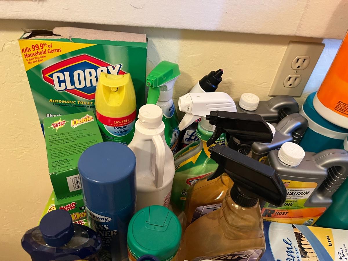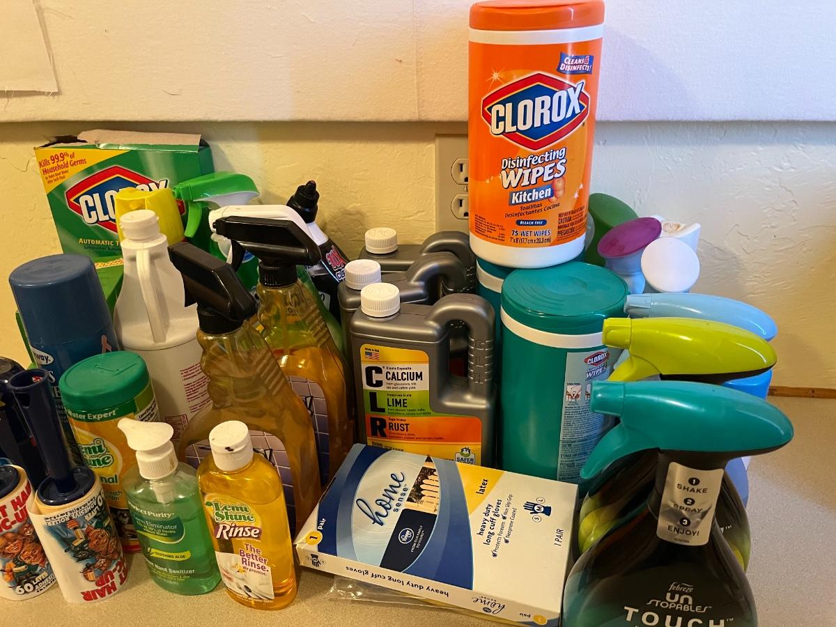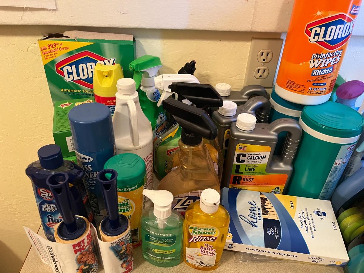 Bathroom supplies, window cleaner, febreez, air fresheners, gloves