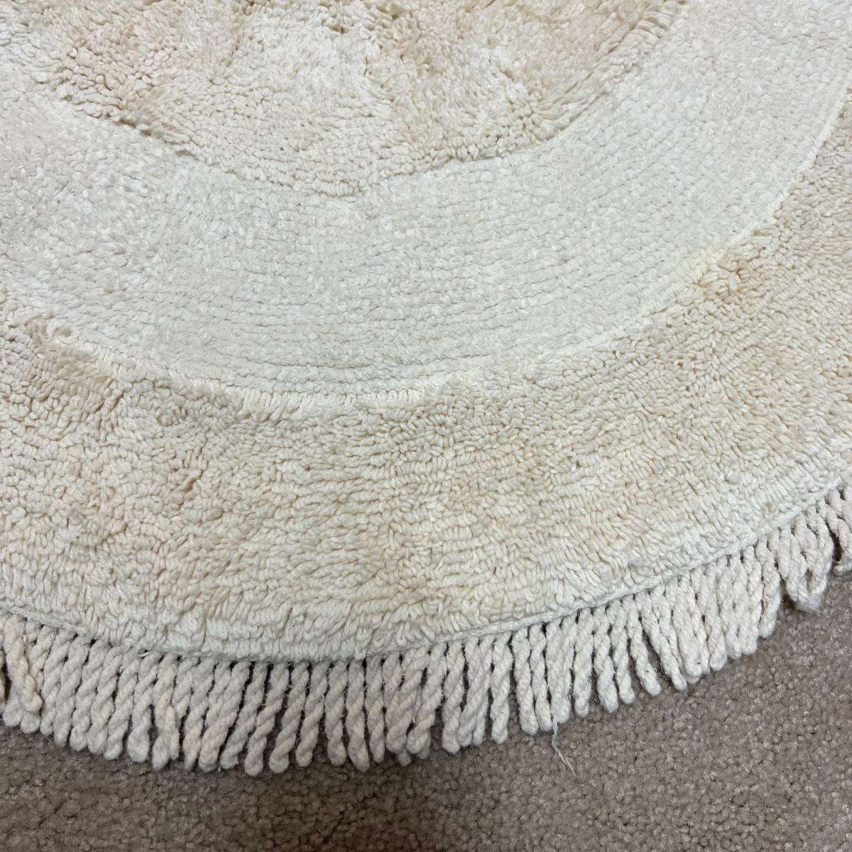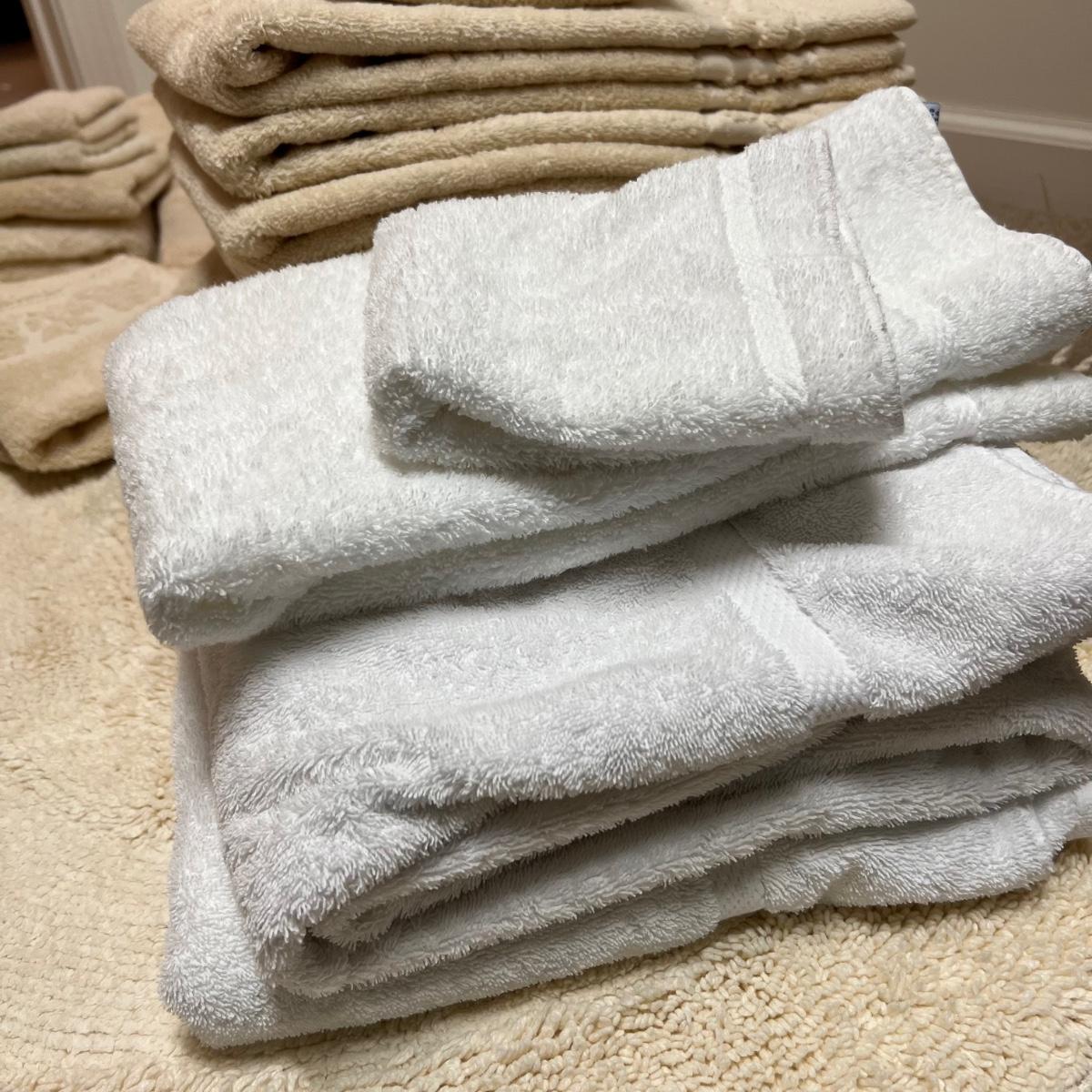 A good assortment of quality towels and a large bath mat. No label on the mat, it measures 35” x 60”.
