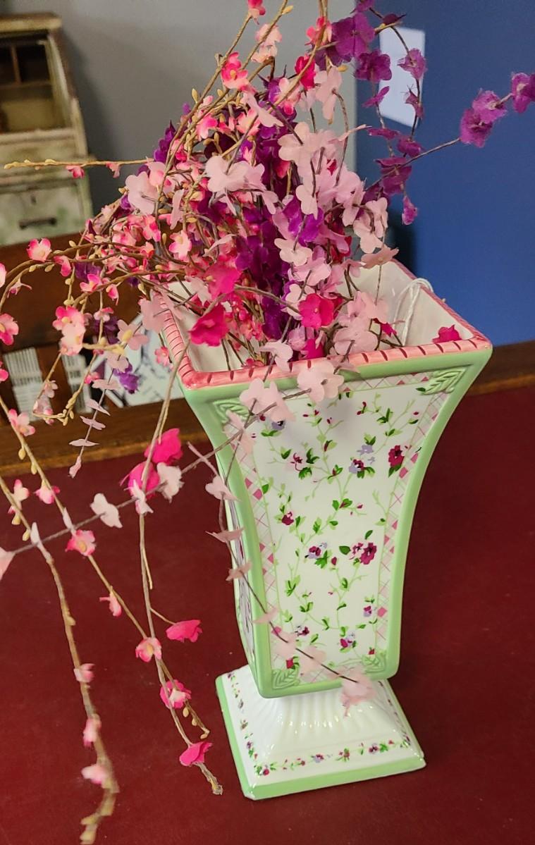 Laura Ashley Vase with Silk Flowers 9 inches tall (some cracks)