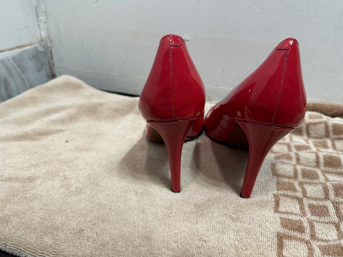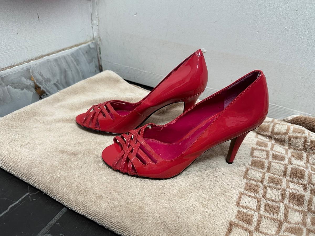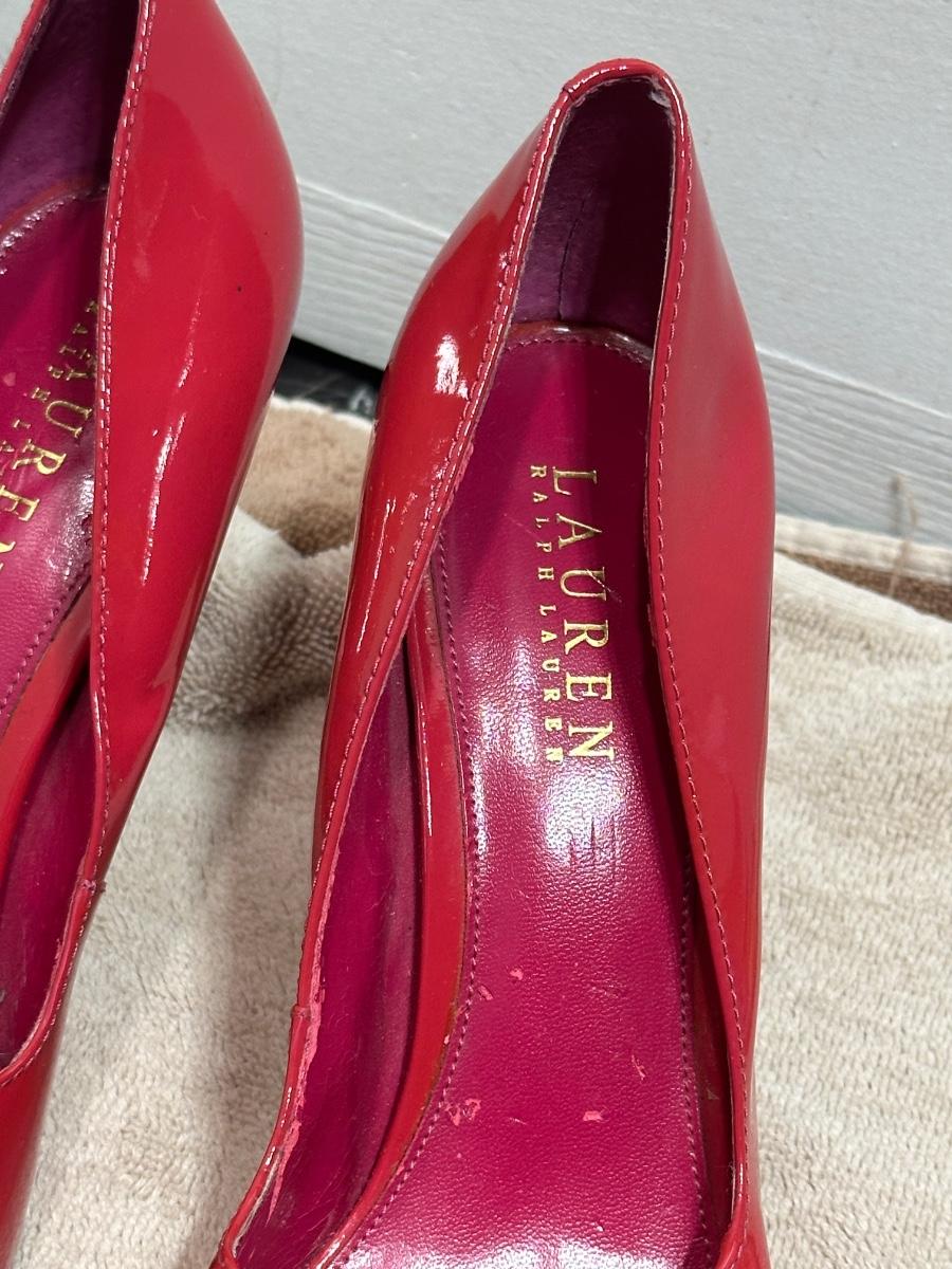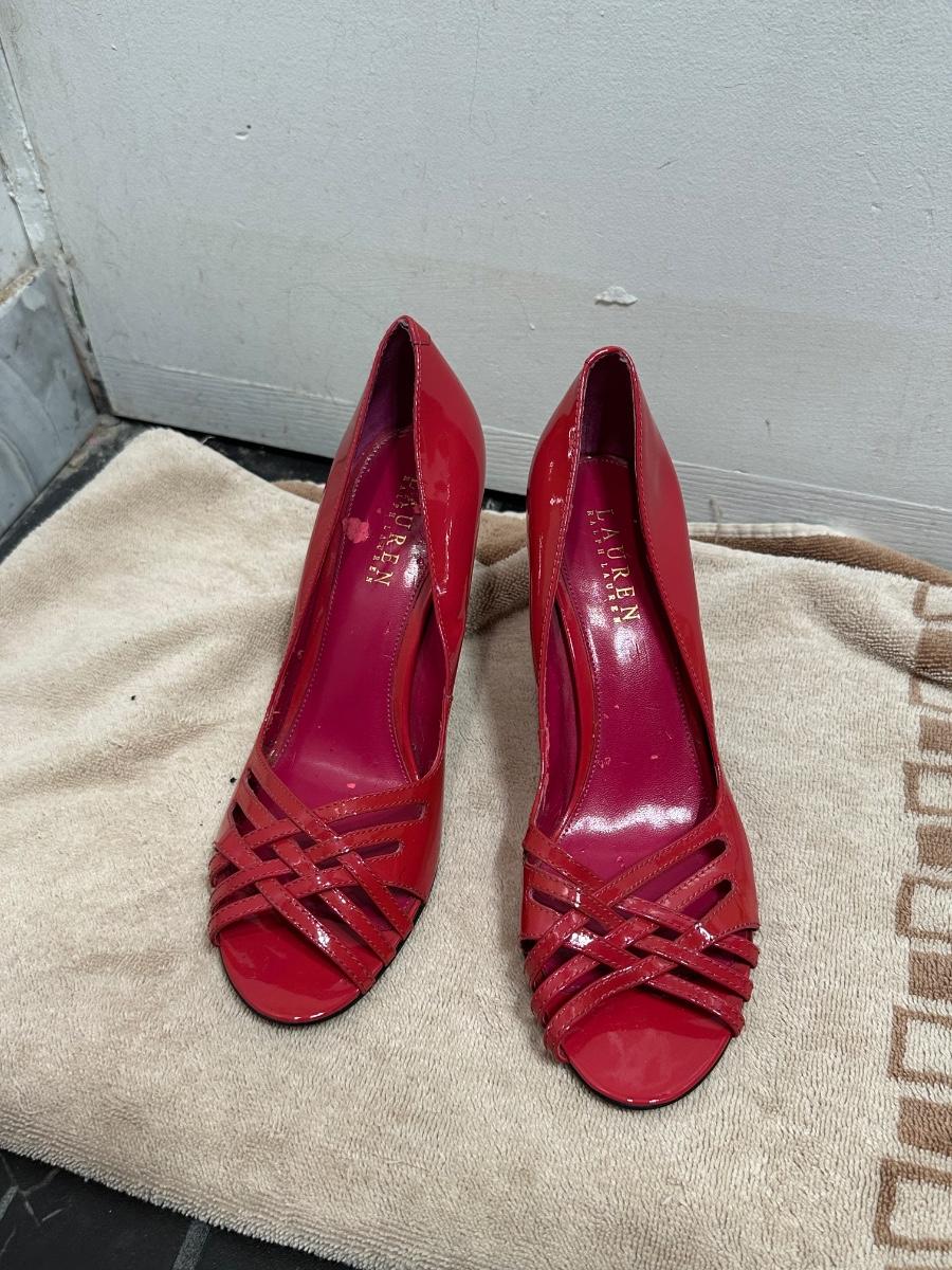 Lauren Ralph Lauren red patent leather strappy peep-toe high heels.