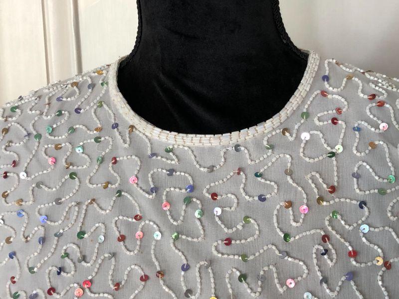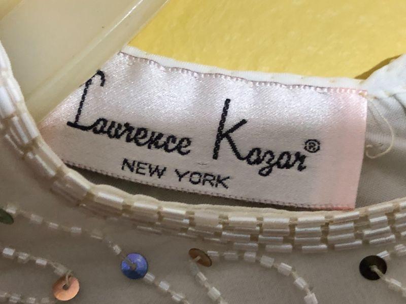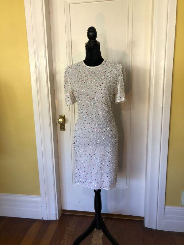 Beautiful and versatile dress by Laurence Kazar, in size small. Knee length with short sleeves. White fabric with multicolor sequin design. In excellent condition, was dry cleaned by owner. From the fashion collection of a San Francisco Presidio Heights estate.
