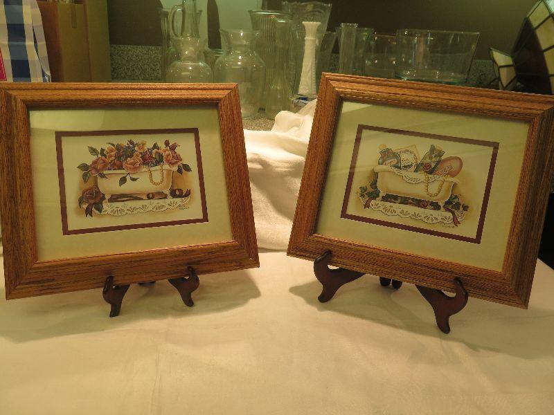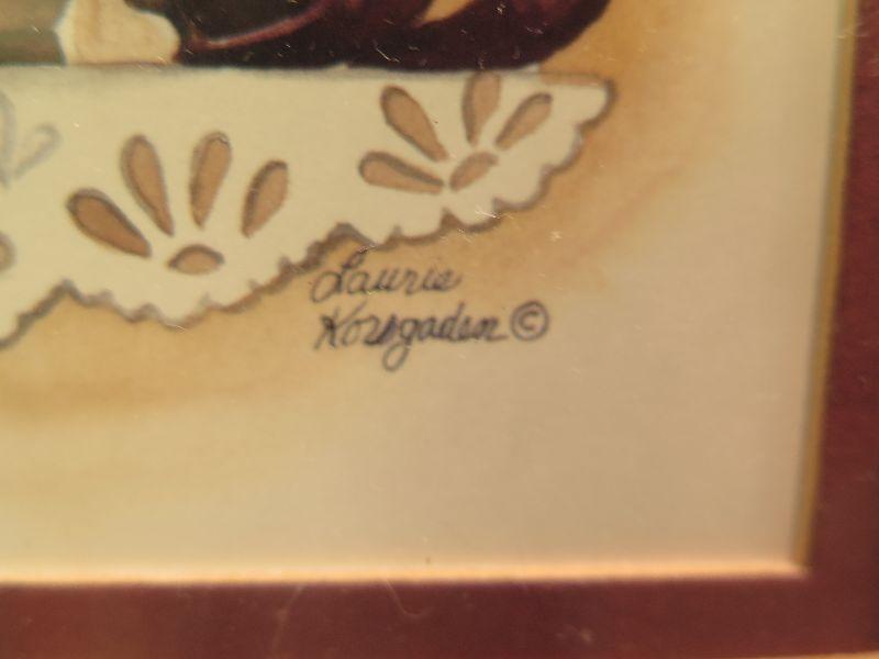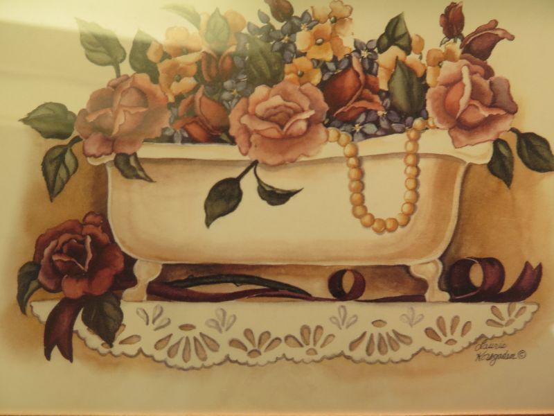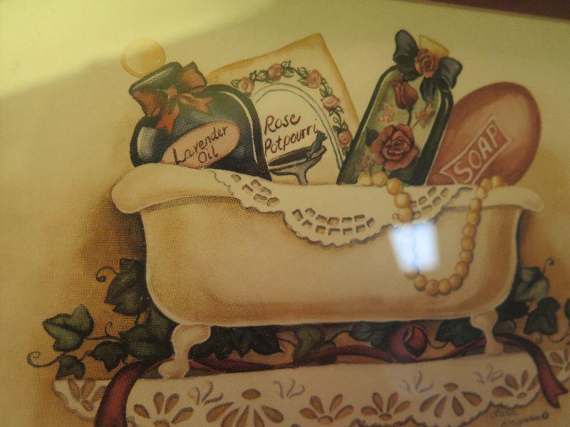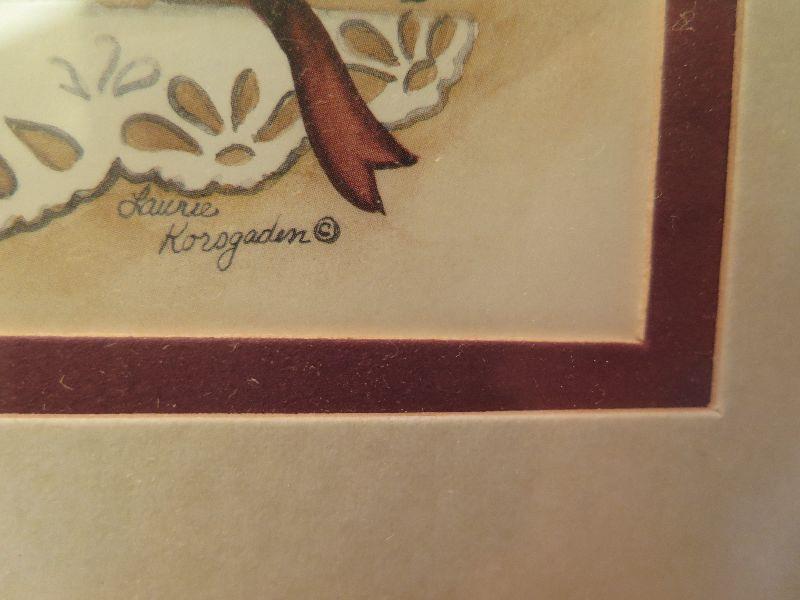 Two matted, and framed prints by Laurie Korsgaden , 5x7. Ready to hang in your bathroom. Please read Terms and Conditions before placing a bid. Pick up is Friday, October 25th between 4 and 7, and Saturday, October 26th between 9 and 1. Props included in photos are not included in listing. All measurements are approximate. Comes from home with cats.