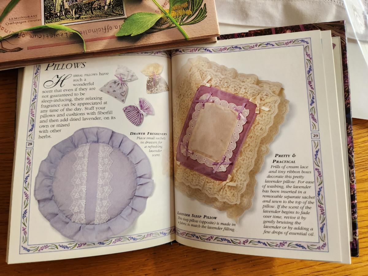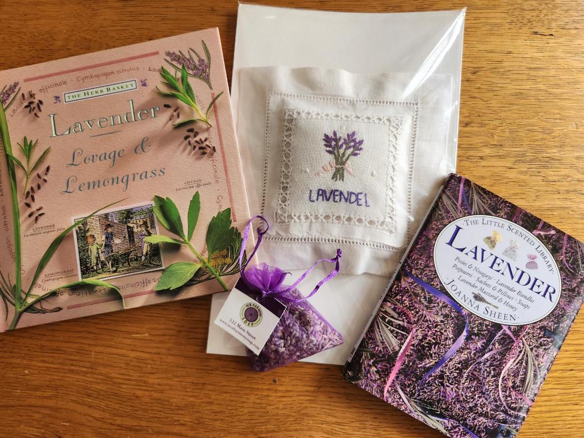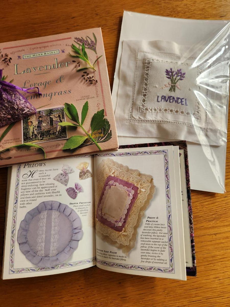 This auction lot is a Lavender Celebration. The offering includes two Lavender books, a small sachet of lavender flowers from New Harmony, IN and a crisp, French Linen Pillow embroidered with a Lavender motif and stuffed with Lavender. Great items for so many uses.