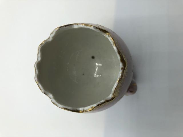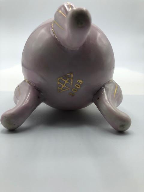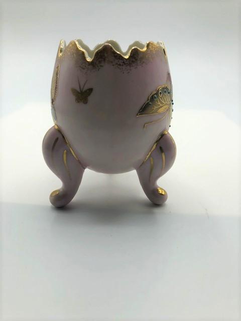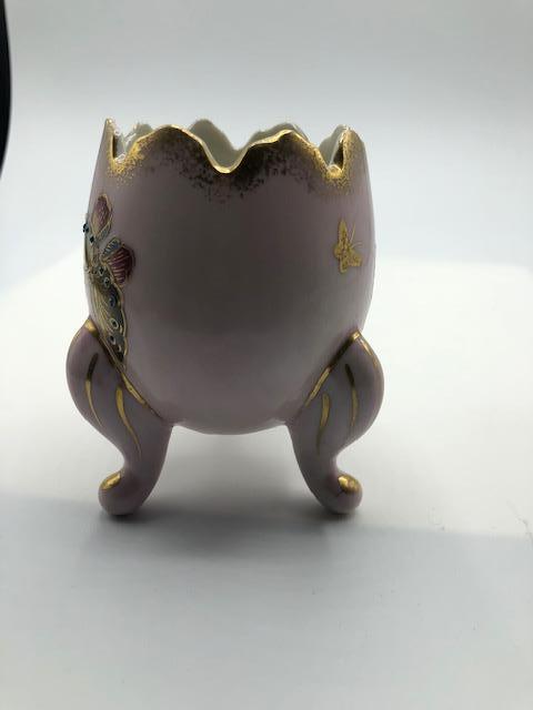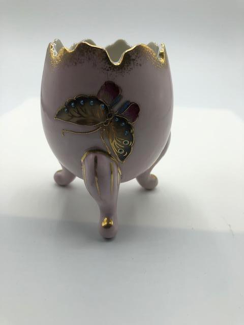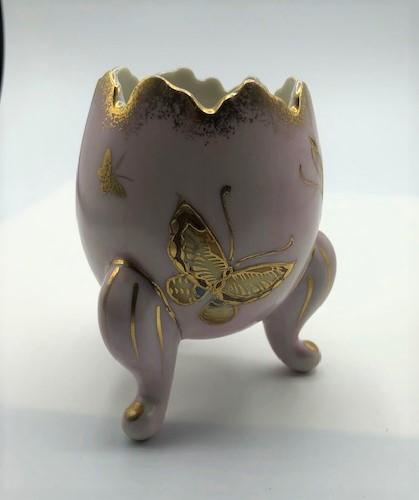 Lavender egg shaped vase. Footed vase has butterflies on it. Gold edges and accents including the butterflies. Stamped on the bottom. Good Condition.