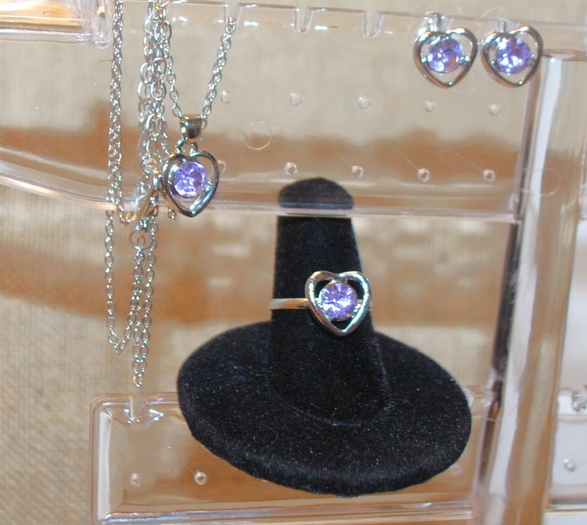 Lavender Hearts JEWELRY SET Includes Earrings (½") with Post Ends; ADJUSTABLE Size 7 Ring & PENDANT (½") on a Silver Tone Necklace Chain 16" L