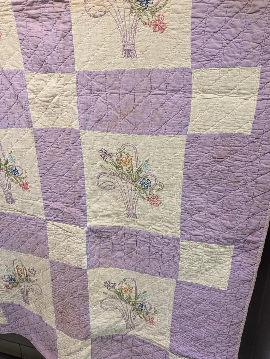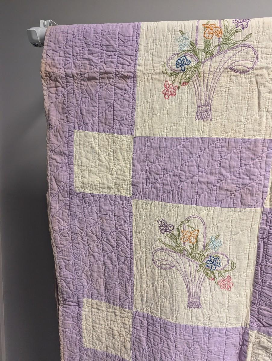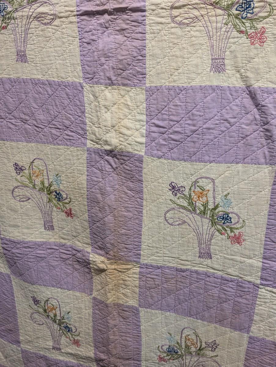 Lavender & White Patchwork Quilt With Embroidered Baskets Of Flowers 90 x 76 Inches #10