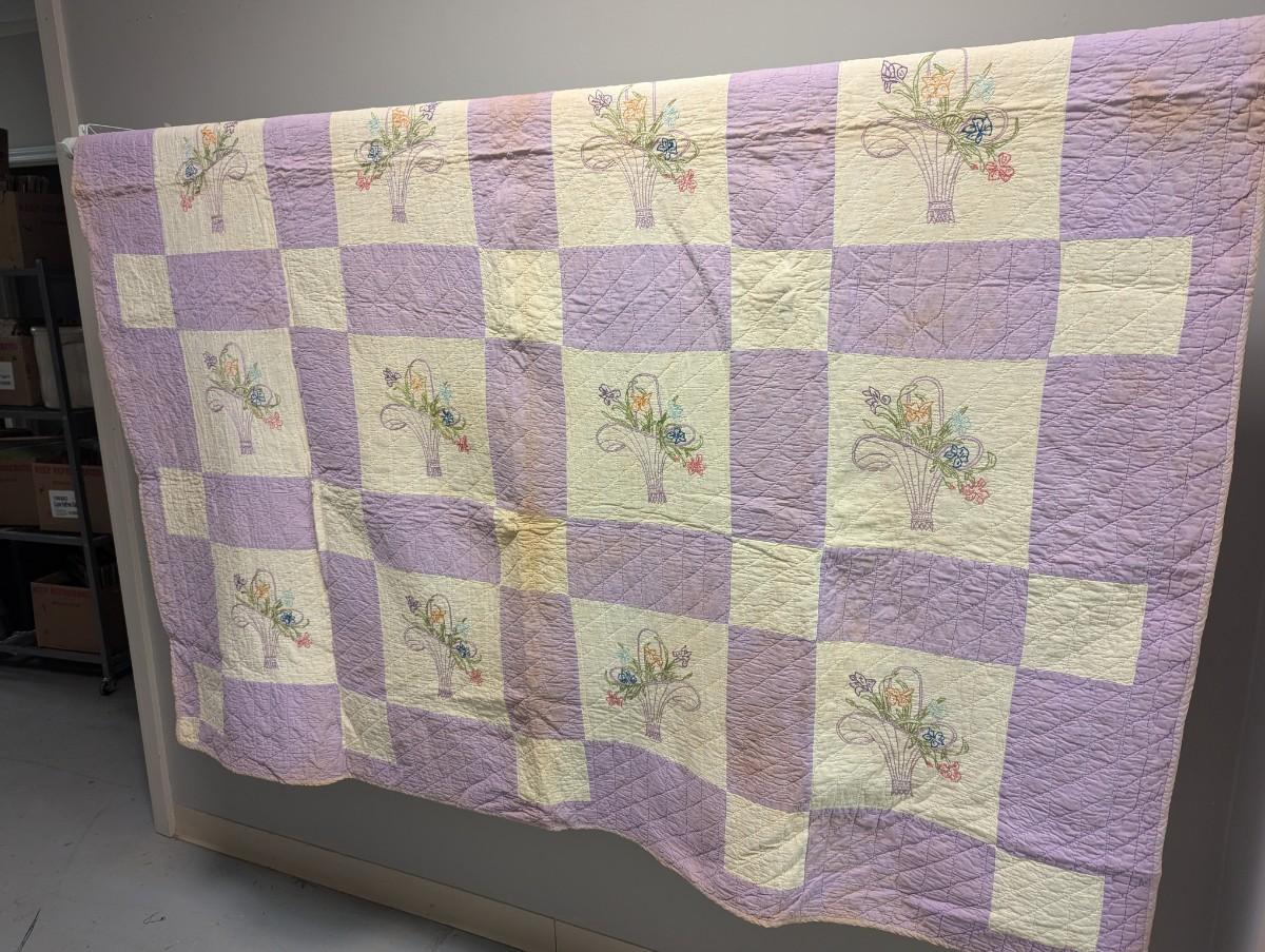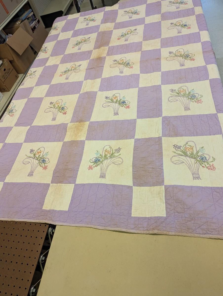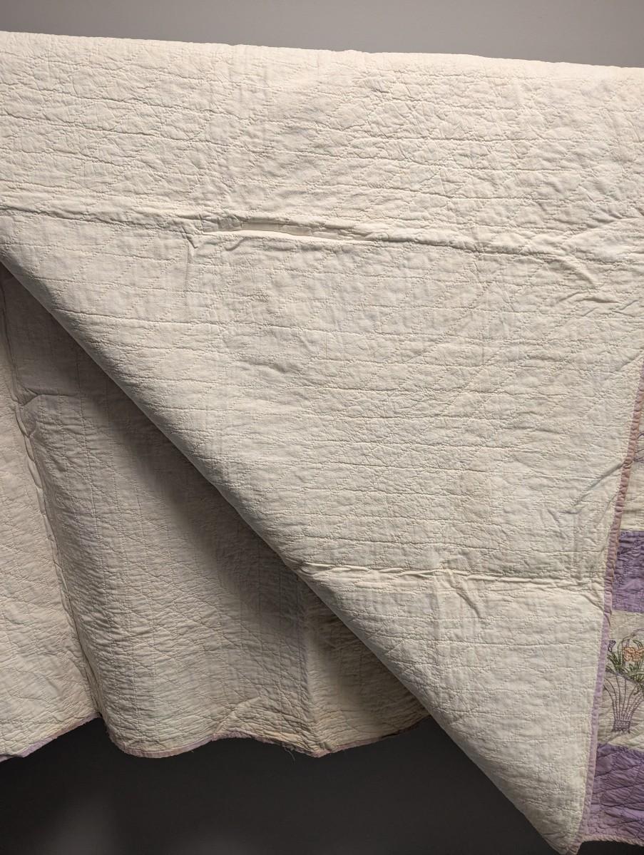 Lavender & White Patchwork Quilt With Embroidered Baskets Of Flowers 90 x 76 Inches #10