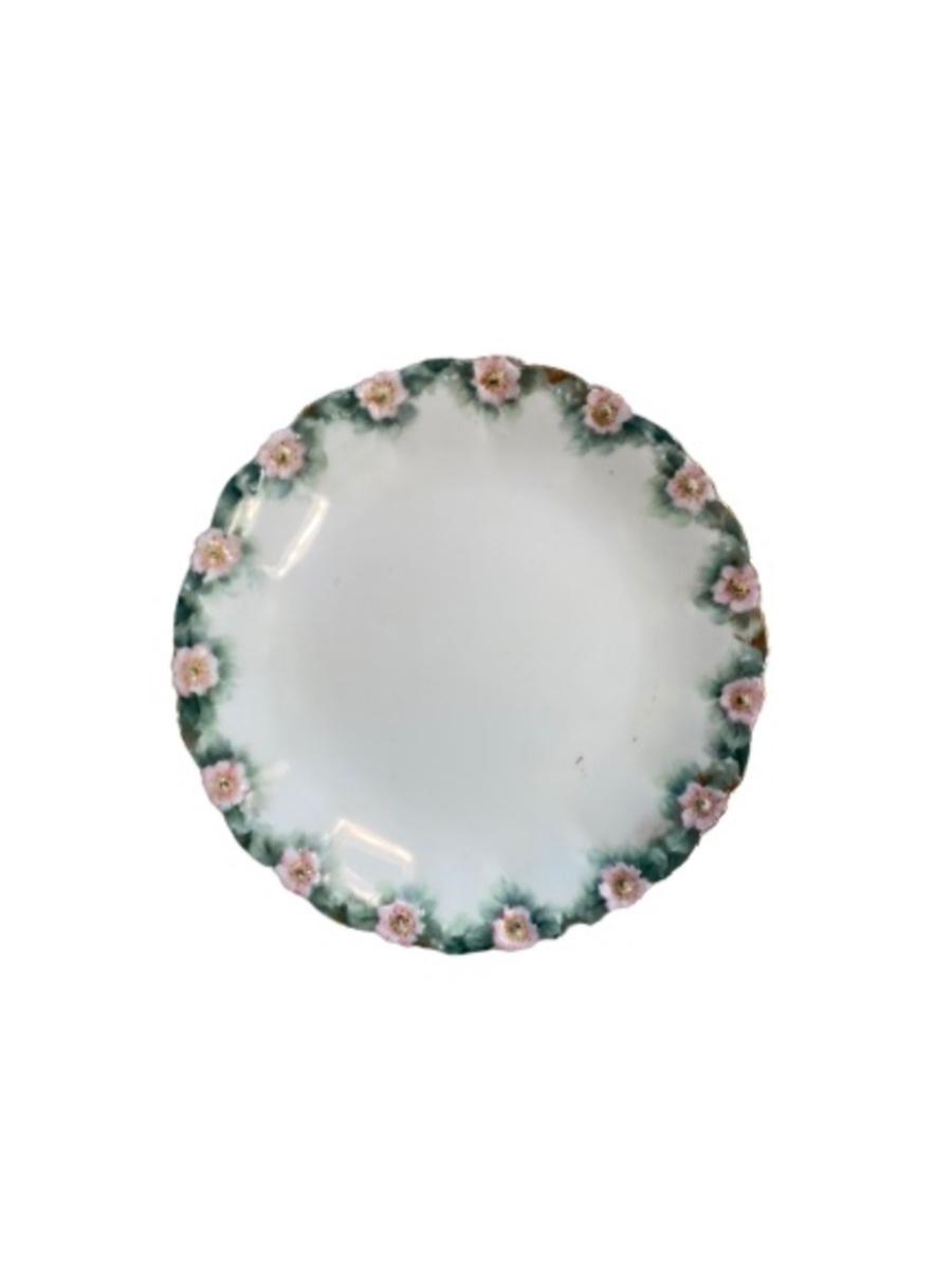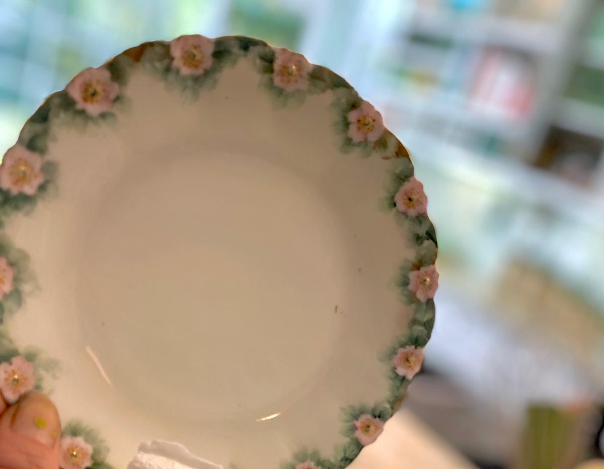 Impressive Laviolette Limoges small plates. These 5 first-class plates are from TheSquire Mansion in San Fransisco. Soft pink and green rims, with scalloped gold rims. They are brilliant, no chips or cracks, mint condition for historical China. 6" diameter
