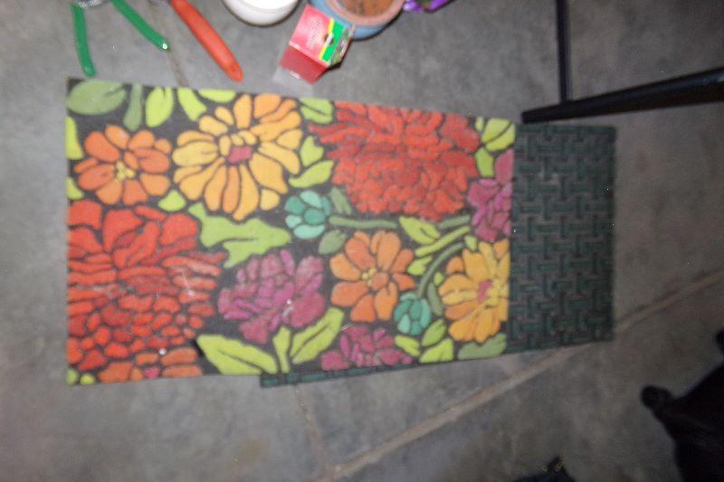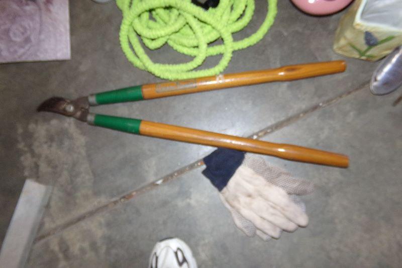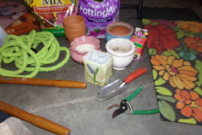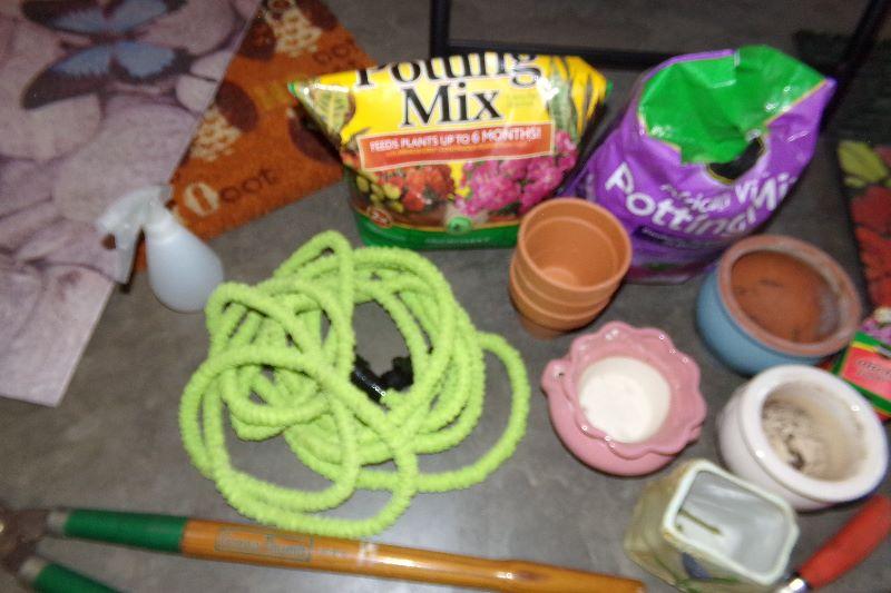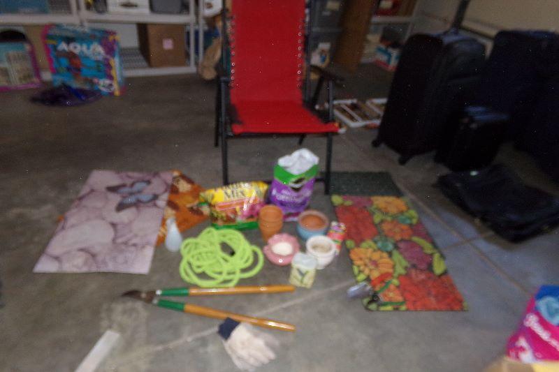 Flower pots, hose, lopers, folding chair, 4 outdoor thick doormats, and more