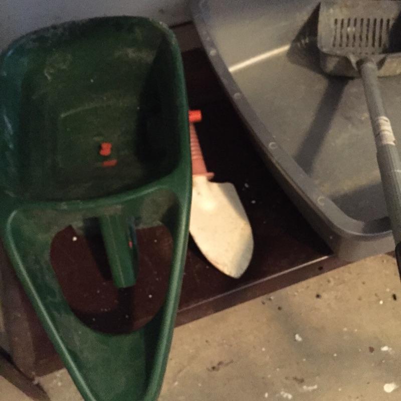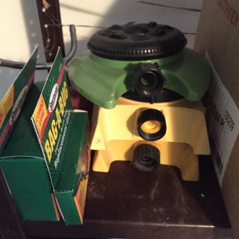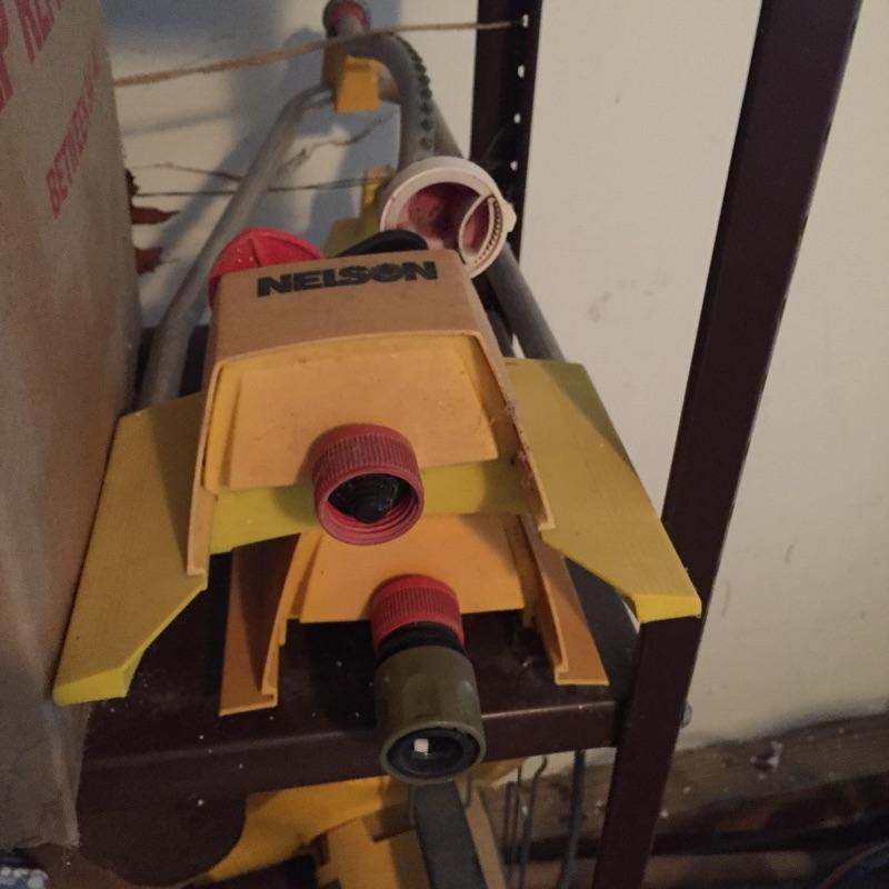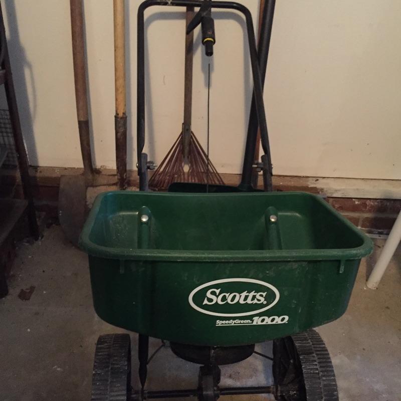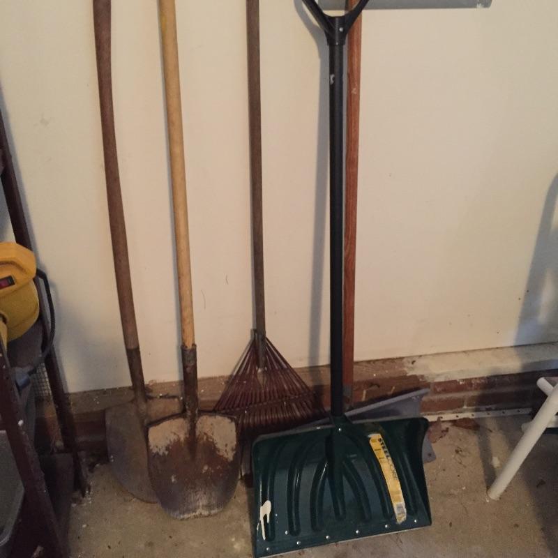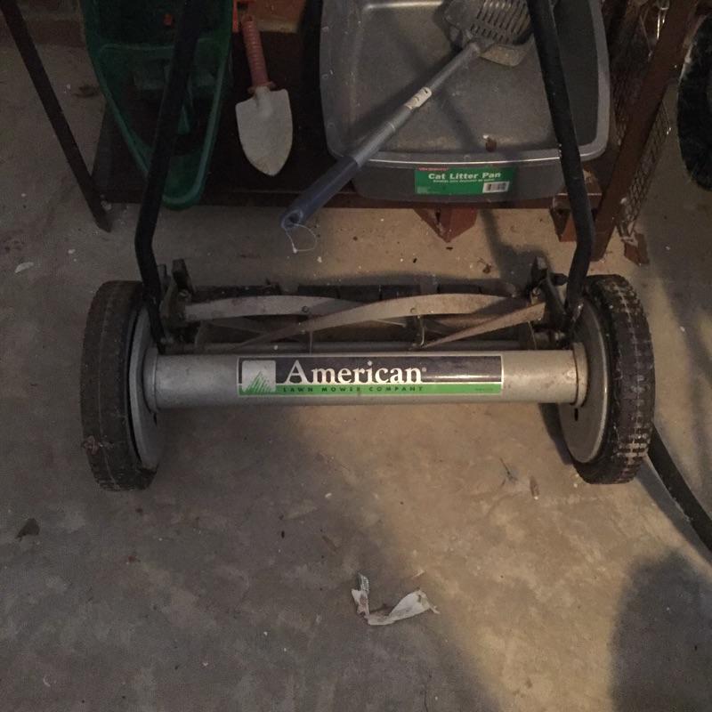 Assortment of lawn and garden tools including American reel push mower , sprinklers , shovels , Scott spreader , blower and more. Shelving not included.