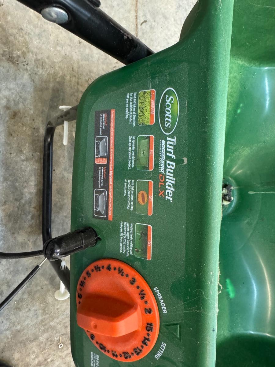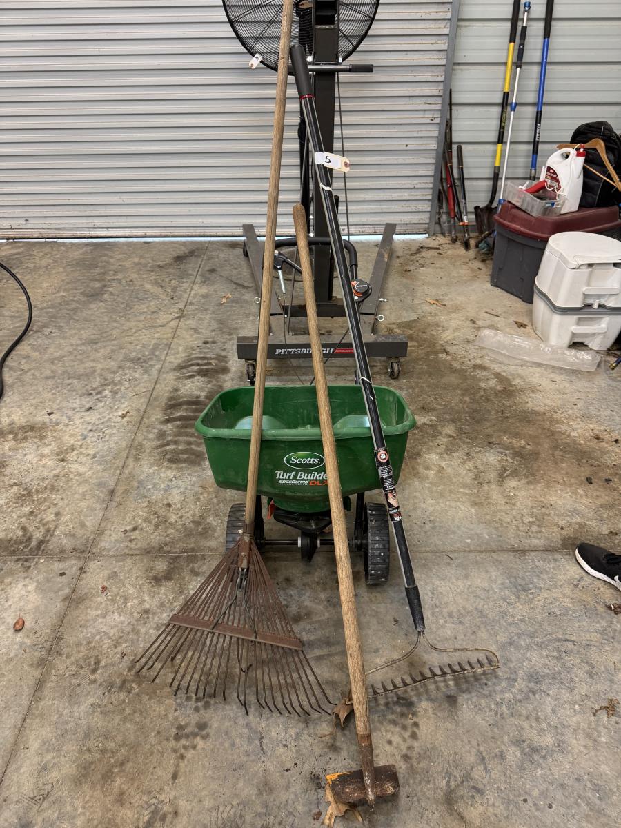 INCLUDES TURF BUILDER SCOTTS SPREADER, 2 RAKES, AND A HOE