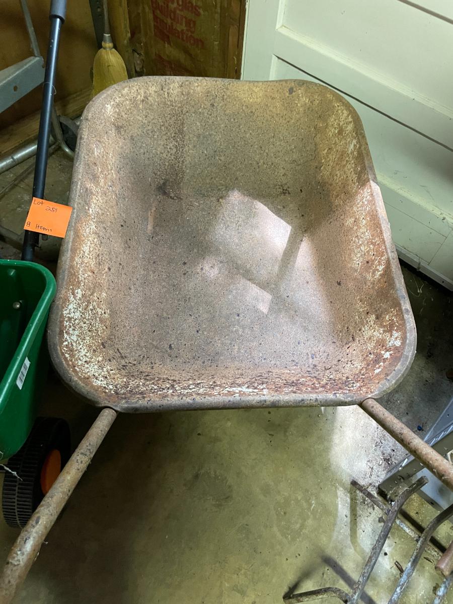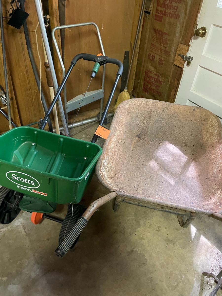 Lawn Care Lot includes wheel barrow, Scotts seed spreader, lawn décor, & dolly