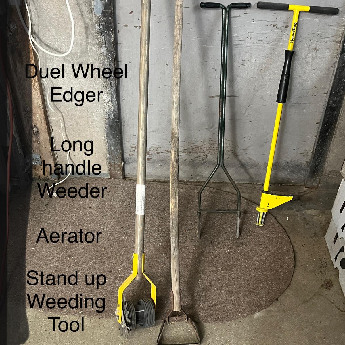 Includes dual-wheel edger, stand-up weeder, aerator, long handle.