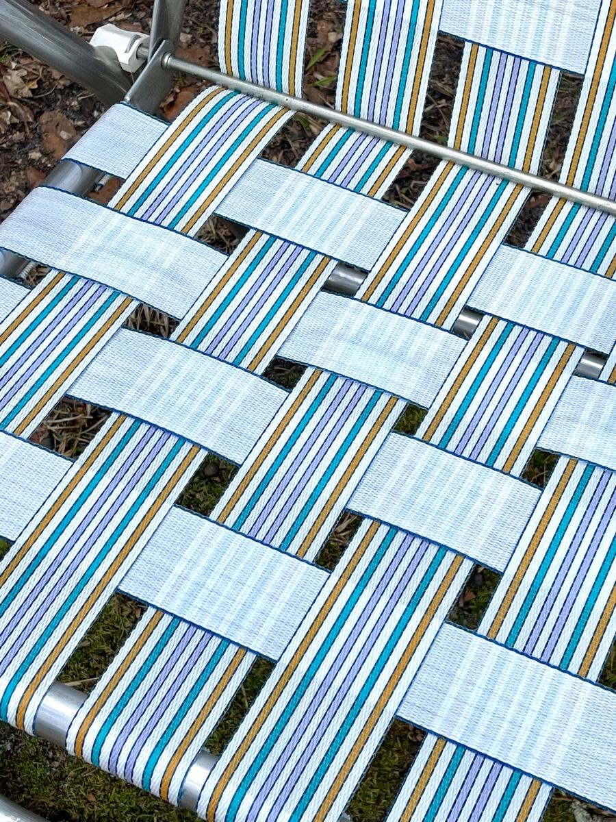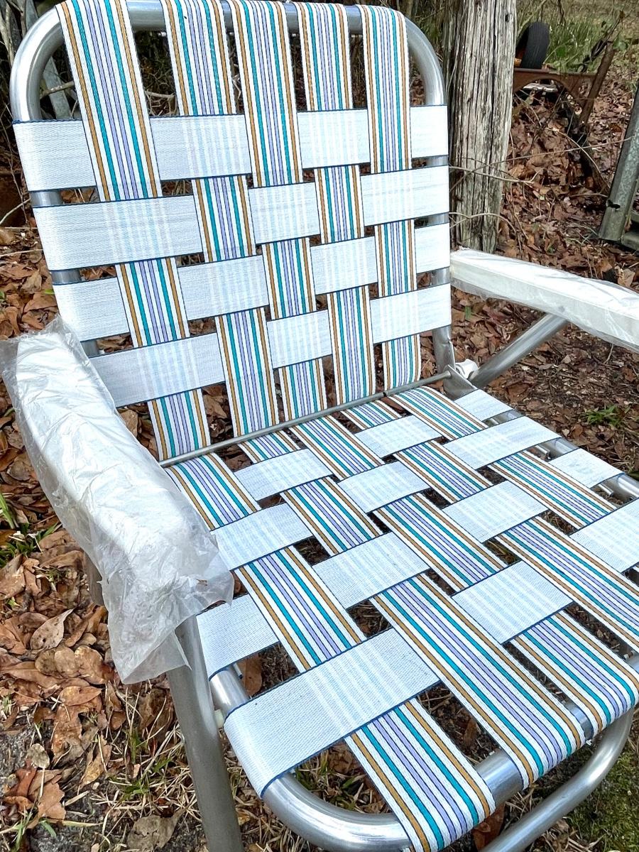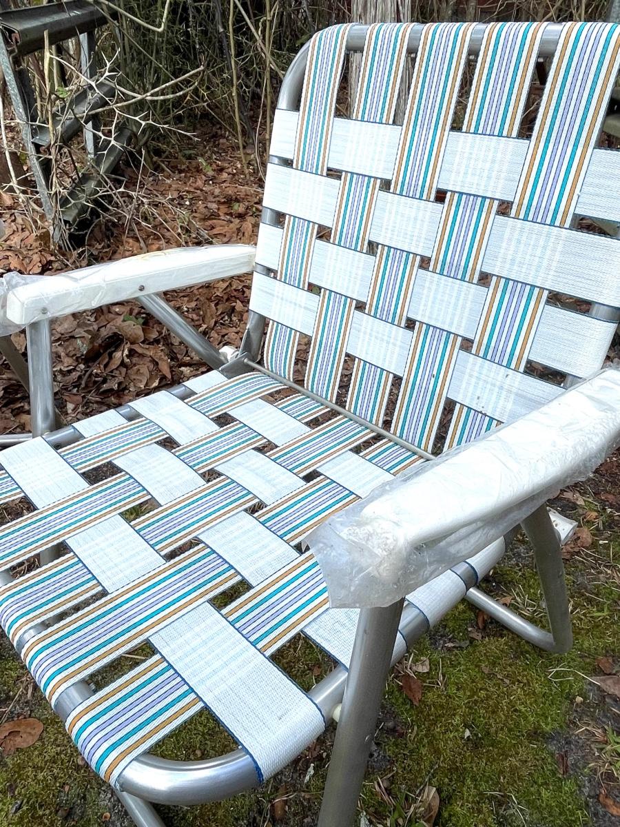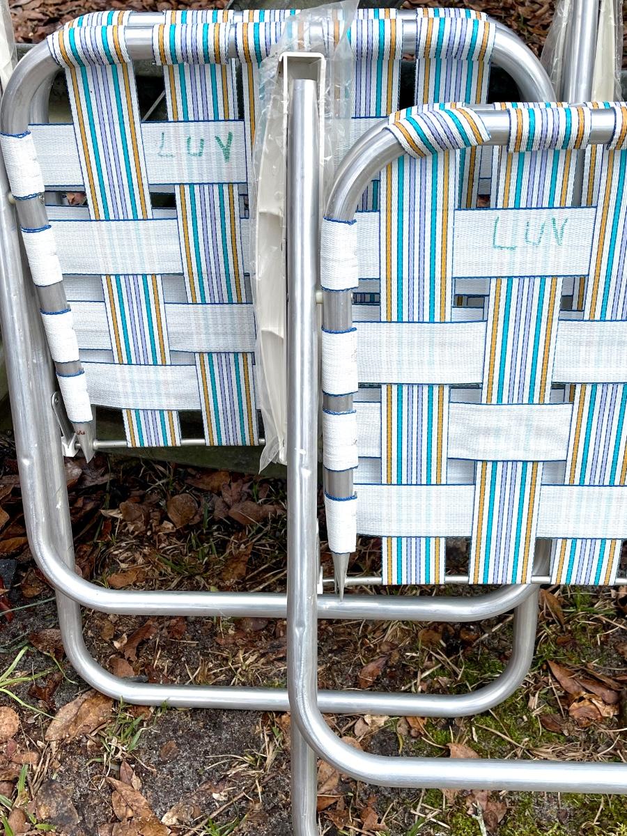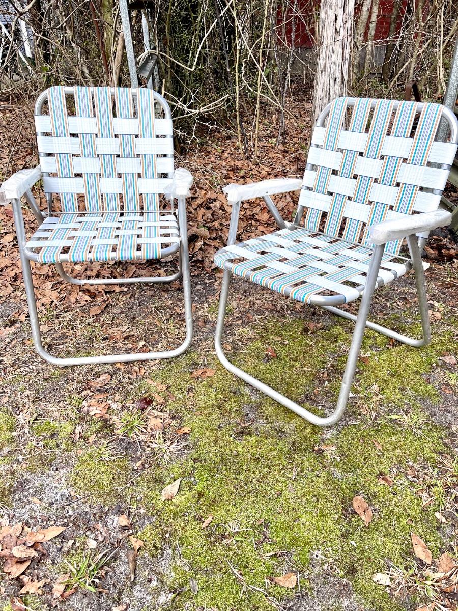 Nice pair of woven lawn chairs. Excellent condition. I don’t think they have ever been used. There is writing on the bottoms. Possibly name or initials. Great for the beach!