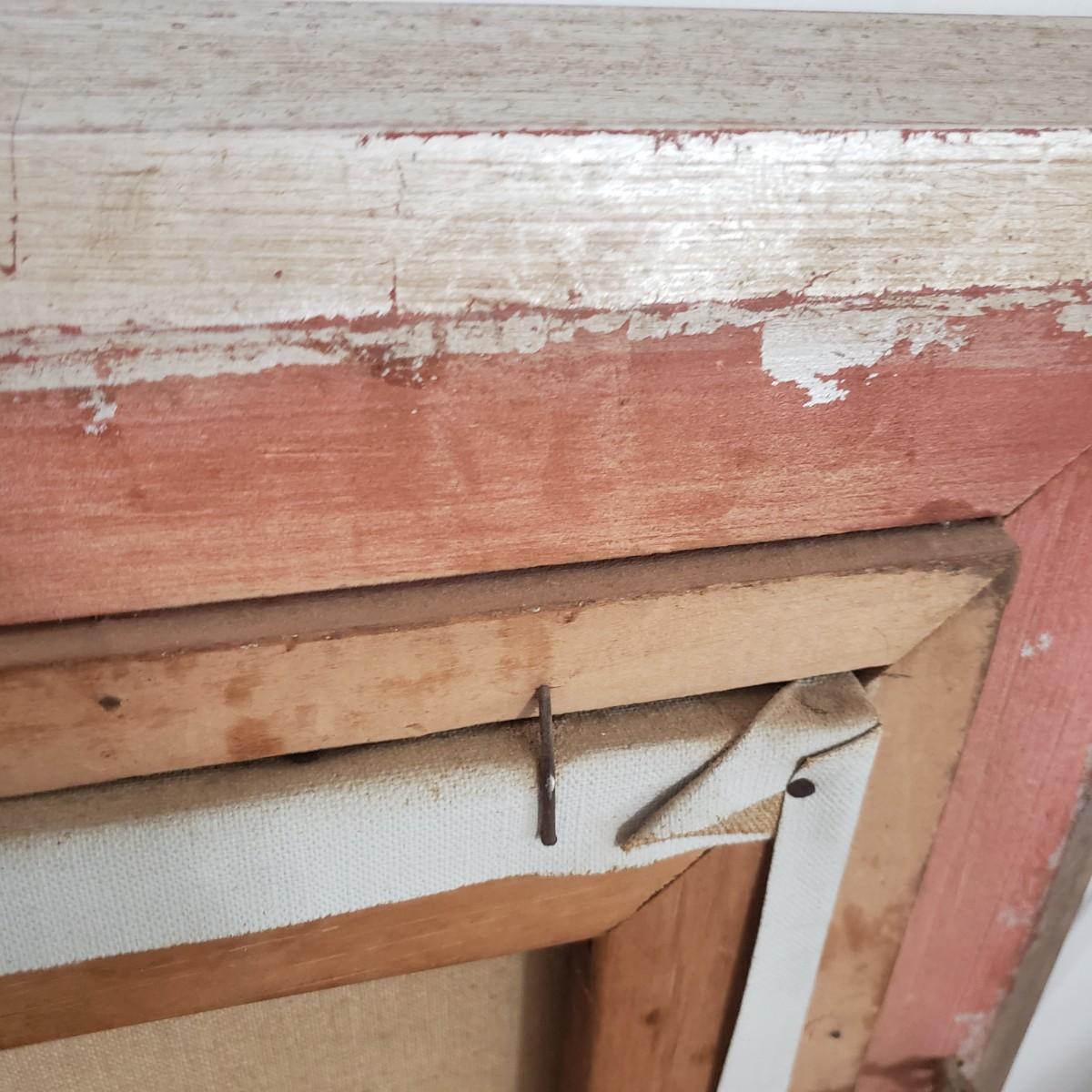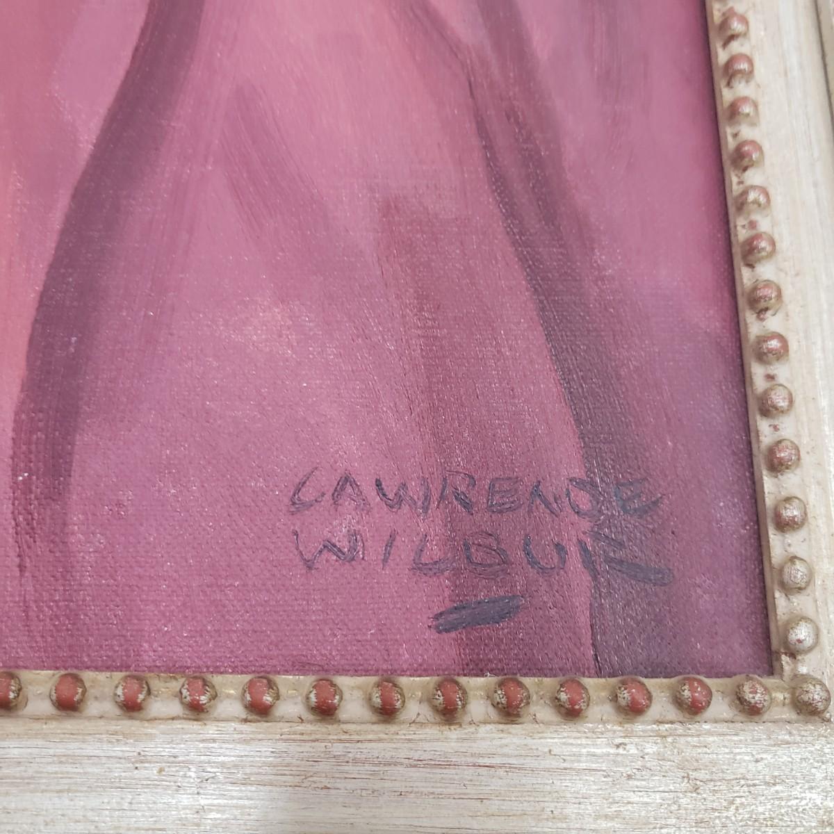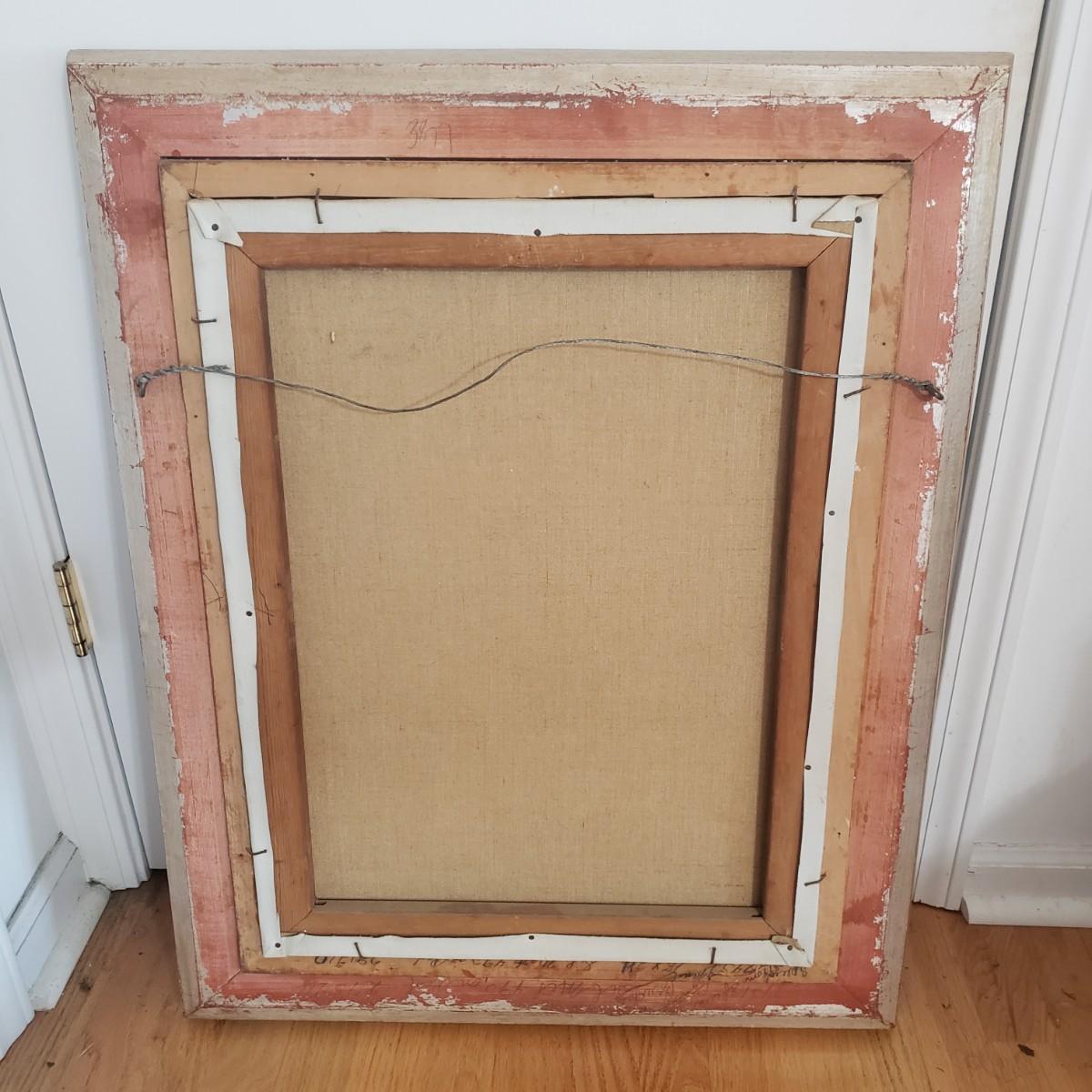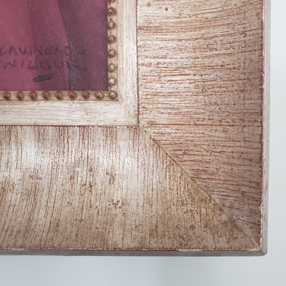 This Lawrence Wilbur appears to be an oil painting. The frame is painted with a silver tone with a reddish hue popping through. There are some paint chips on the woman's shirt, see pictures. The wood frame is not covered with glass and measures 25" x 32"H.