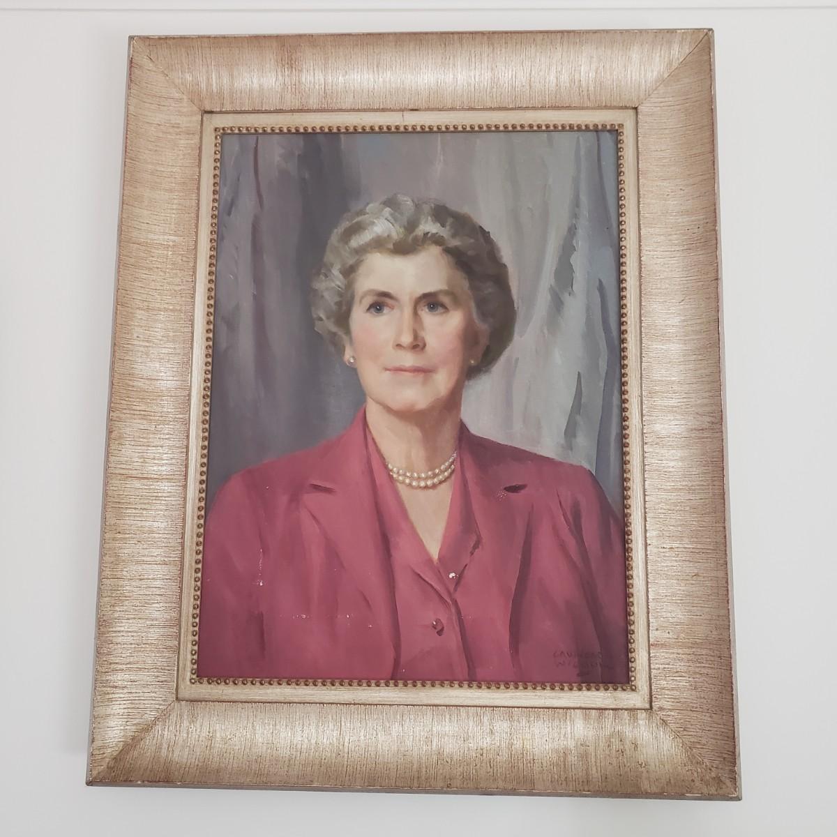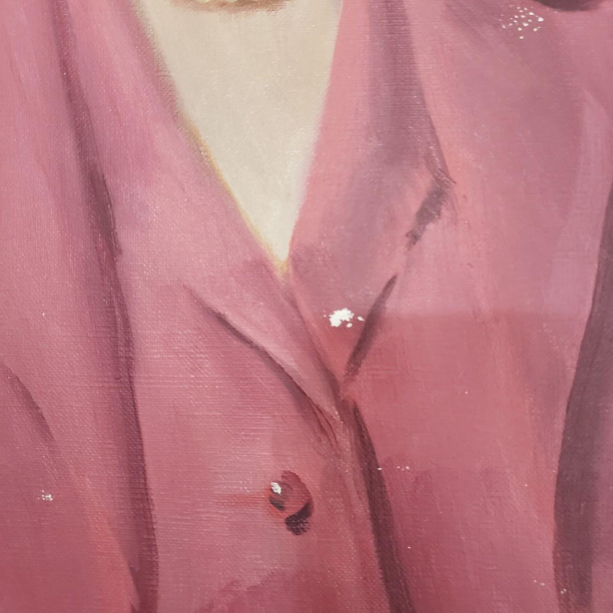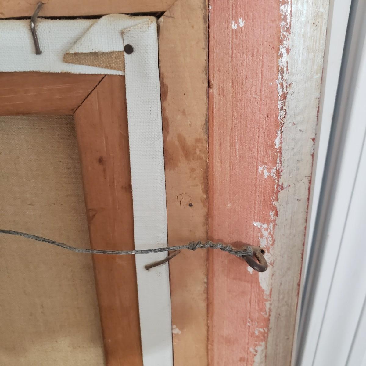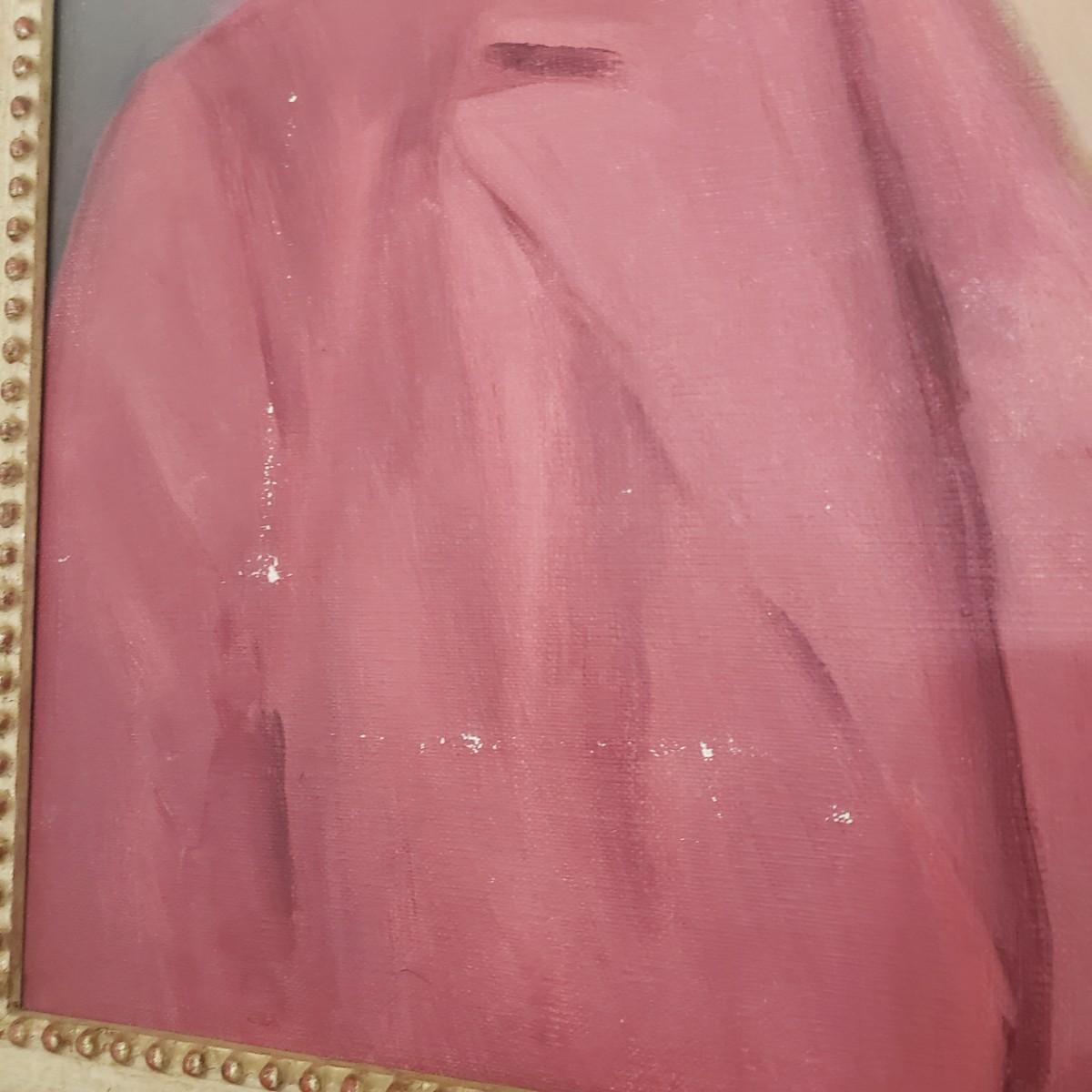This Lawrence Wilbur appears to be an oil painting. The frame is painted with a silver tone with a reddish hue popping through. There are some paint chips on the woman's shirt, see pictures. The wood frame is not covered with glass and measures 25" x 32"H.