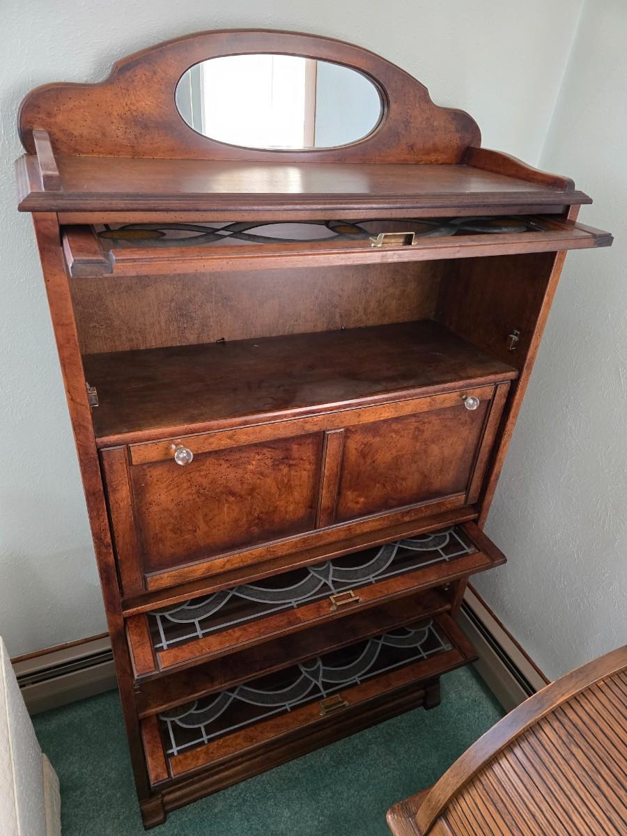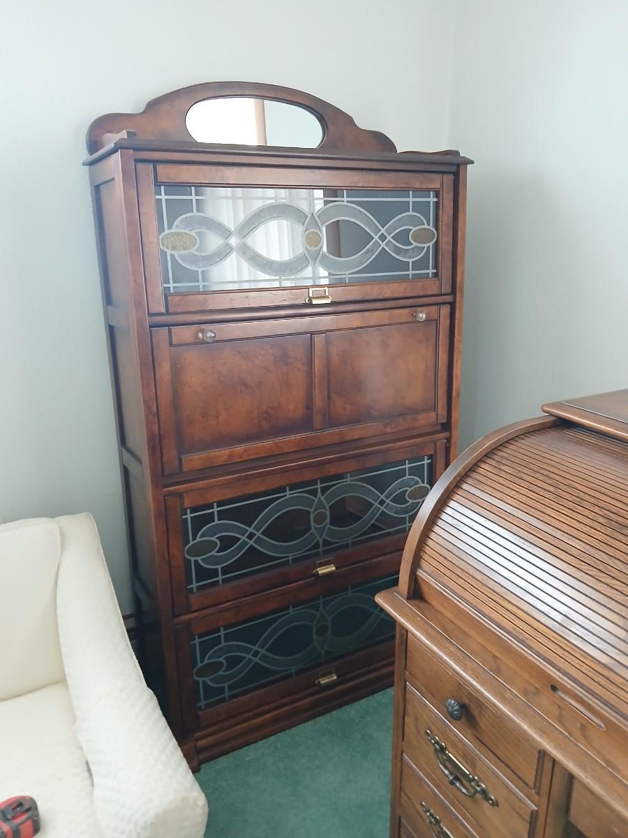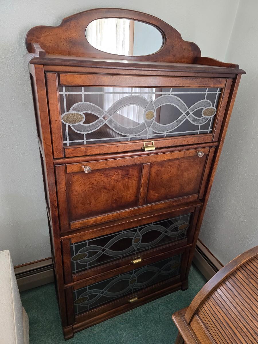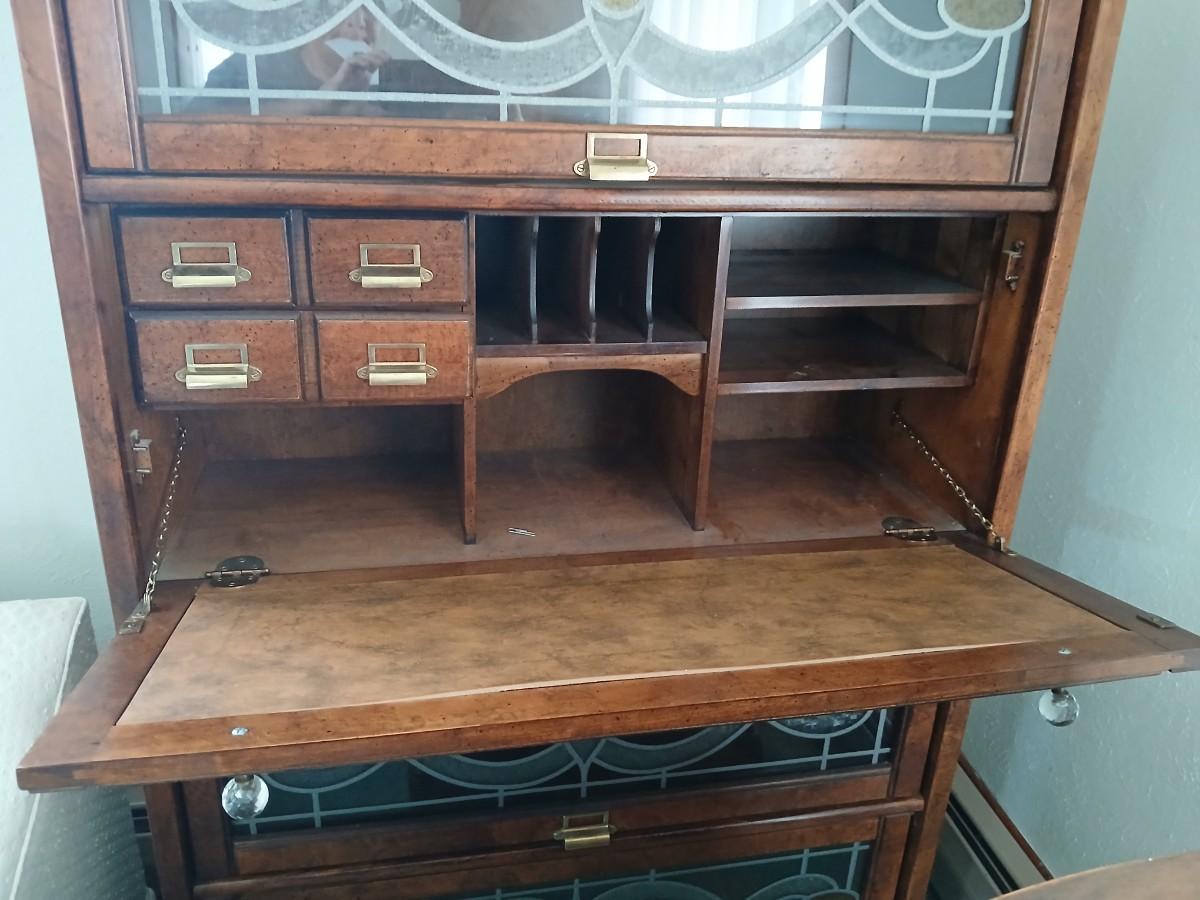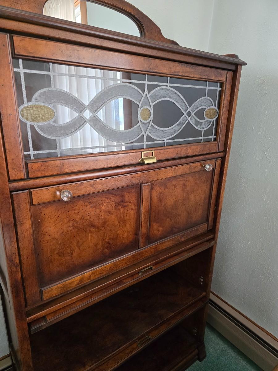 Barrister bookcase and secretary desk / bureau combination with intricate leaded stained-glass doors waterglass pattern