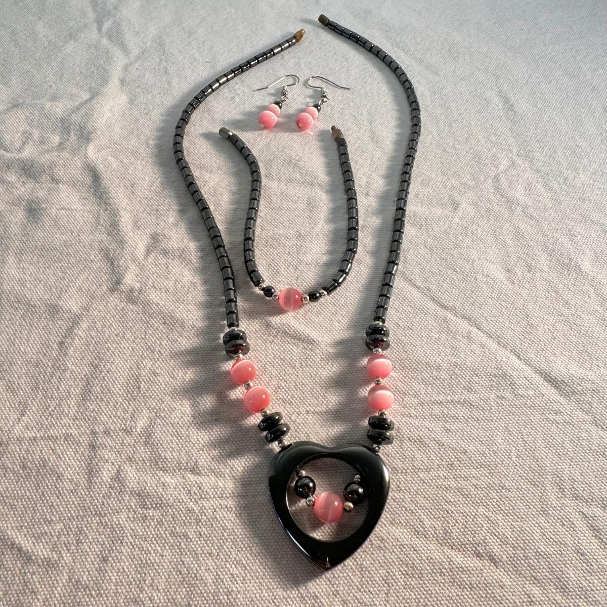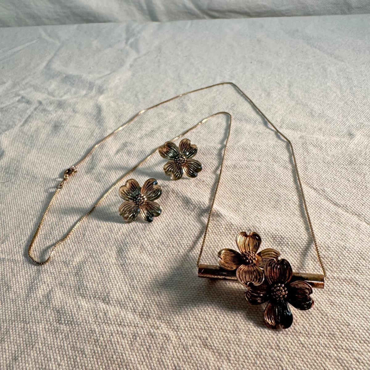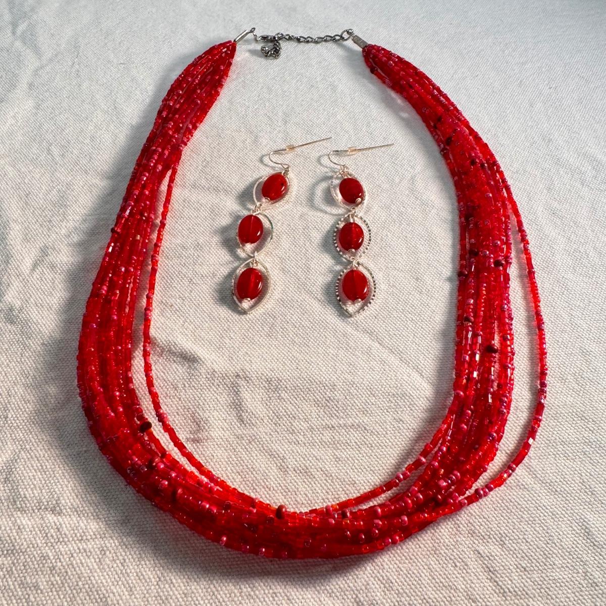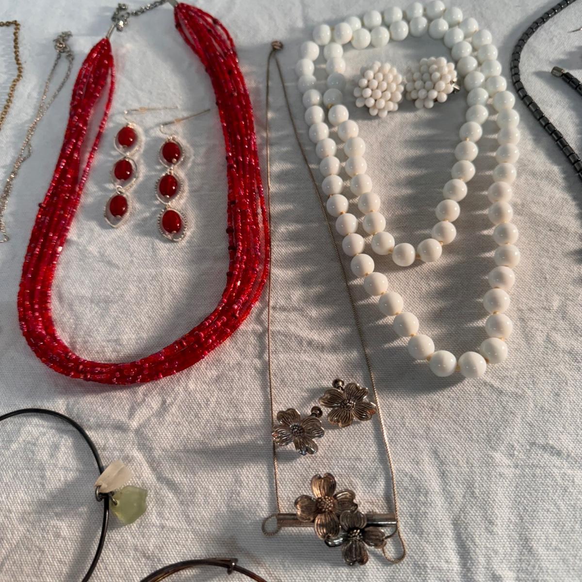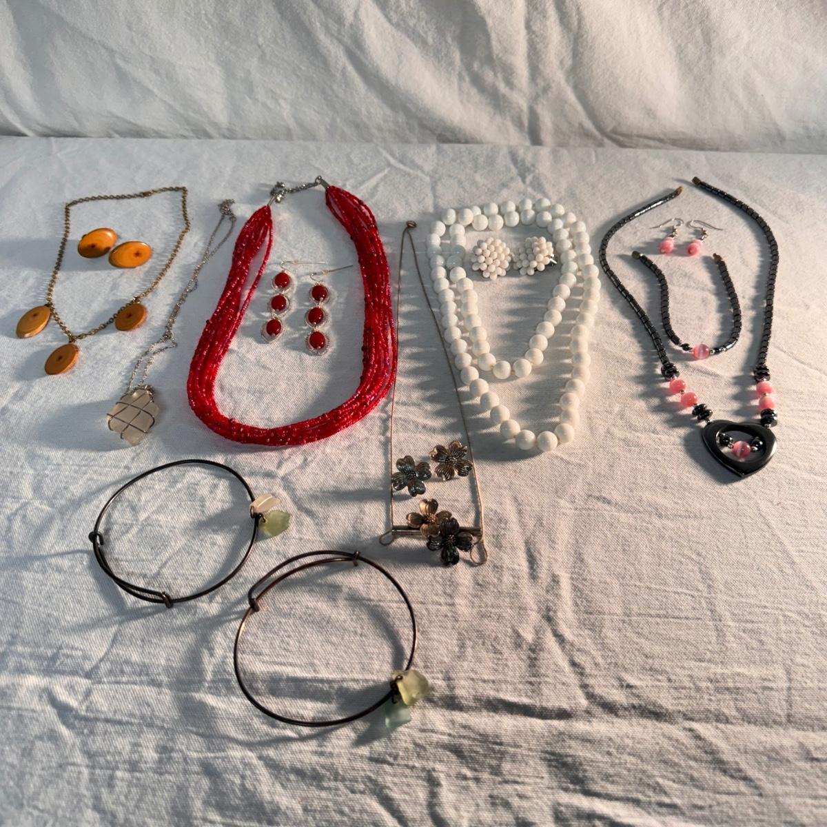 This lot includes six necklaces, five pairs of earrings, and three bracelets, a few of which are matching sets (see photos). The longest necklace when fully opened is the red one that measures 22”L. The necklace and matching earrings with dogwood flowers are 'Beau Sterling'. The two matching bracelets have a couple pieces of sea glass attached to them.