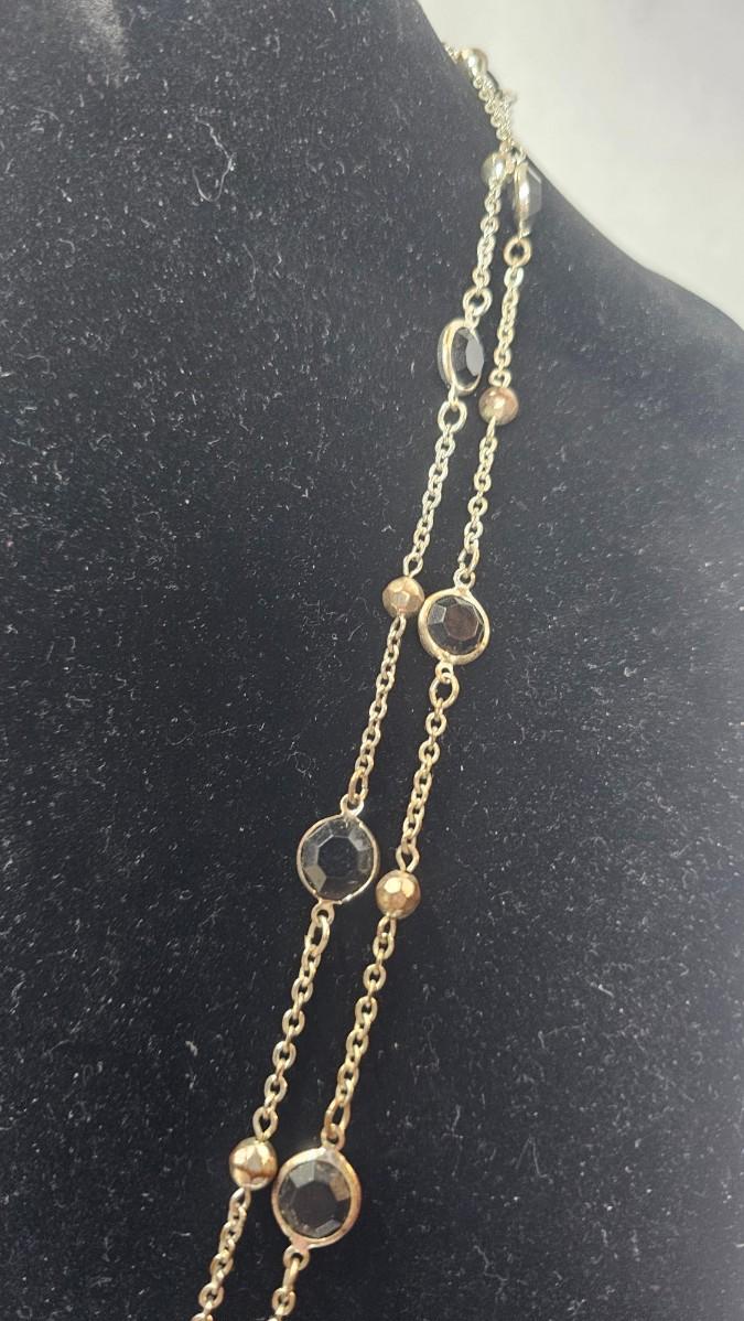 This elegant layered necklace features dual gold-tone chains adorned with evenly spaced faceted black stones and subtle round accent beads. The alternating textures and tones create visual depth while maintaining a refined, balanced silhouette that drapes beautifully at the neckline.