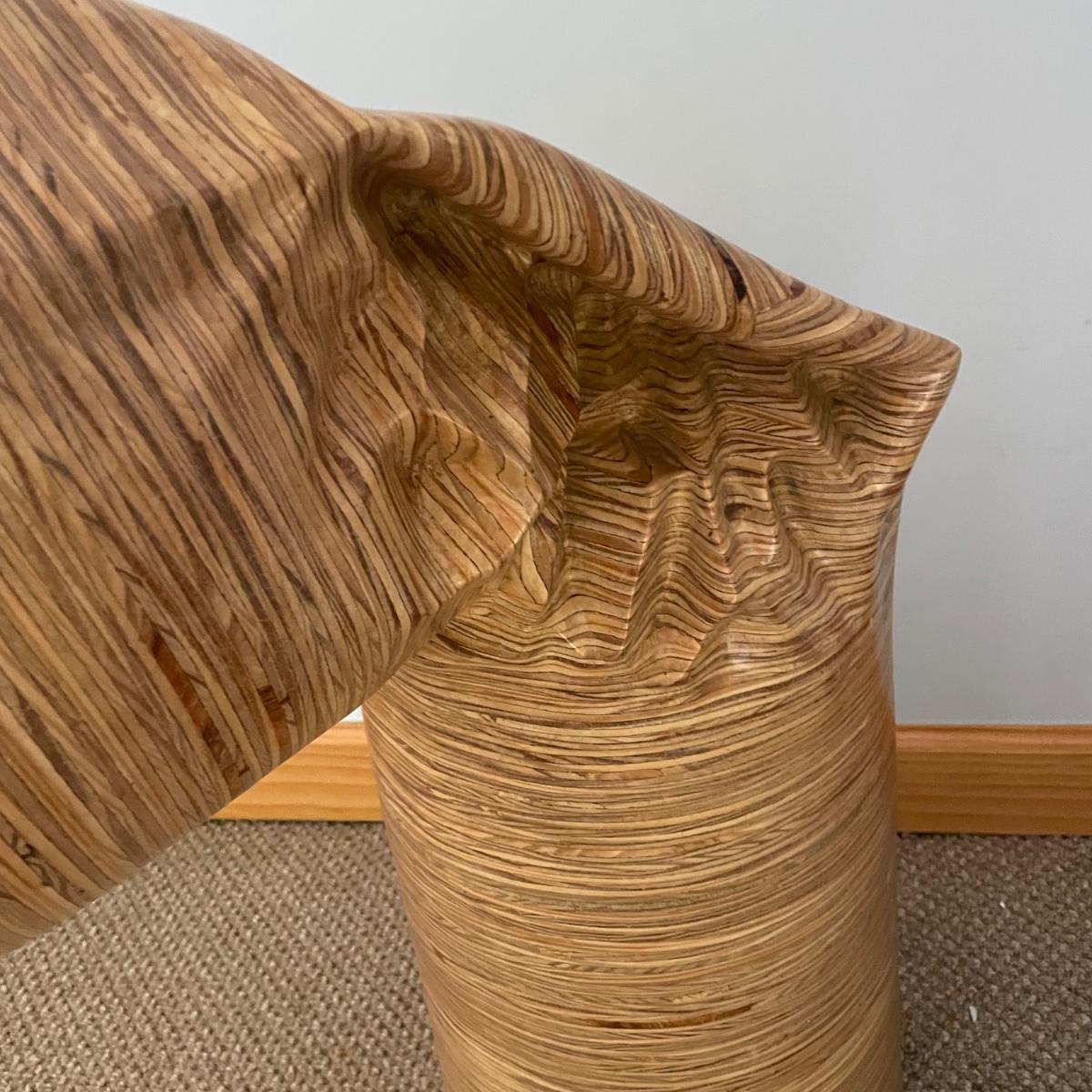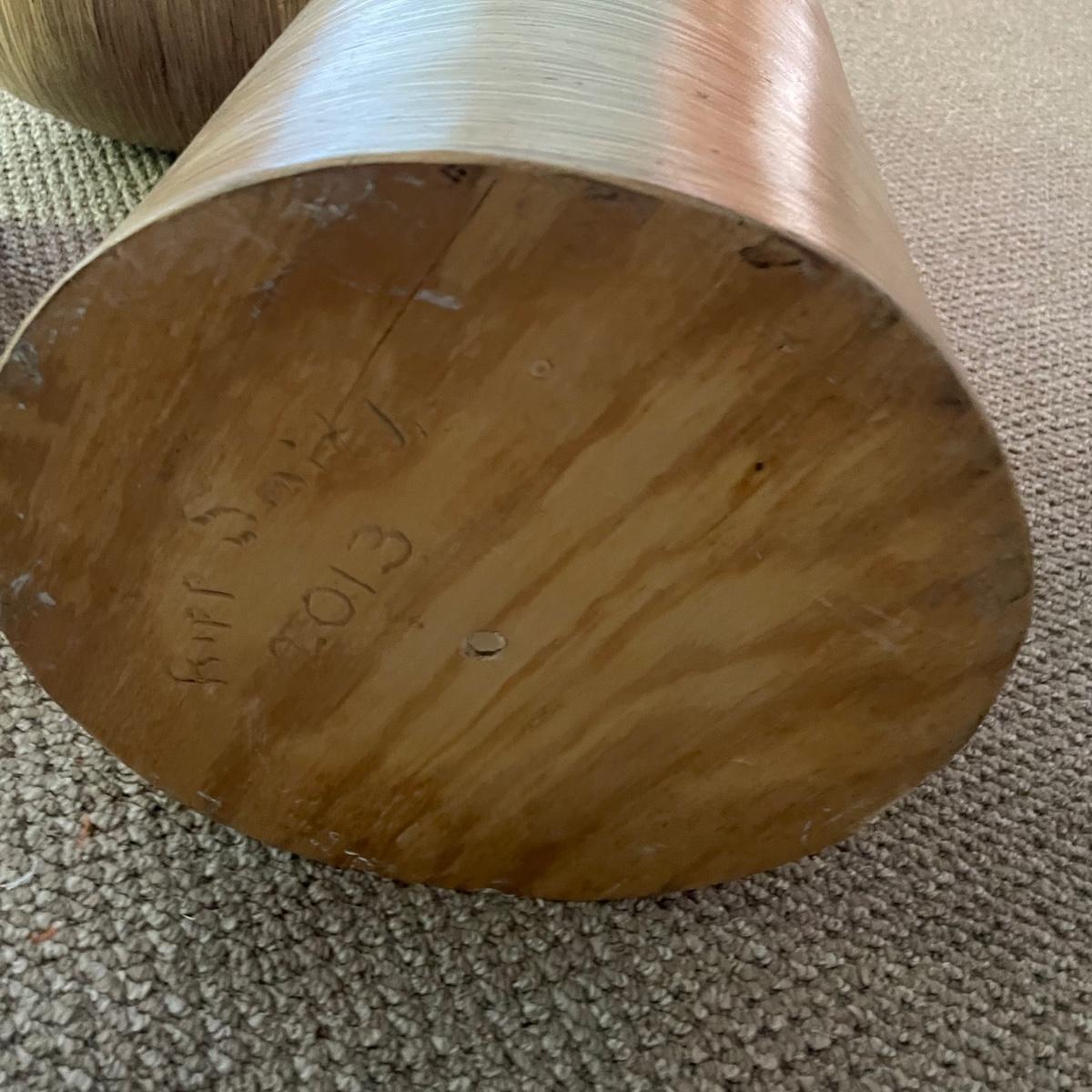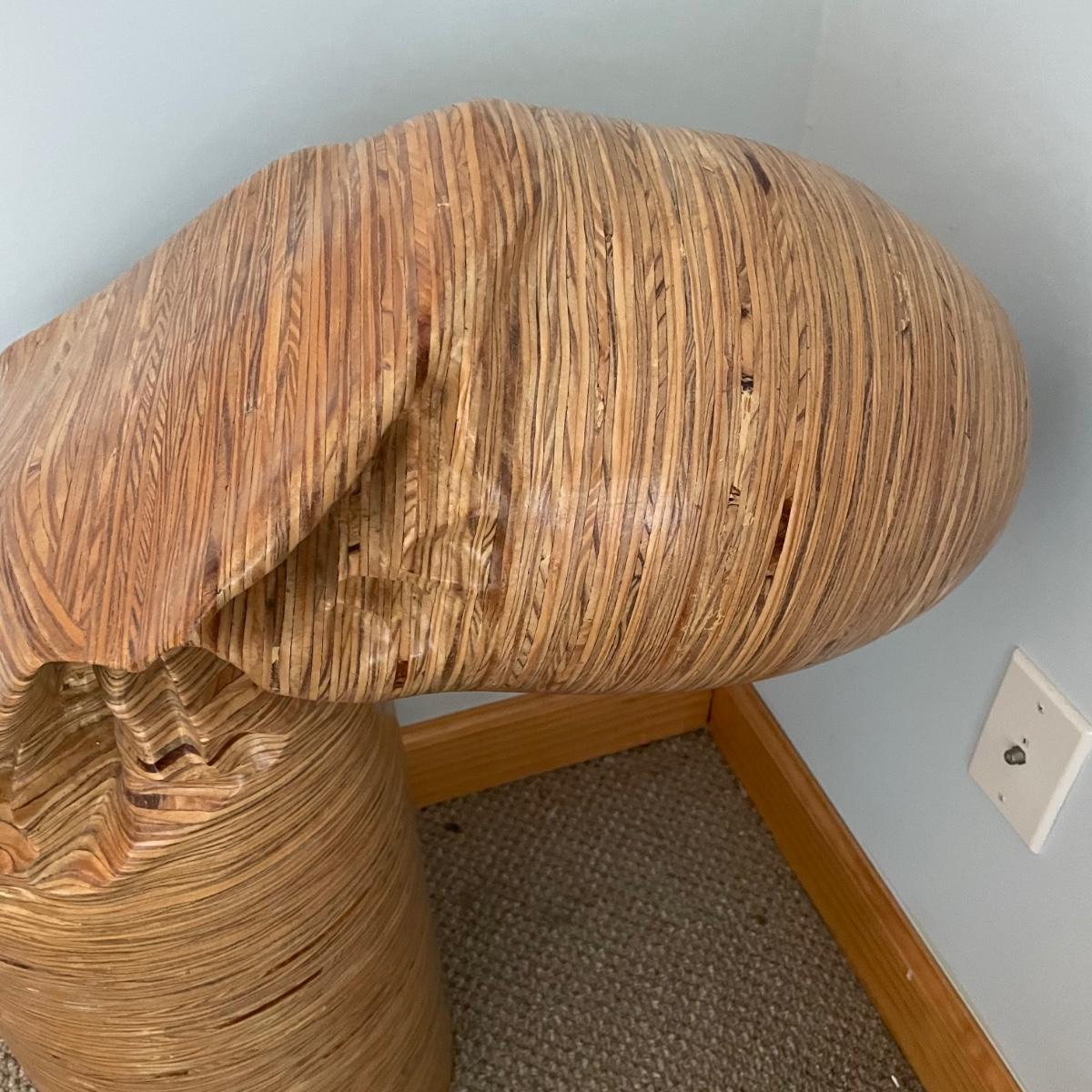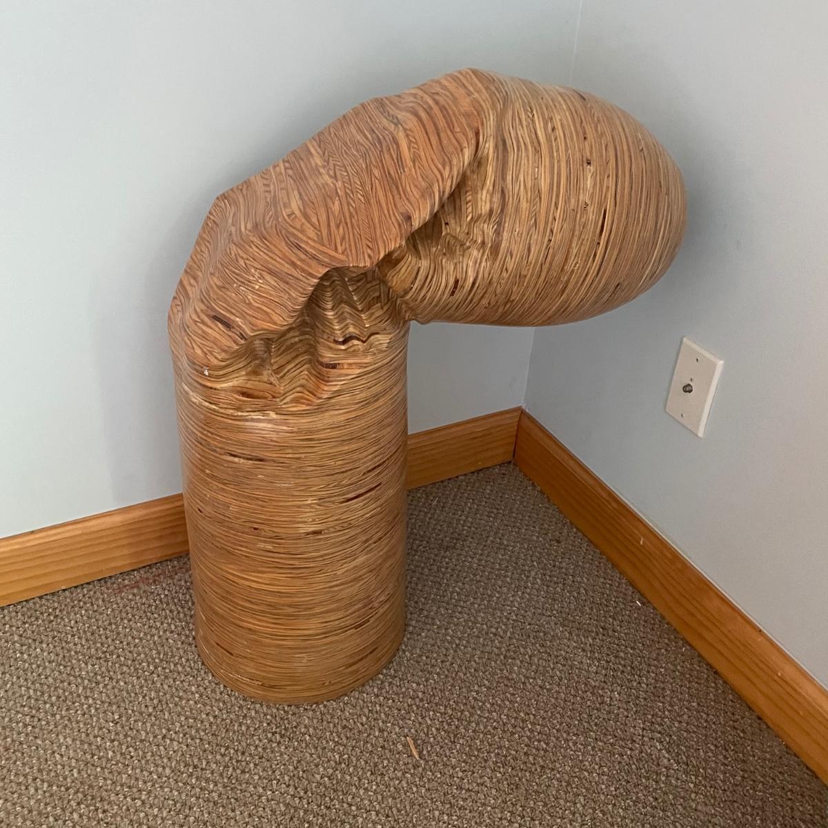 This extremely unique sculpture is made up of hundreds of rings of wood attached together. The lower half is solid wood whereas the top section is hollow; this piece is quite heavy.