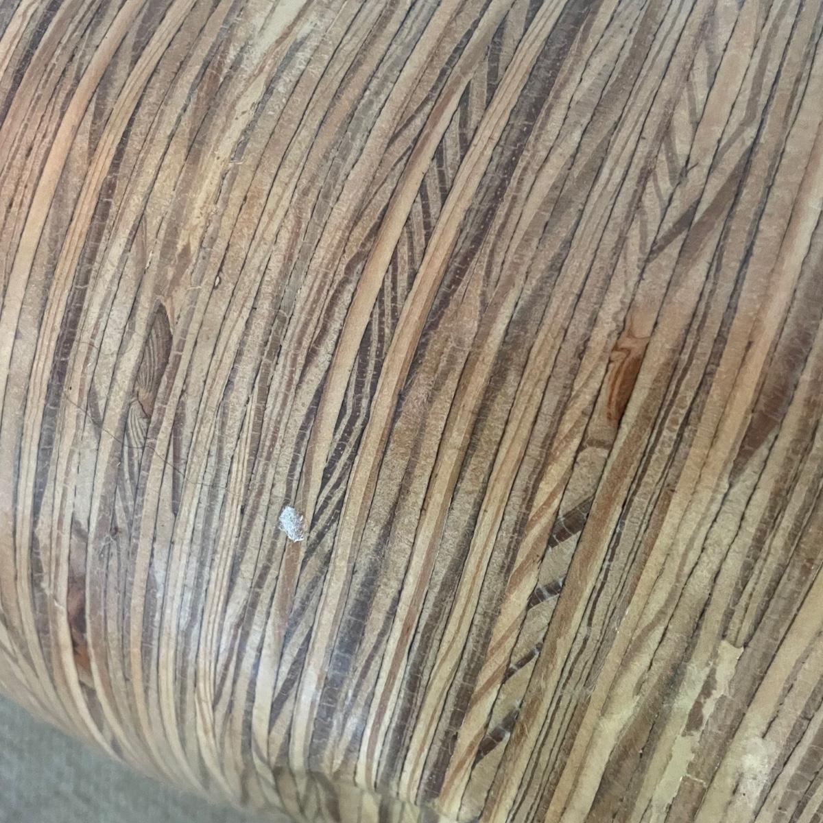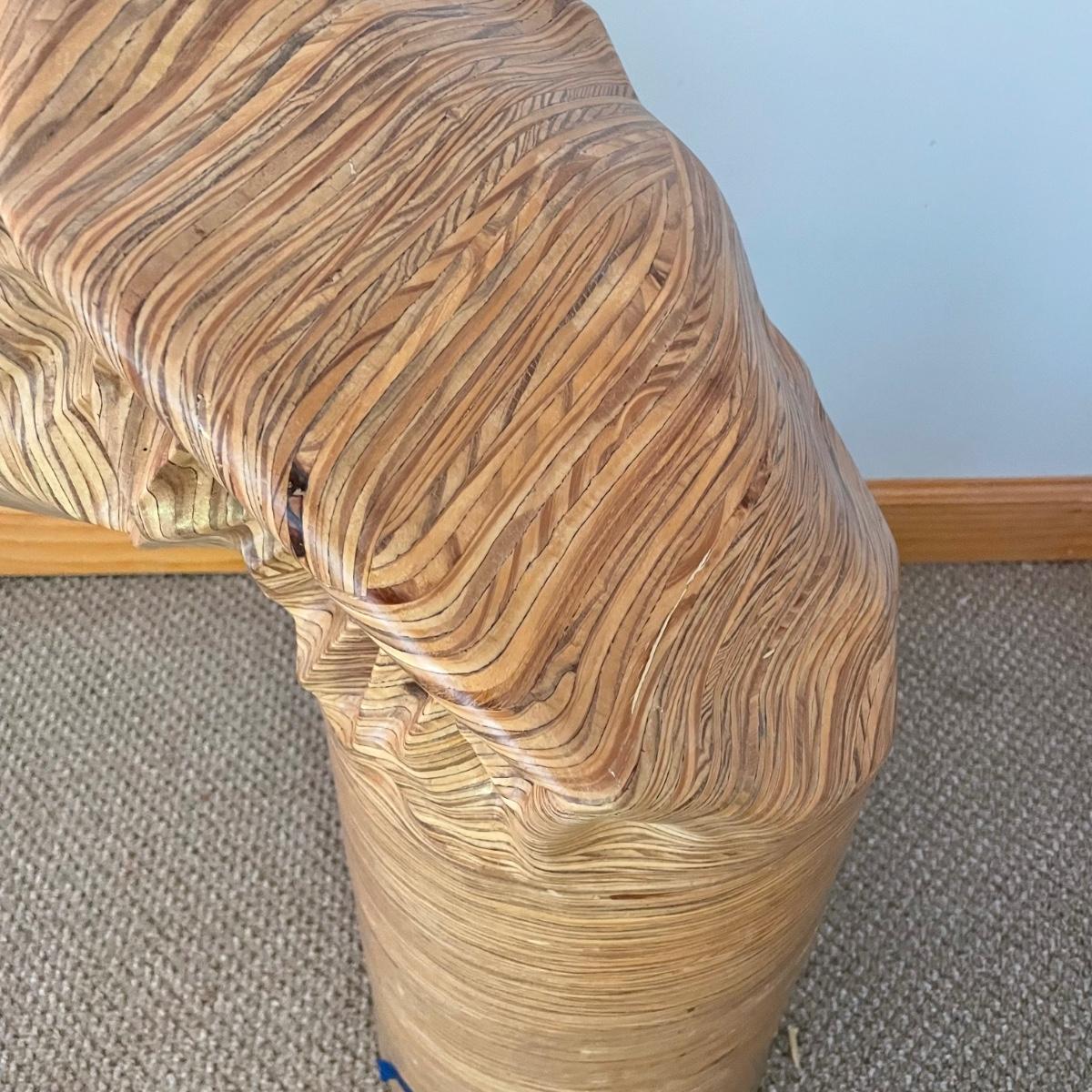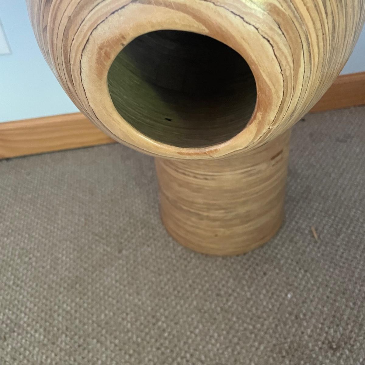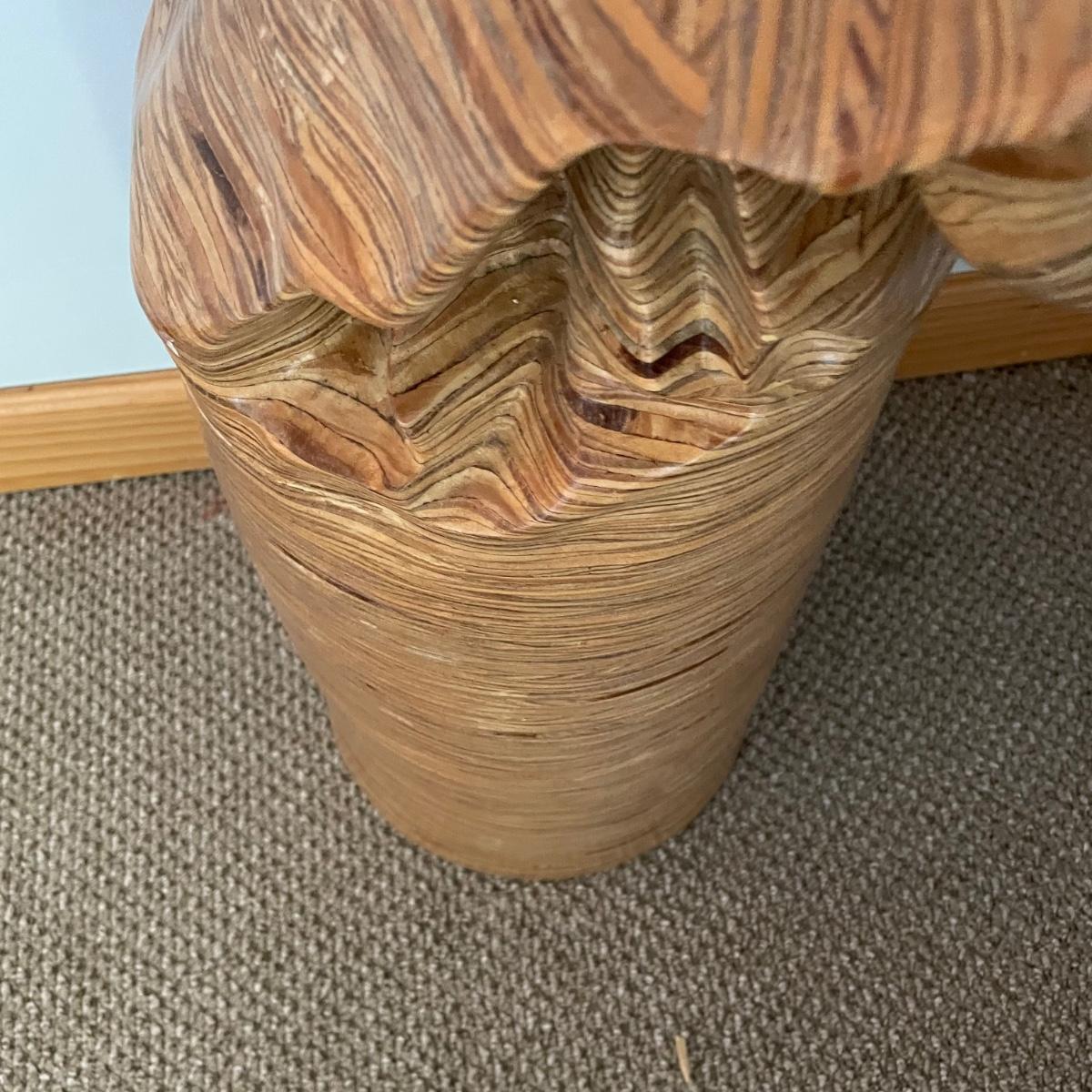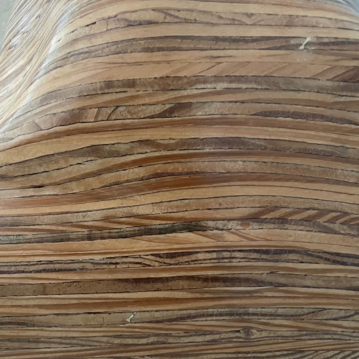 This extremely unique sculpture is made up of hundreds of rings of wood attached together. The lower half is solid wood whereas the top section is hollow; this piece is quite heavy.