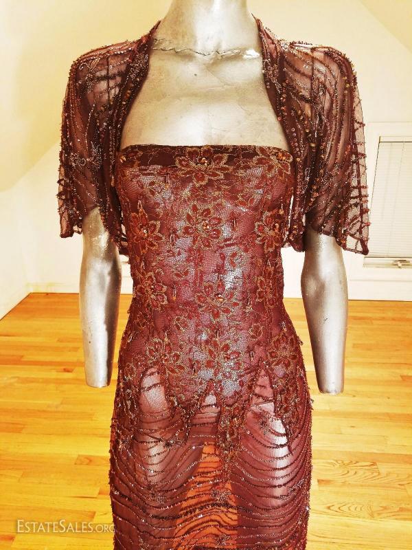 An original beauty of an ensemble Bias maxi layering dress with open bolero fully hand beaded on tulle dress and bolero with gold lame'bodice. It is exquisite. in very good vintage condition except for some pinholes on the bottom of the back train that are hardly noticeable.