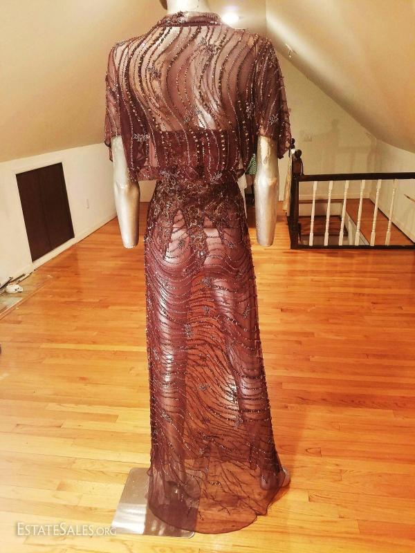 An original beauty of an ensemble Bias maxi layering dress with open bolero fully hand beaded on tulle dress and bolero with gold lame'bodice. It is exquisite. in very good vintage condition except for some pinholes on the bottom of the back train that are hardly noticeable.